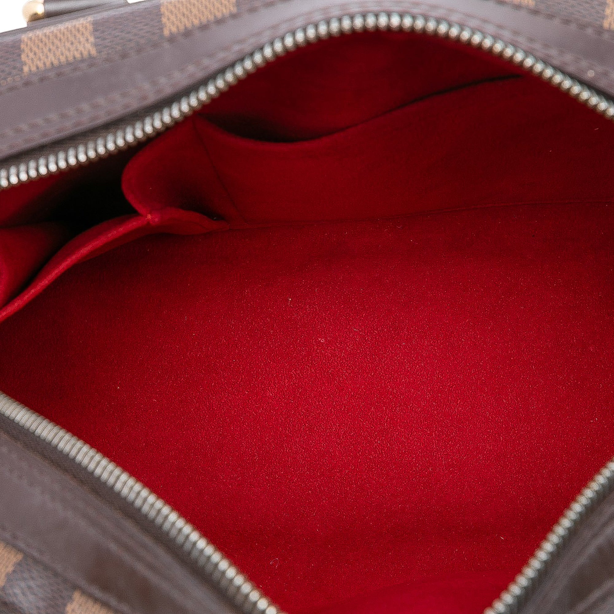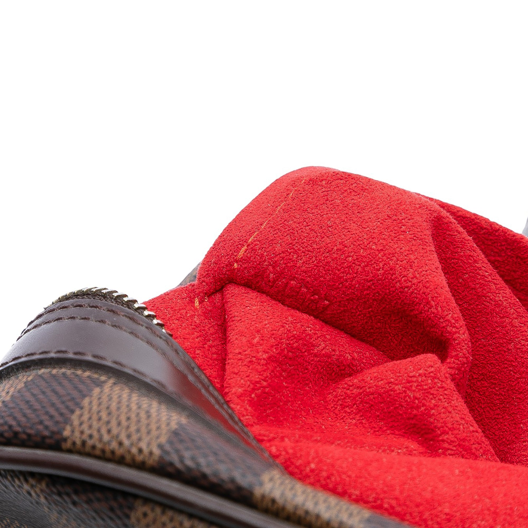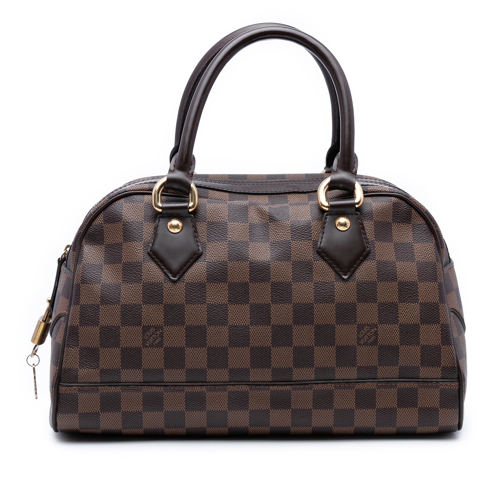 The Duomo features a damier ebene canvas body with leather trim, rolled leather handles, a clochette, a top zip closure, and interior slip pockets. Retail Price: 1750.00