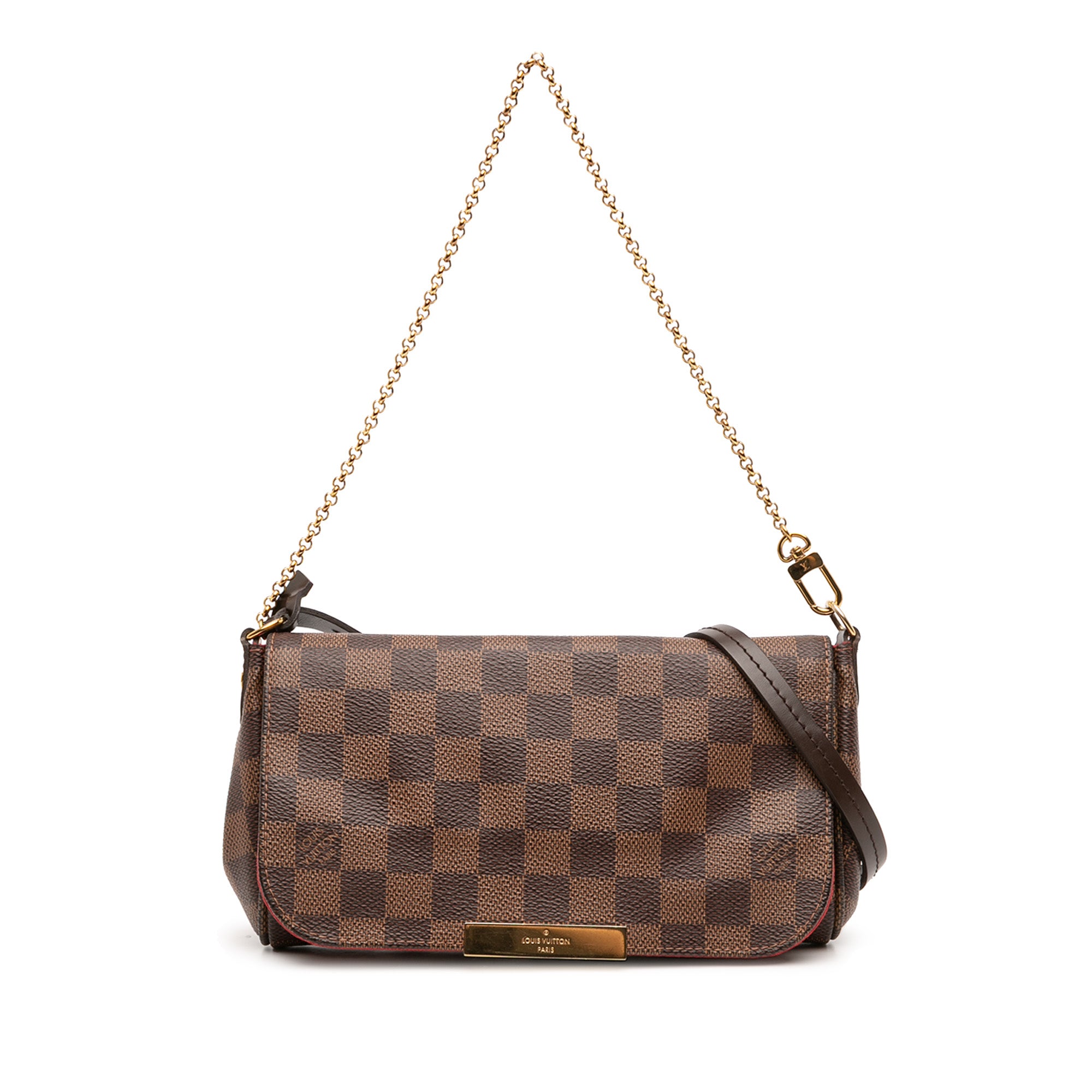 The Favorite PM features a damier ebene canvas body, a chain link strap, a detachable flat strap, a front flap with magnetic snap closure, and an interior slip pocket. Inclusion: Dust bag. Retail Price: 1080.00