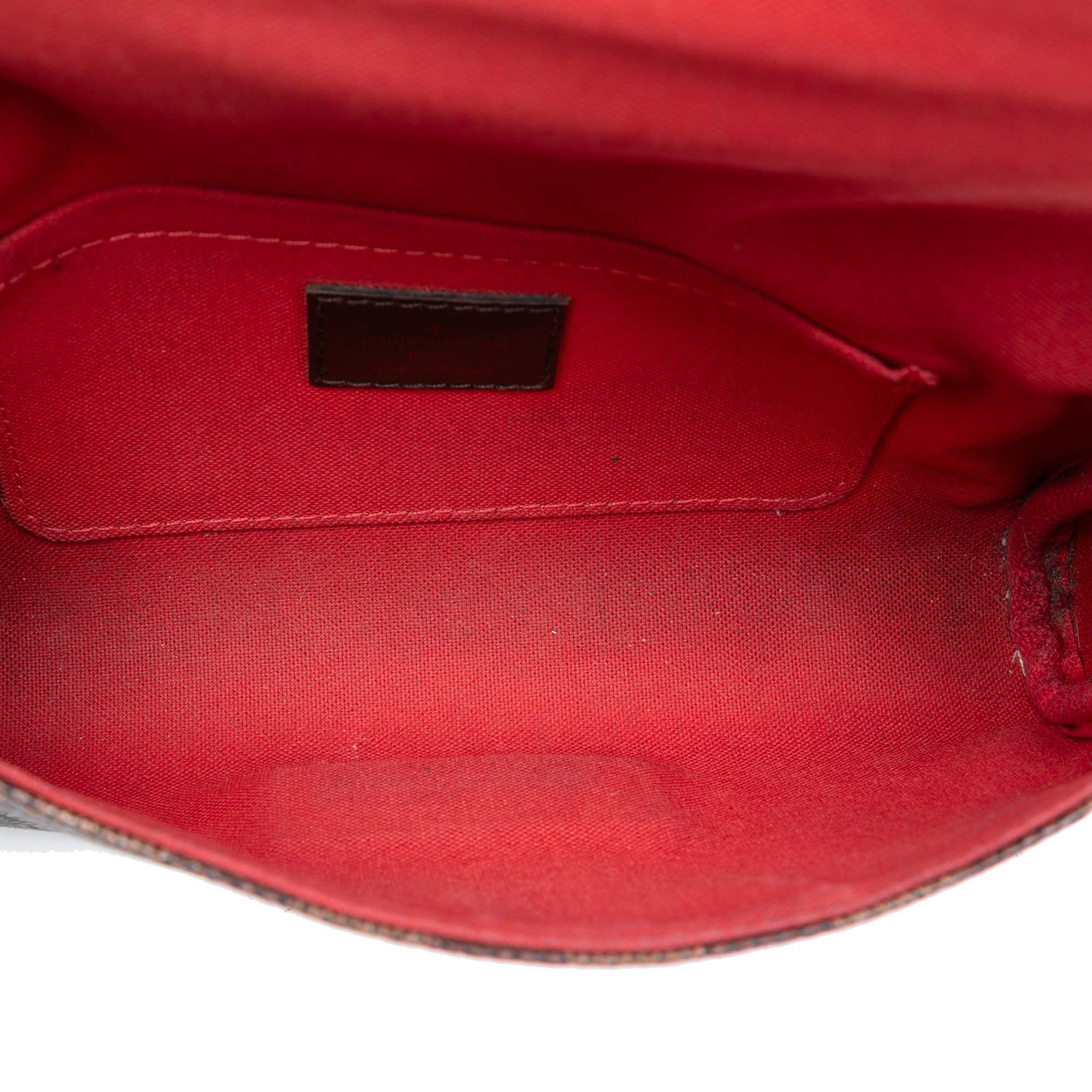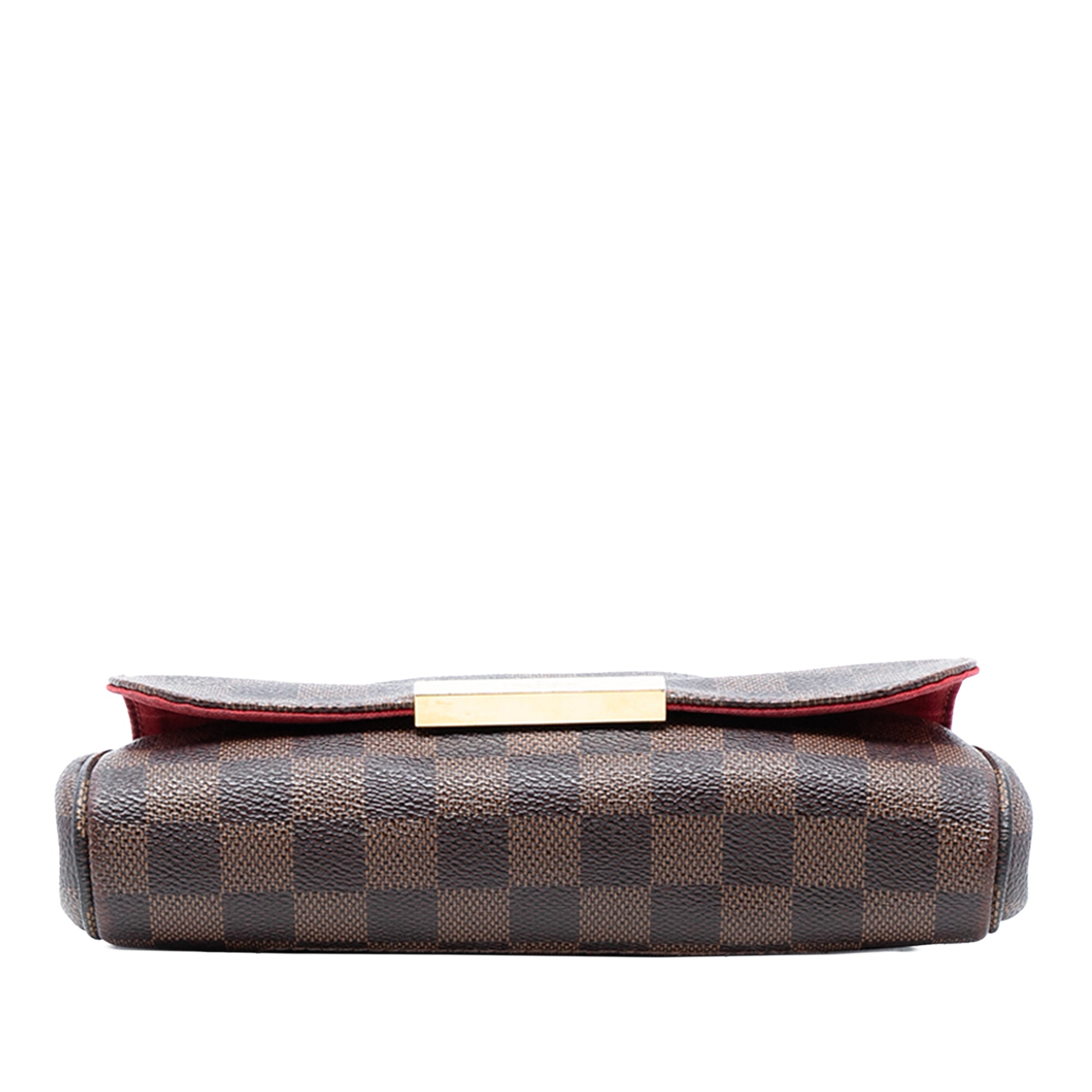 The Favorite PM features a damier ebene canvas body, a chain link strap, a detachable flat strap, a front flap with magnetic snap closure, and an interior slip pocket. Retail Price: 1080.00