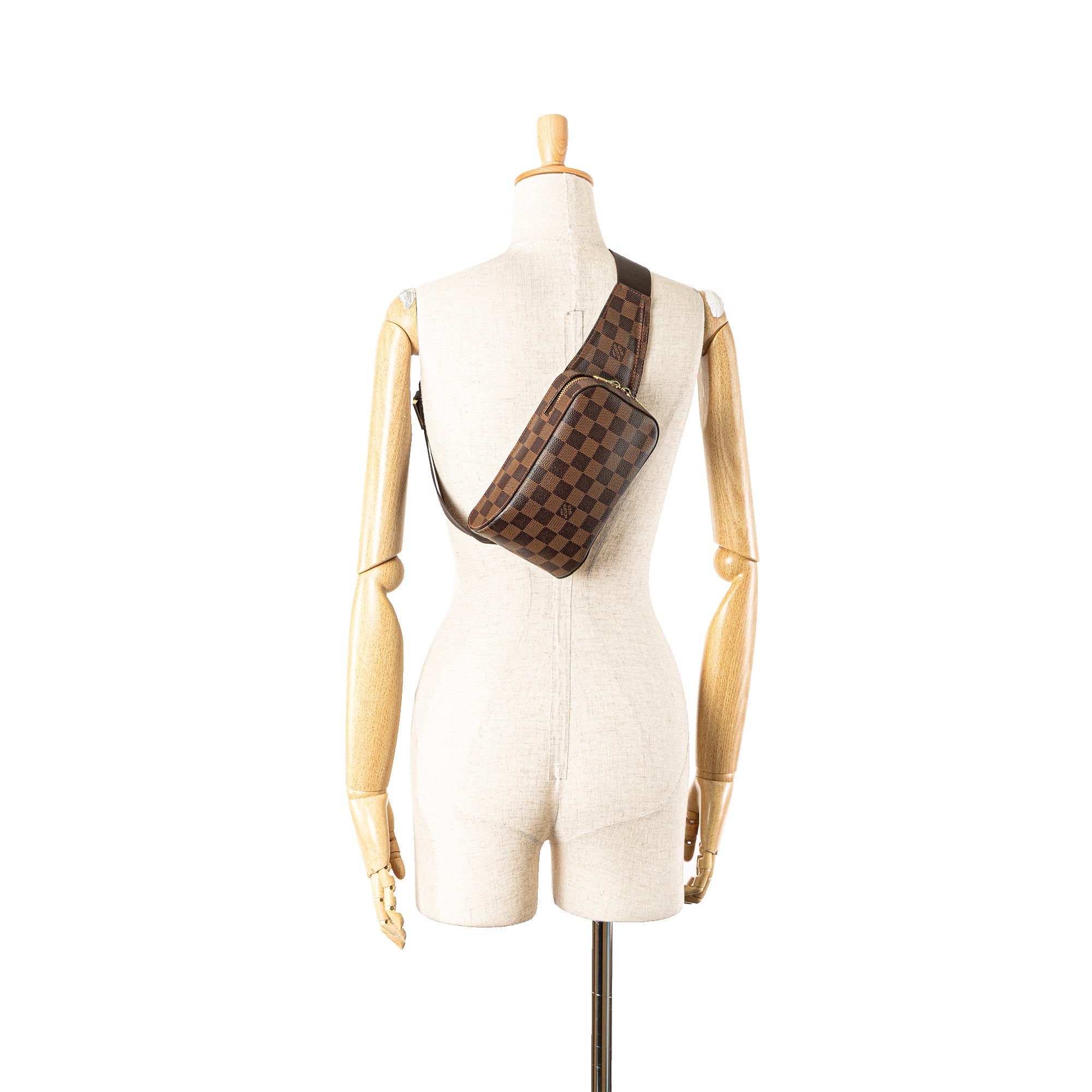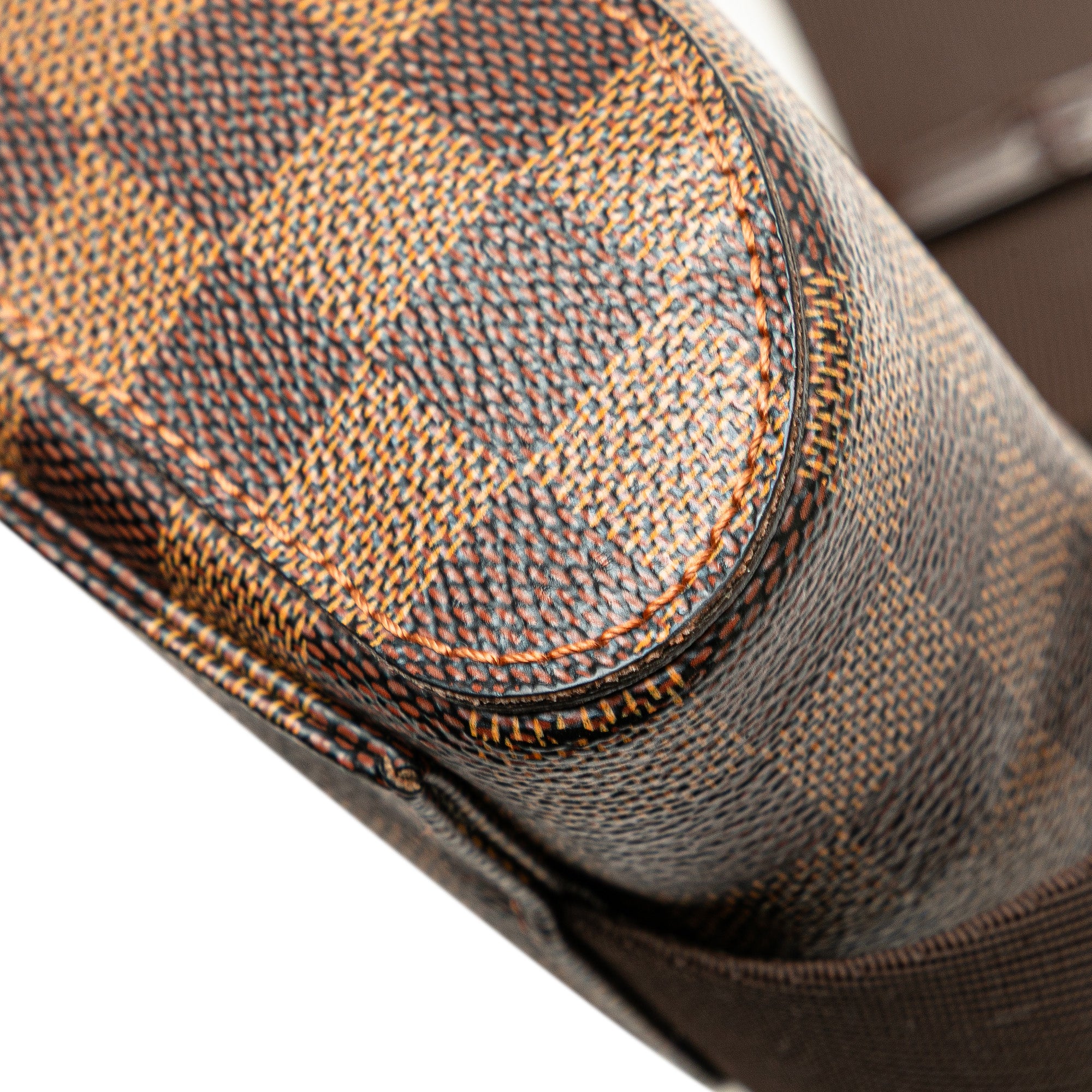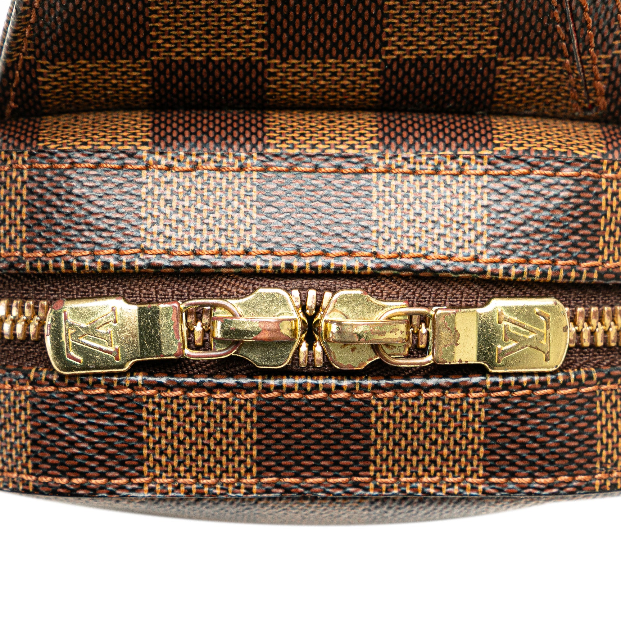 The Geronimos features a damier ebene canvas body with leather trim, an adjustable flat strap, and a top zip closure. Retail Price: 1559.00