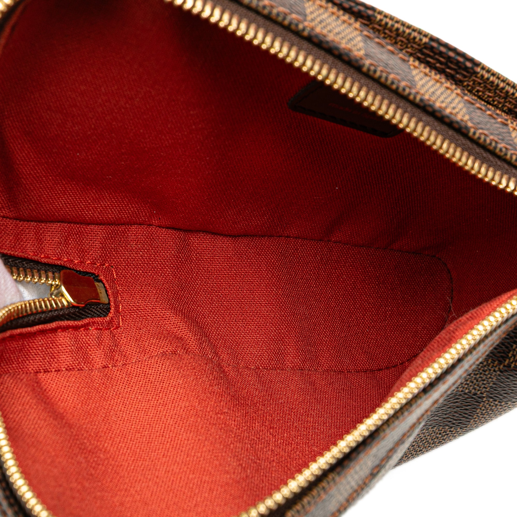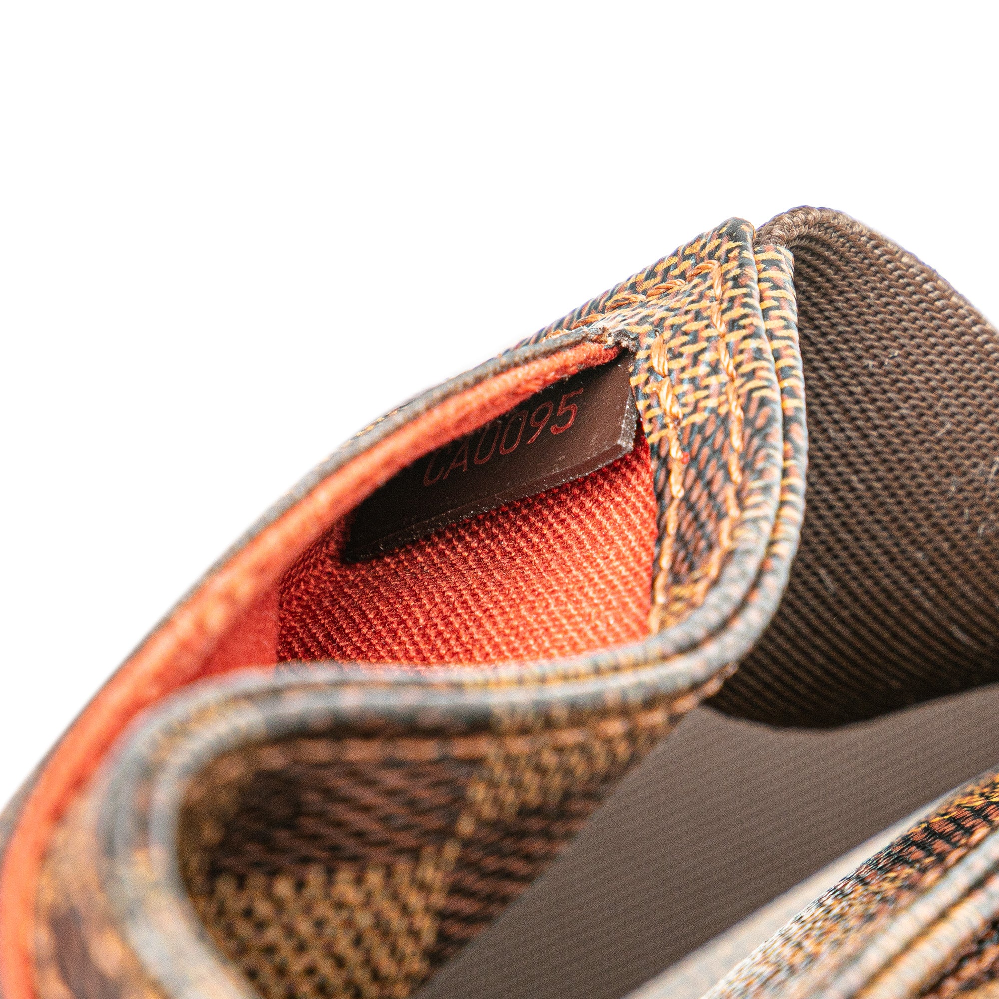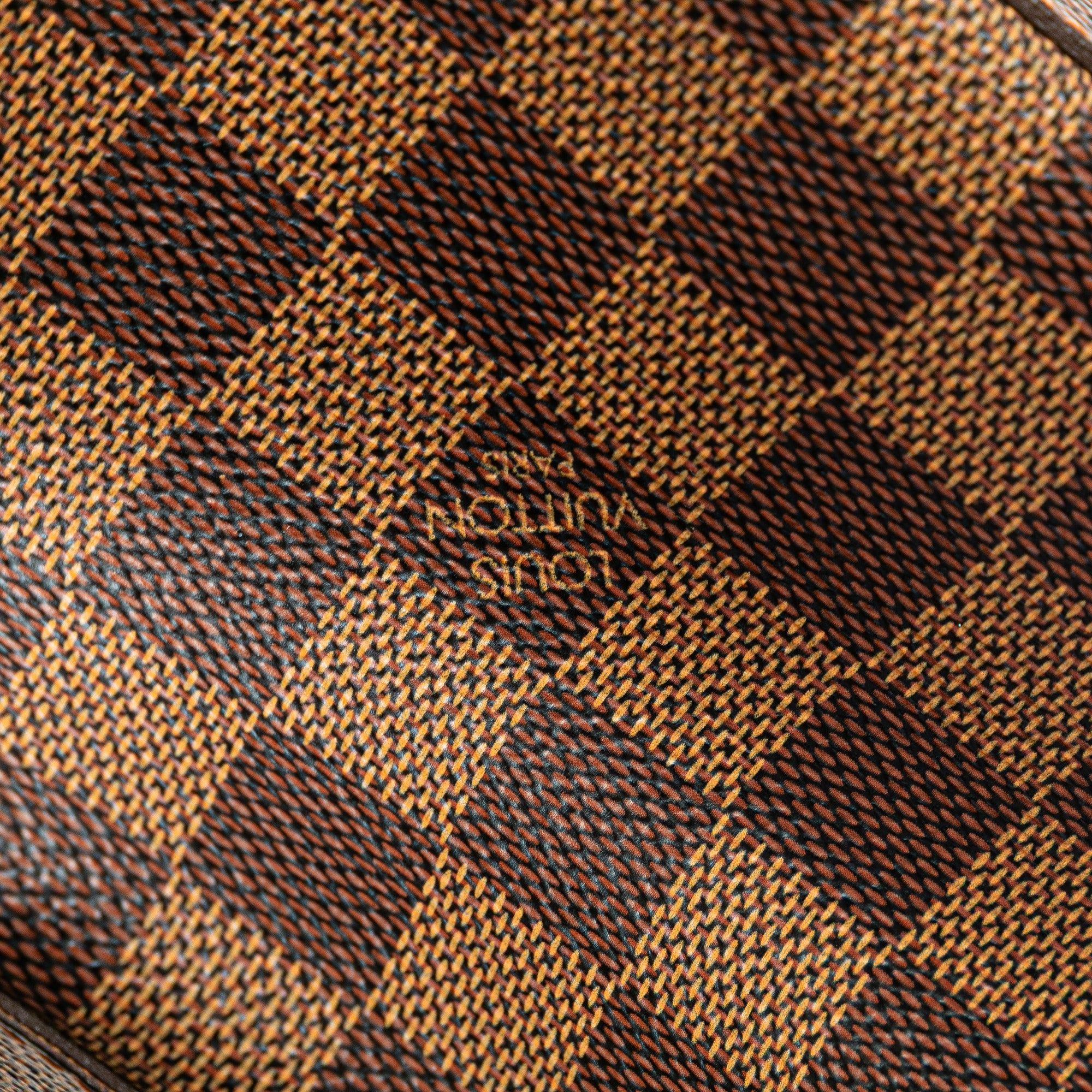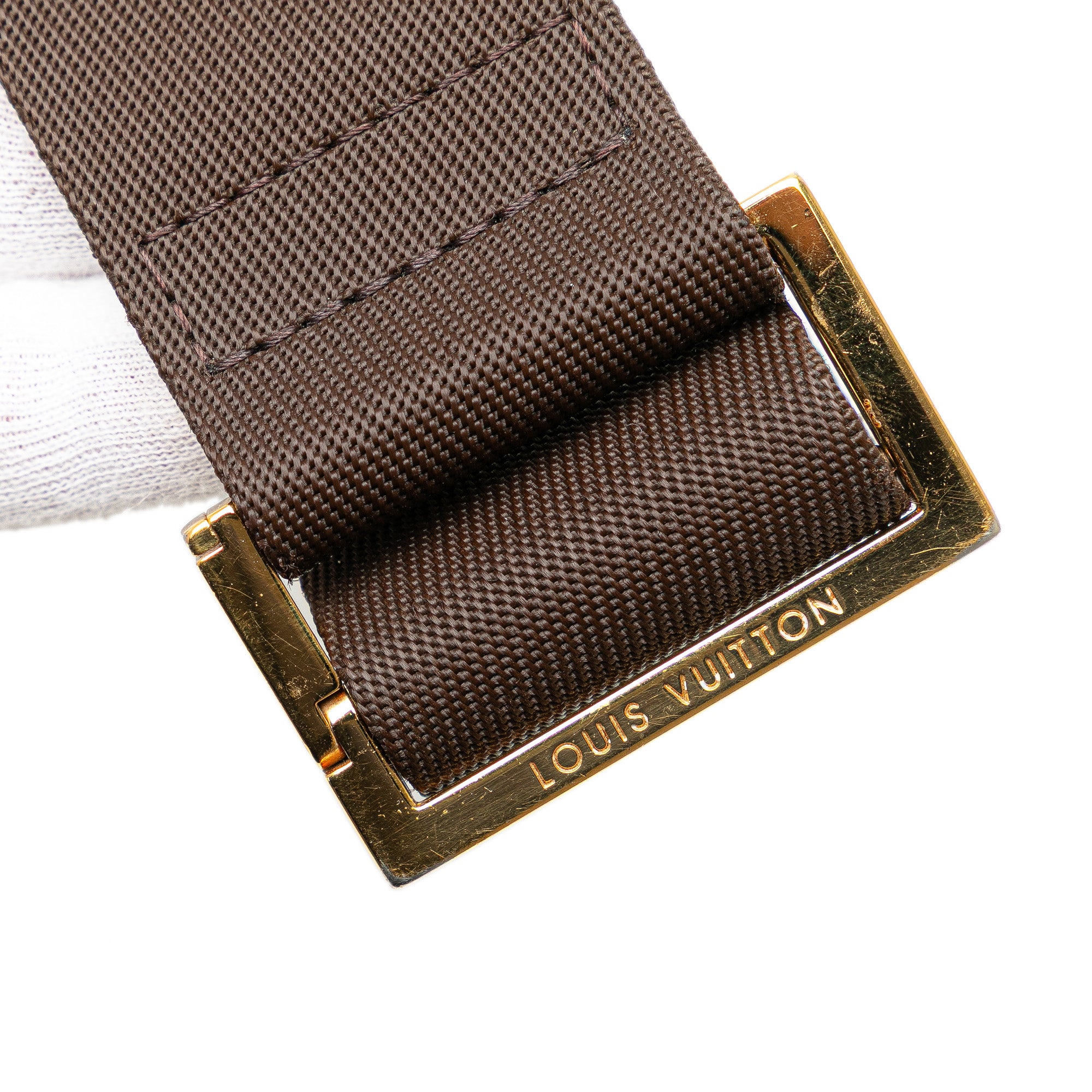 The Geronimos features a damier ebene canvas body with leather trim, an adjustable flat strap, and a top zip closure. Retail Price: 1559.00