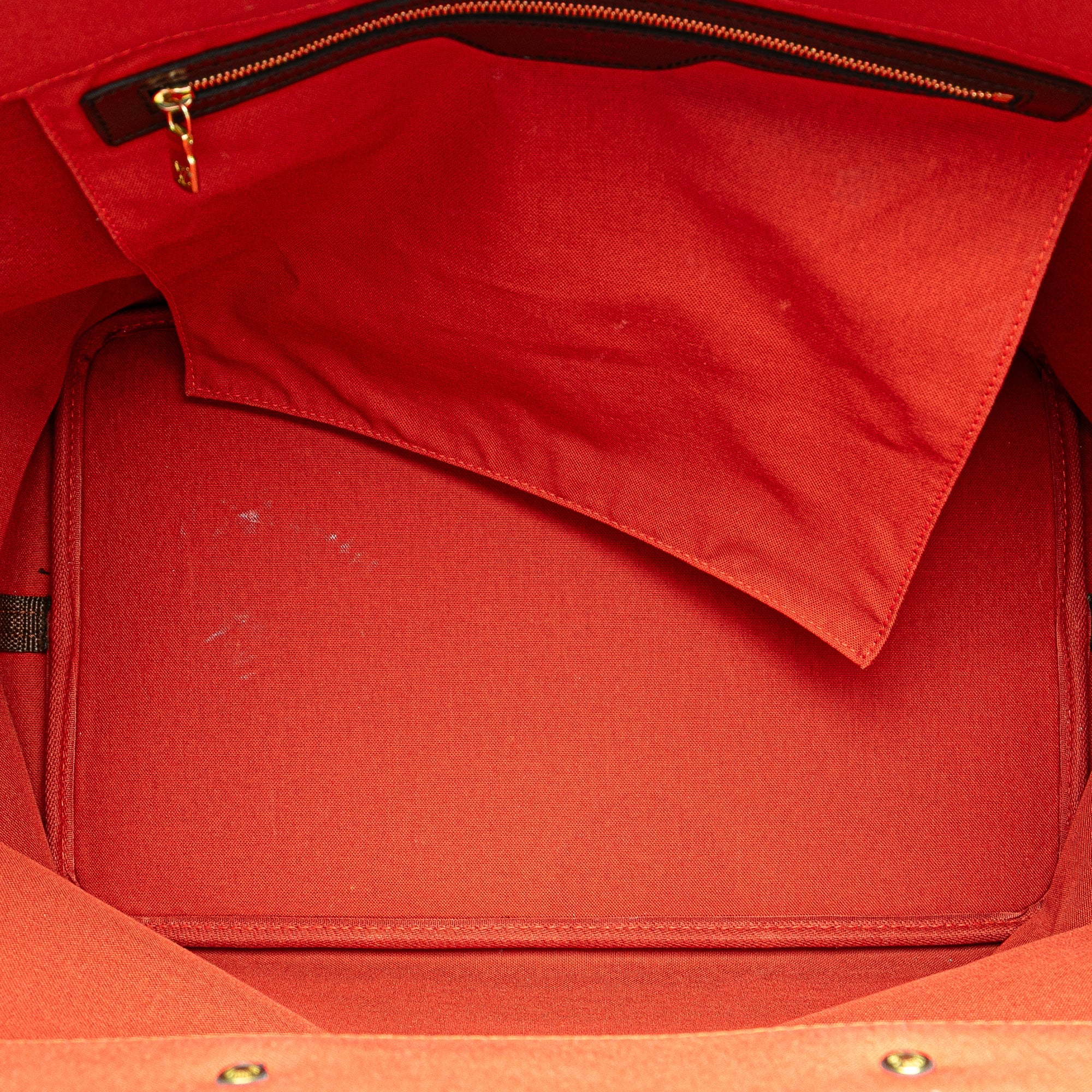 The Greenwich PM features a damier canvas body with leather trim, rolled leather handles, a top zip closure, and an interior zip pocket. Retail Price: 2570.00