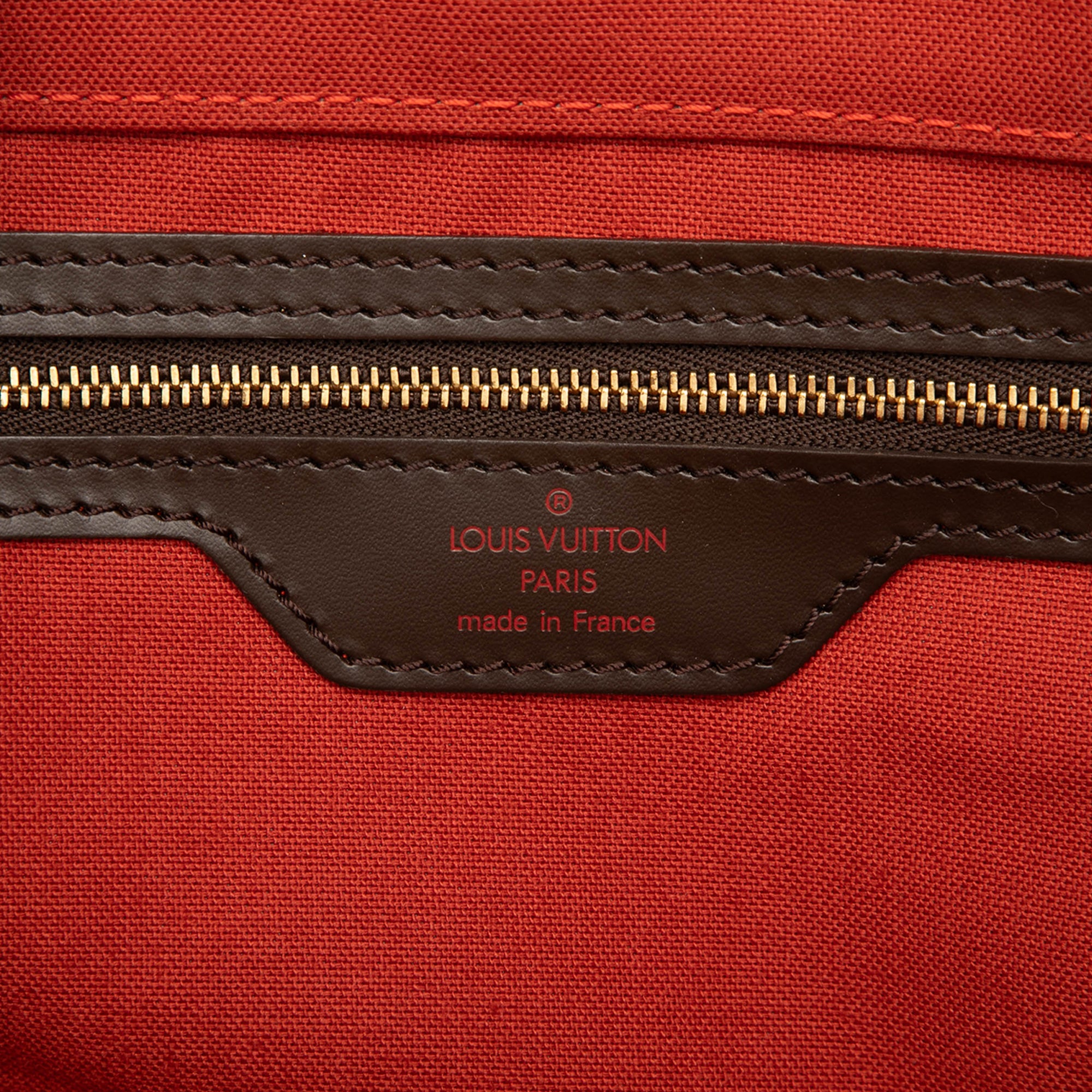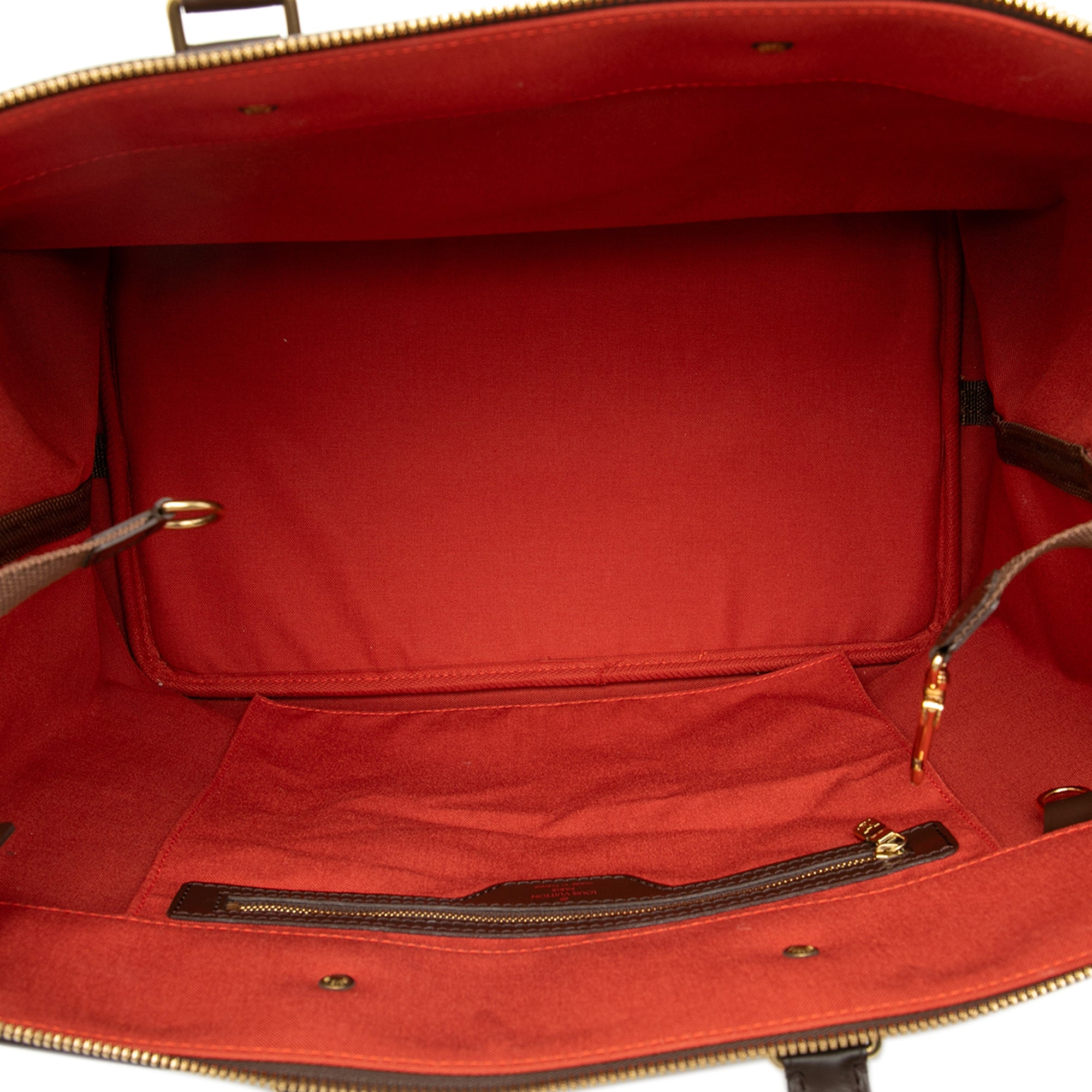 The Greenwich PM features a damier ebene canvas body with leather trim, rolled leather handles, a top zip closure, and an interior zip pocket. Retail Price: 2570.00