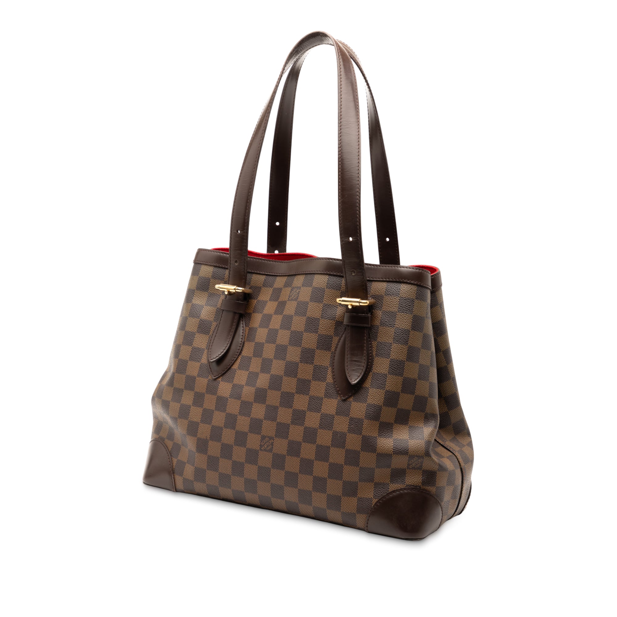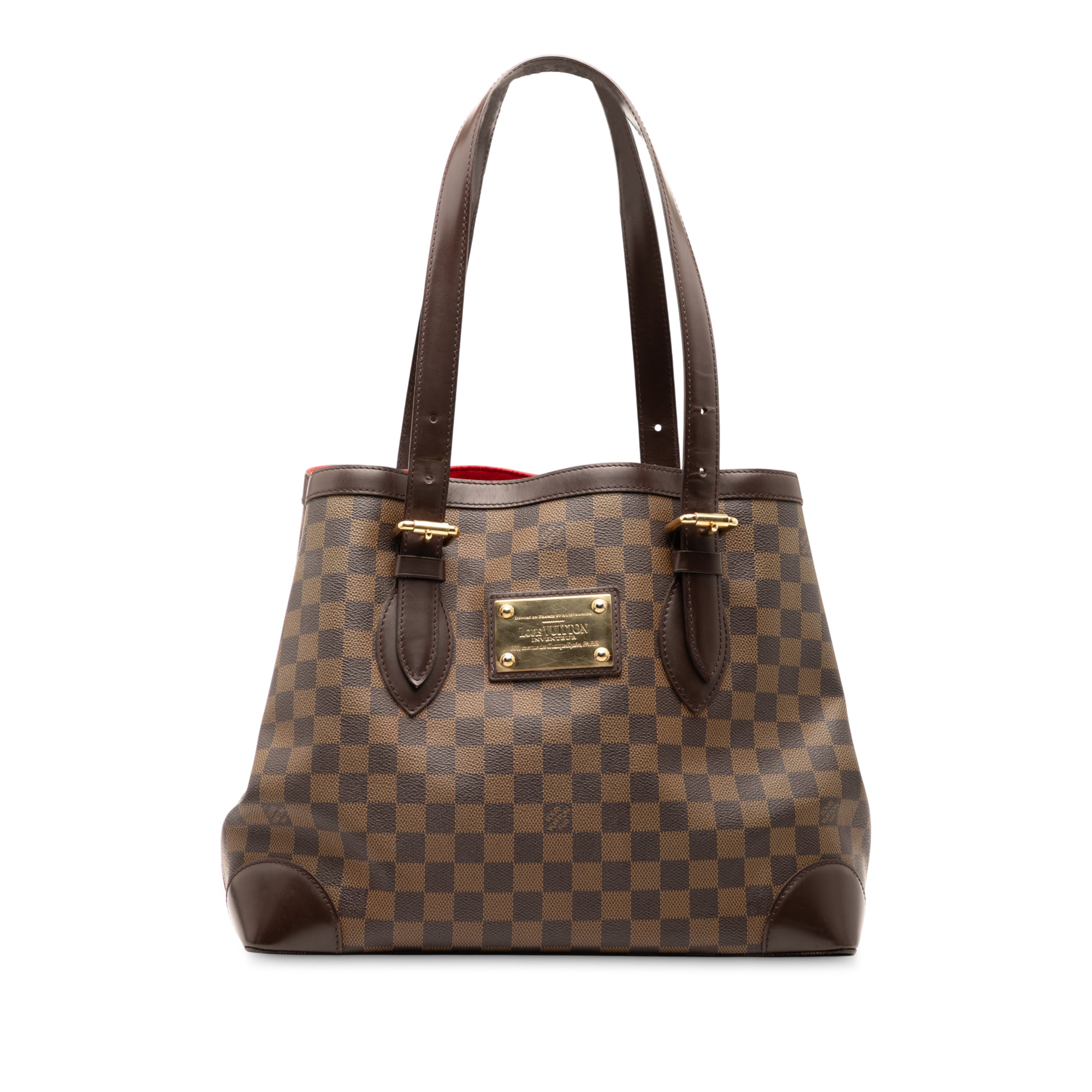 The Hampstead MM features a damier ebene canvas body with leather trim, flat leather handles, an open top, and interior zip and slip pockets. Retail Price: 1470.00