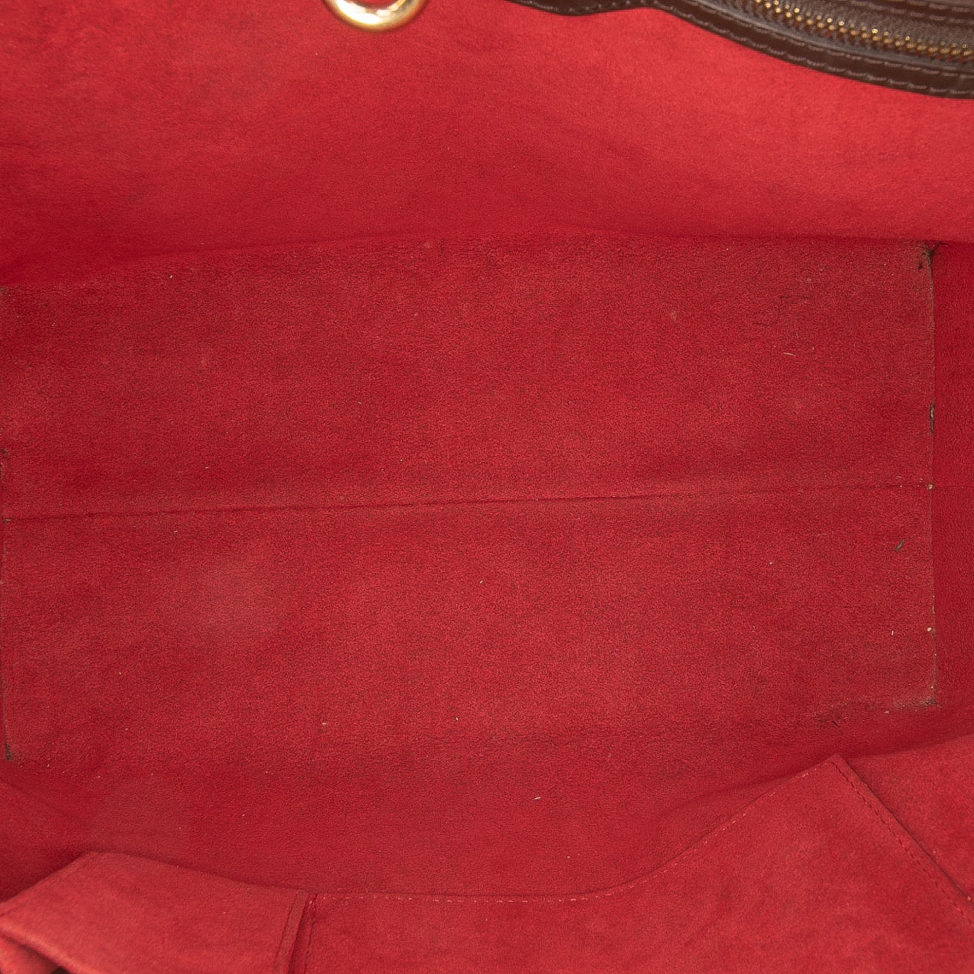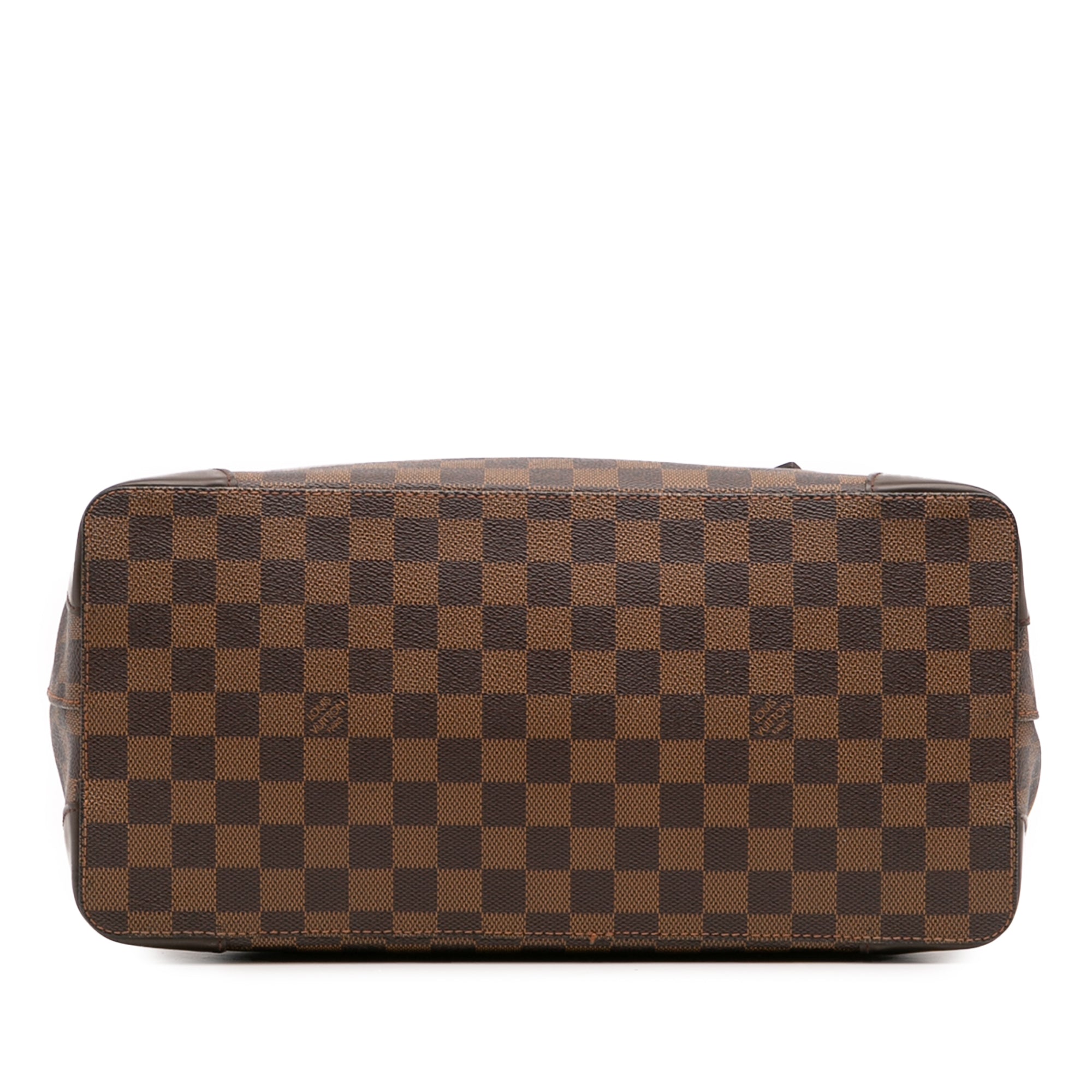 The Hampstead MM features a damier ebene canvas body with leather trim, adjustable flat leather handles, an open top with hook closure, and interior zip and slip pockets. Retail Price: 1470.00