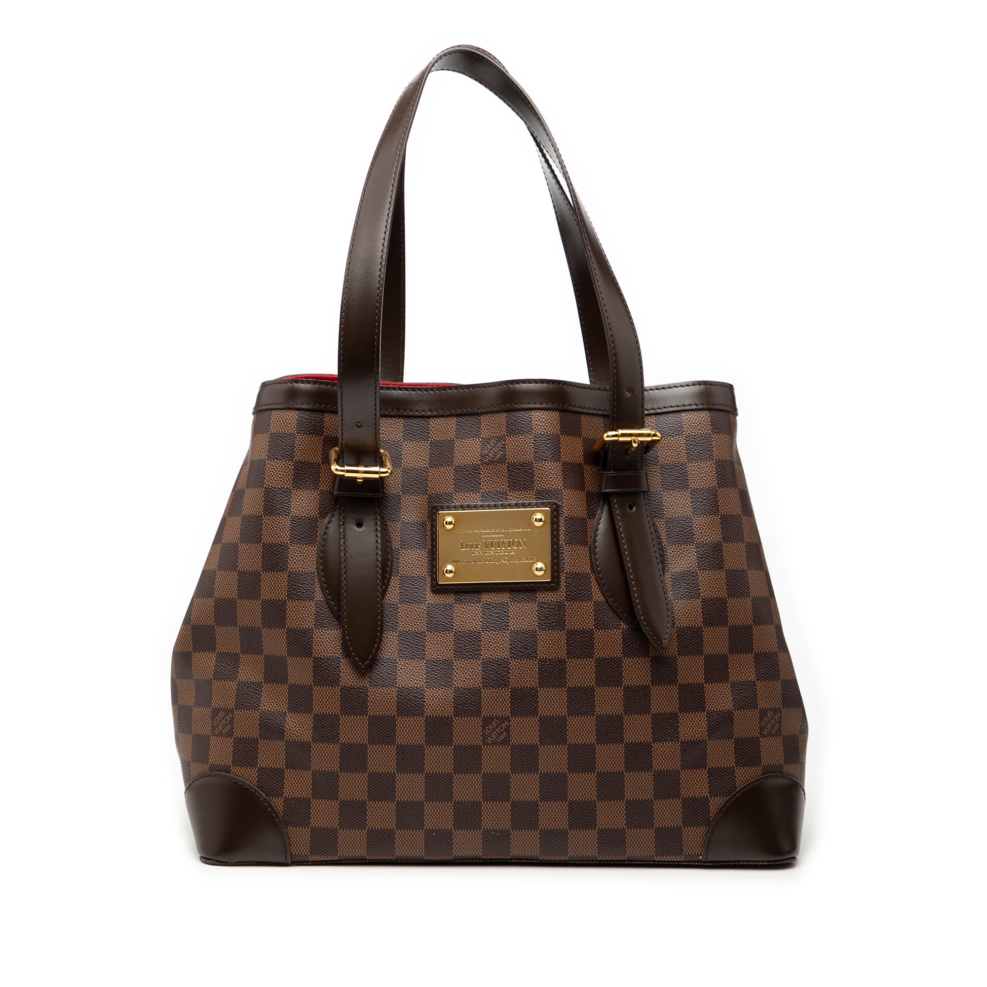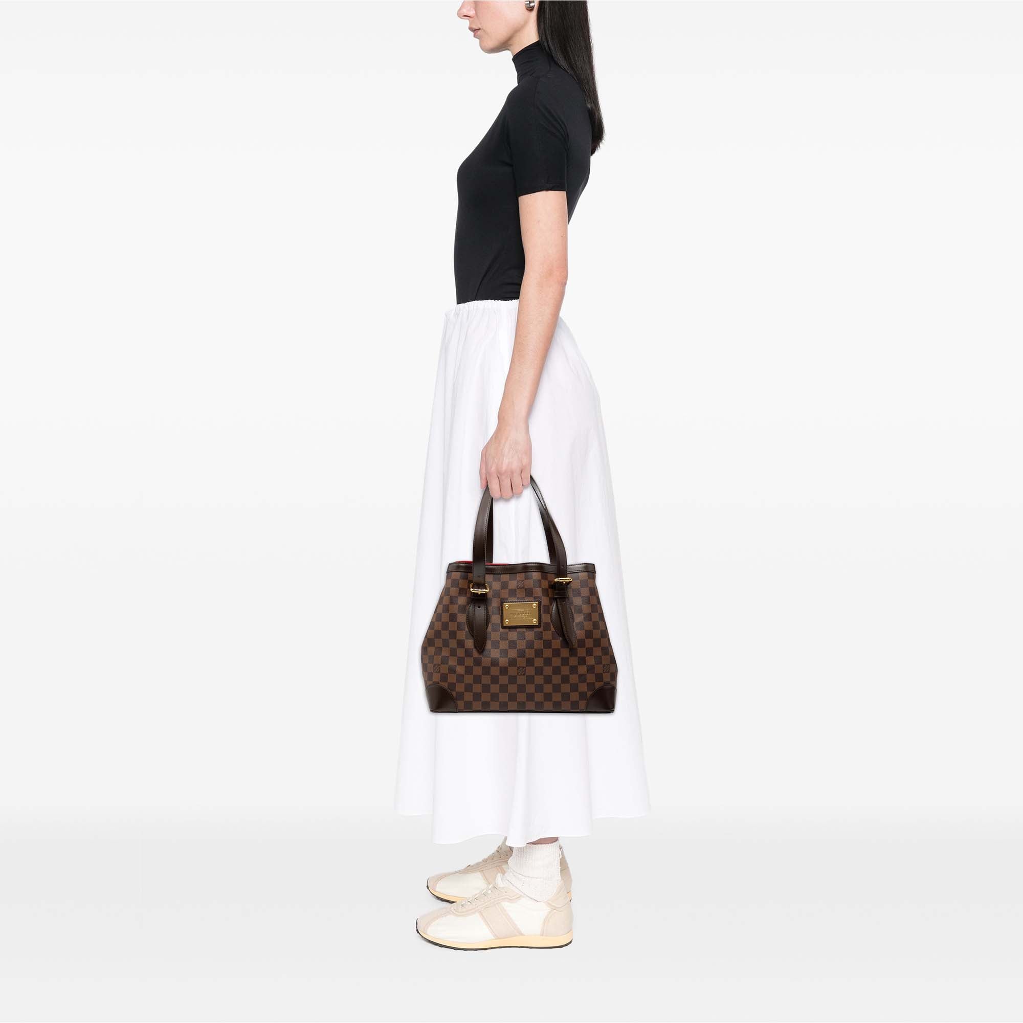 The Hampstead MM features a damier ebene canvas body with leather trim, adjustable flat leather straps, an open top with hook closure, and interior zip and slip pockets. Retail Price: 1470.00
