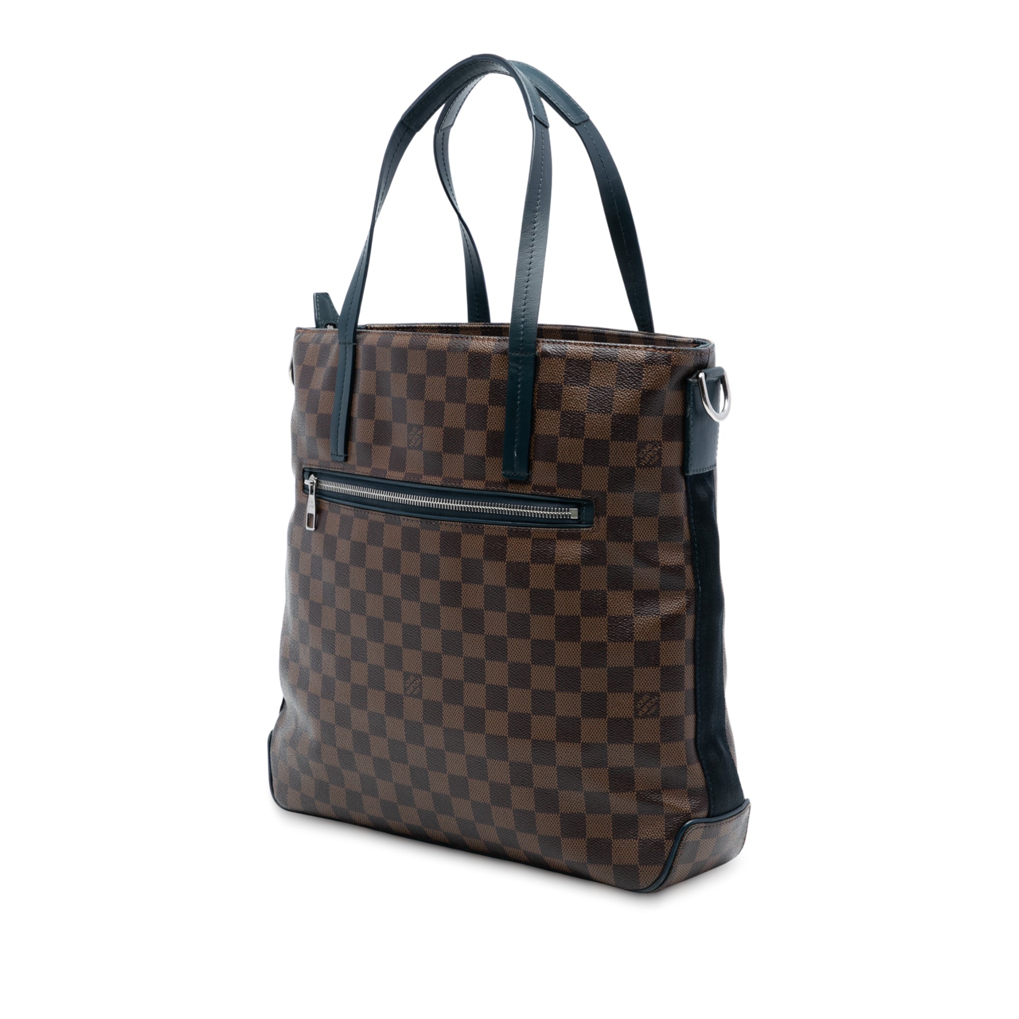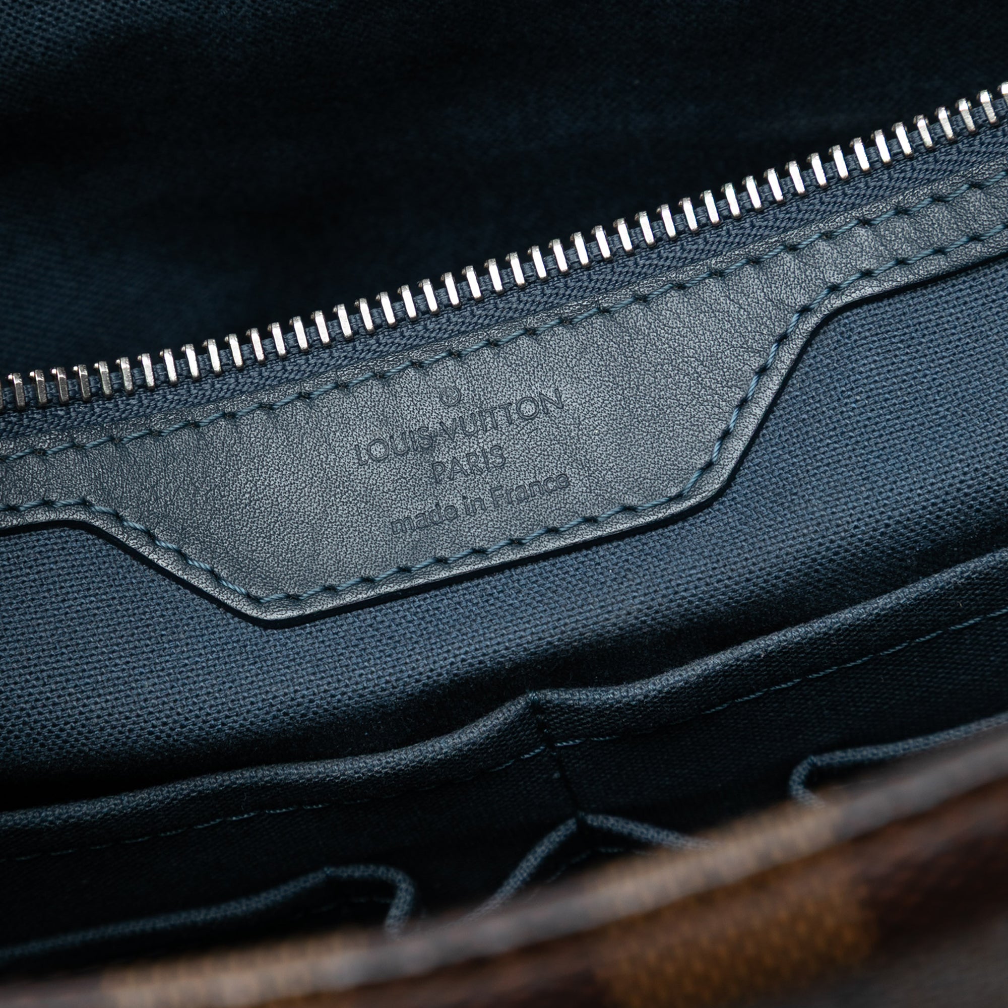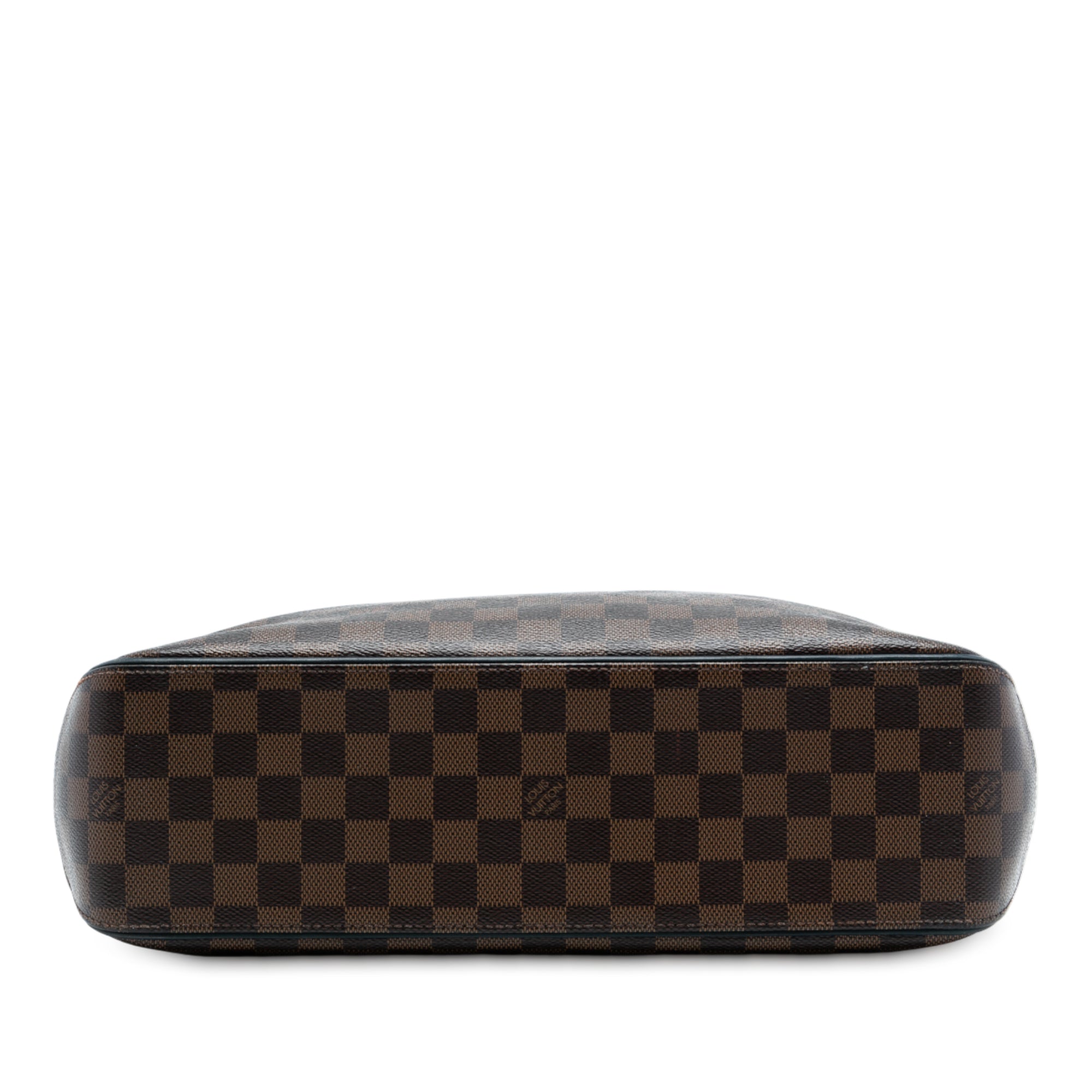 The Herald features a damier ebene canvas body with leather trim, flat leather handles, an adjustable and detachable flat strap, a top zip closure, an exterior back zip pocket, and interior zip and slip pockets. Retail Price: 1800.00