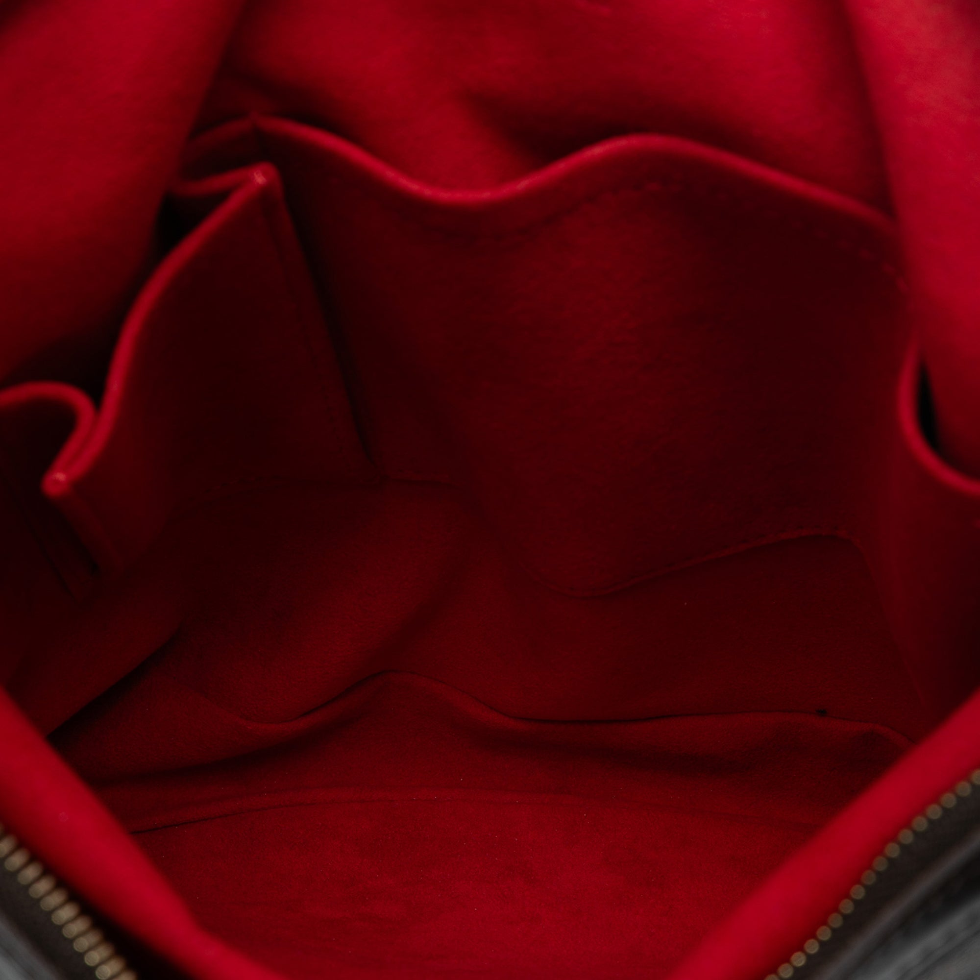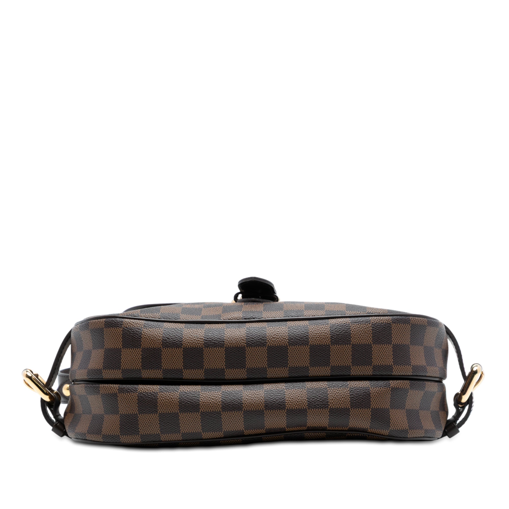 The Highbury features a damier ebene canvas body with leather trim, a flat leather strap, a top zip closure, an exterior front flap pocket, dual interior compartments, and interior slip pockets. Retail Price: 2100.00