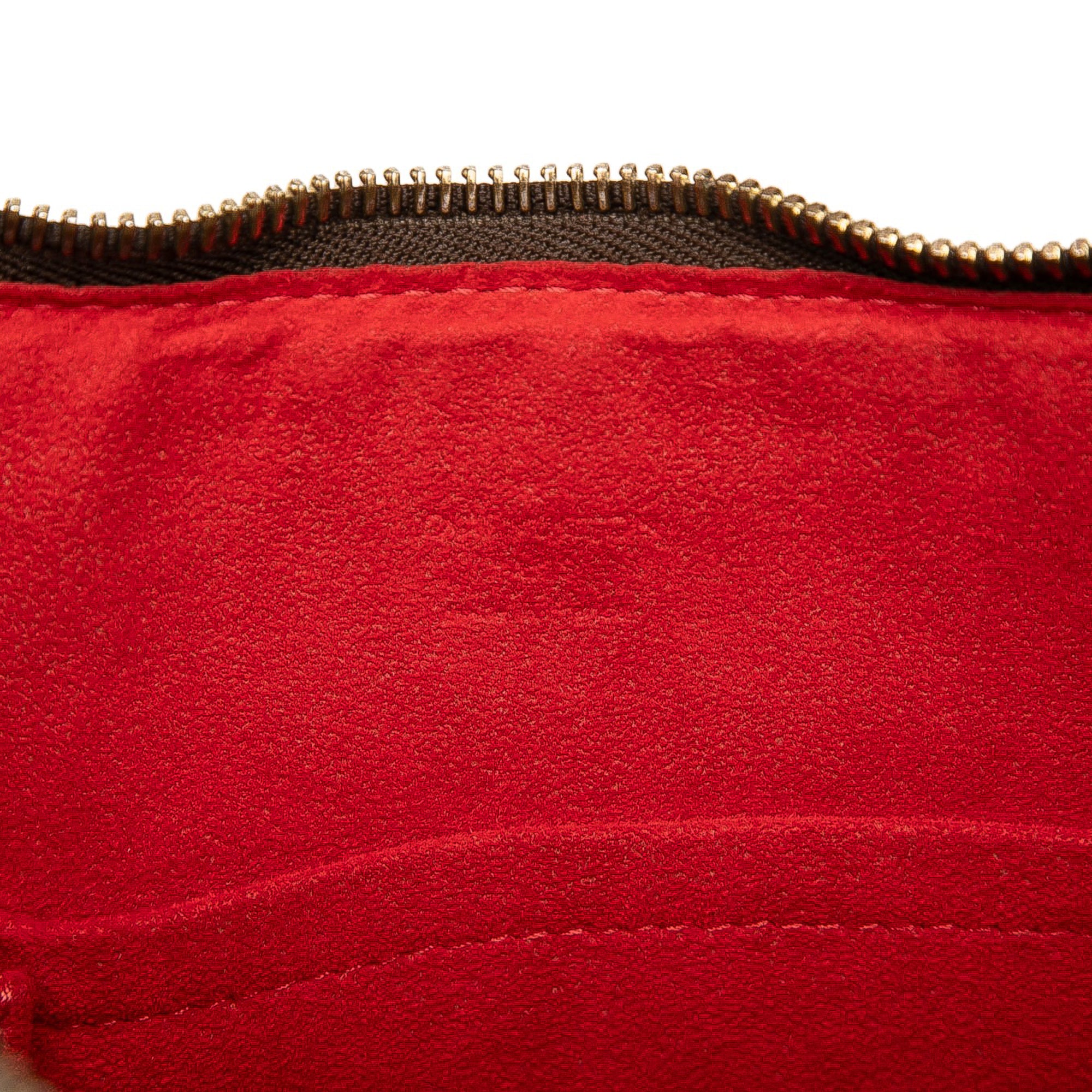 The Highbury features a damier ebene canvas body with leather trim, a flat leather strap, a top zip closure, and an exterior front flap pocket, and dual interior compartments and slip pockets. Retail Price: 2100.00