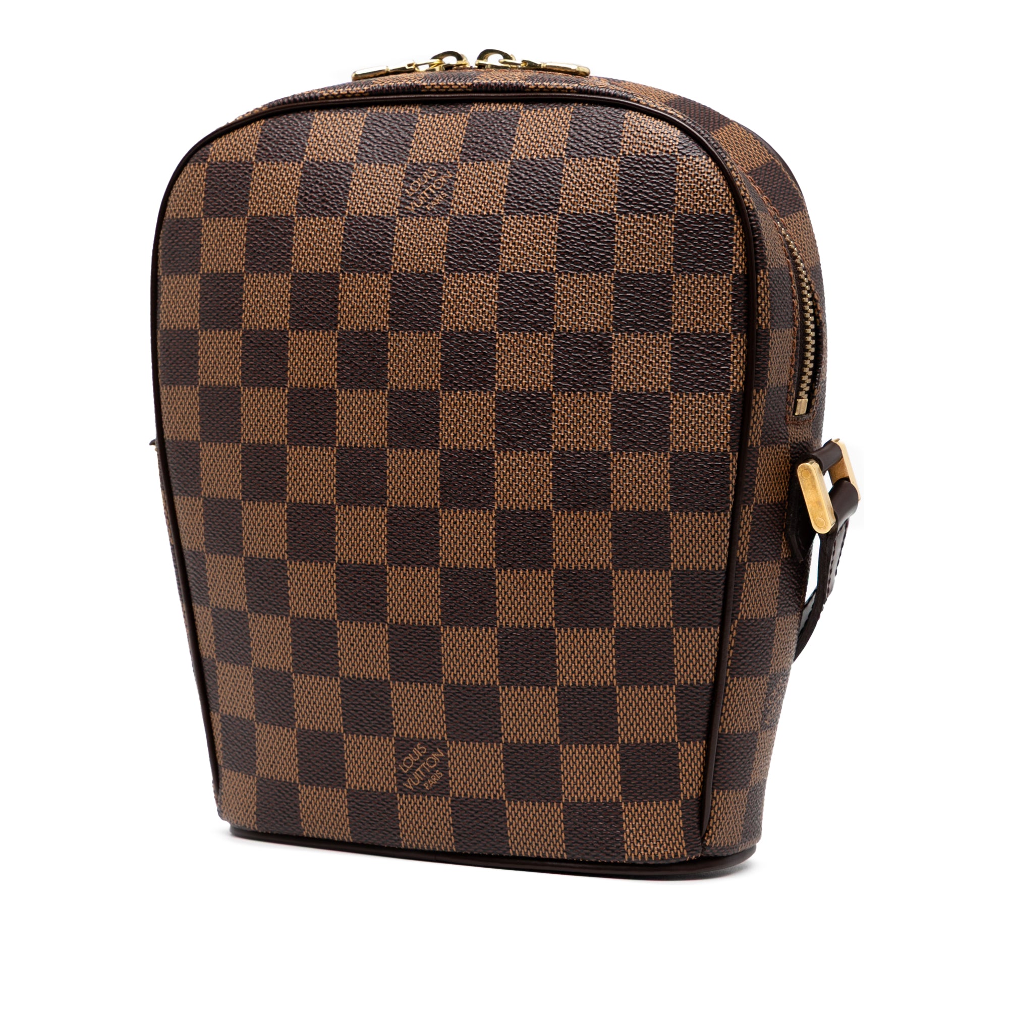 The Ipanema PM features a damier ebene canvas body with leather trim, a flat adjustable leather strap, a top zip closure, a front exterior slip pocket, and an interior slip pocket. Inclusion: Dust bag, box. Retail Price: 1585.00