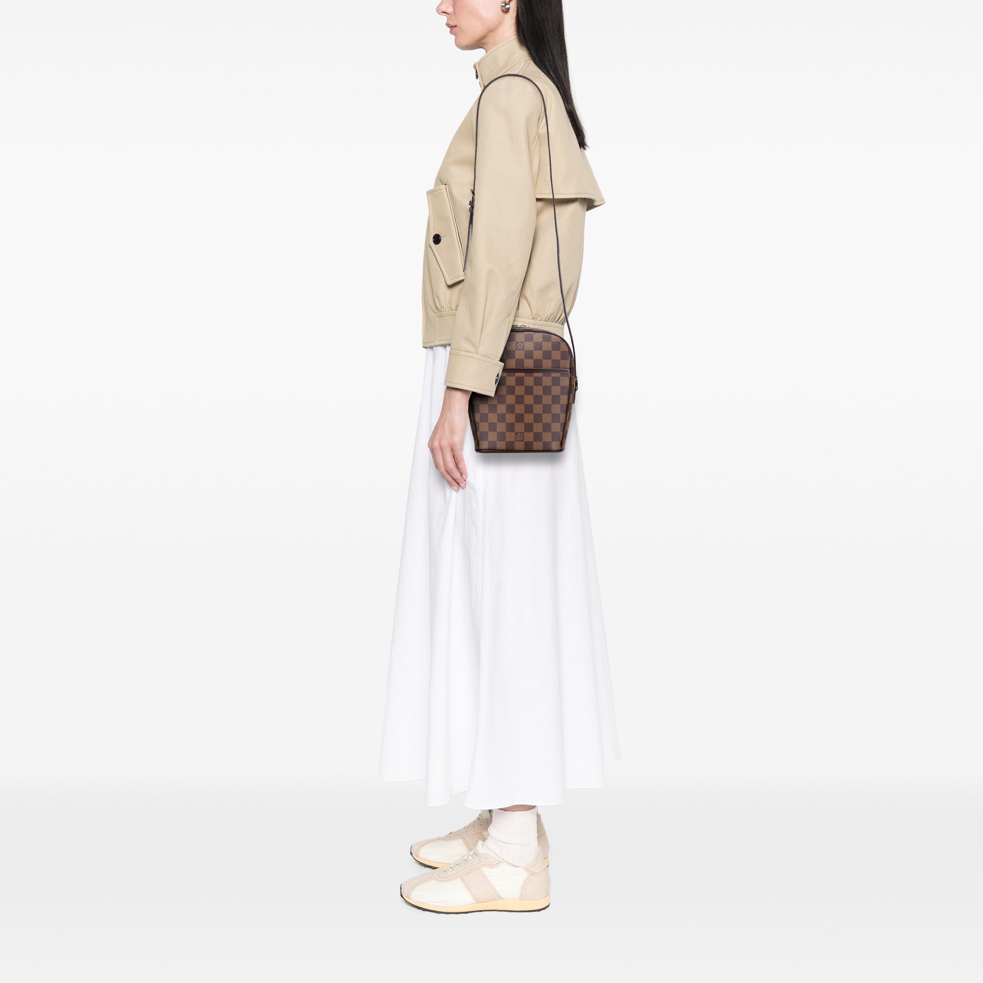 The Ipanema PM features a damier ebene canvas body with a leather trim, an adjustable flat leather shoulder strap, a top zip closure, a front exterior slip pocket and an interior slip pocket. Retail Price: 1240.00