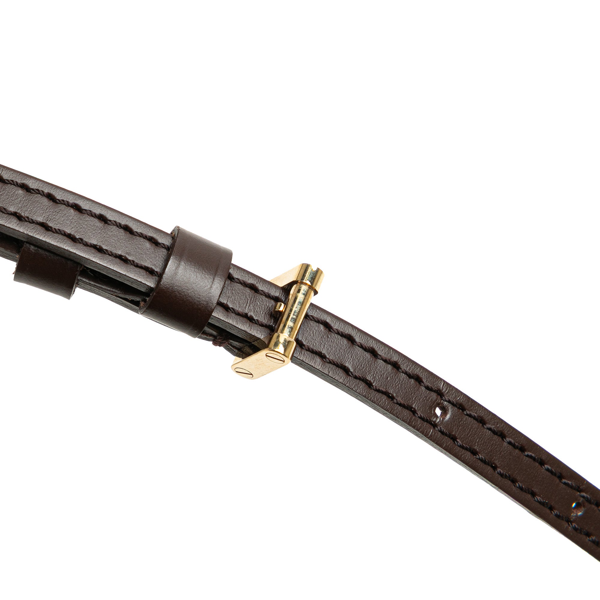 The Ipanema Pochette features a damier ebene canvas body, a flat leather strap, an exterior front slip pocket, and a top zip closure. Retail Price: 1400.00