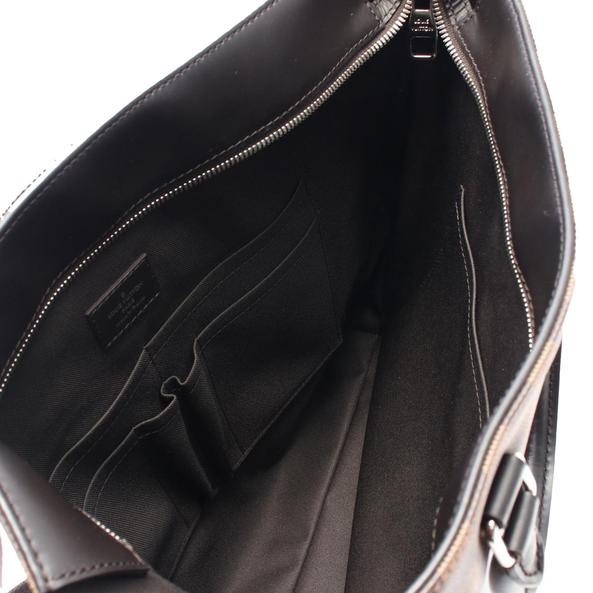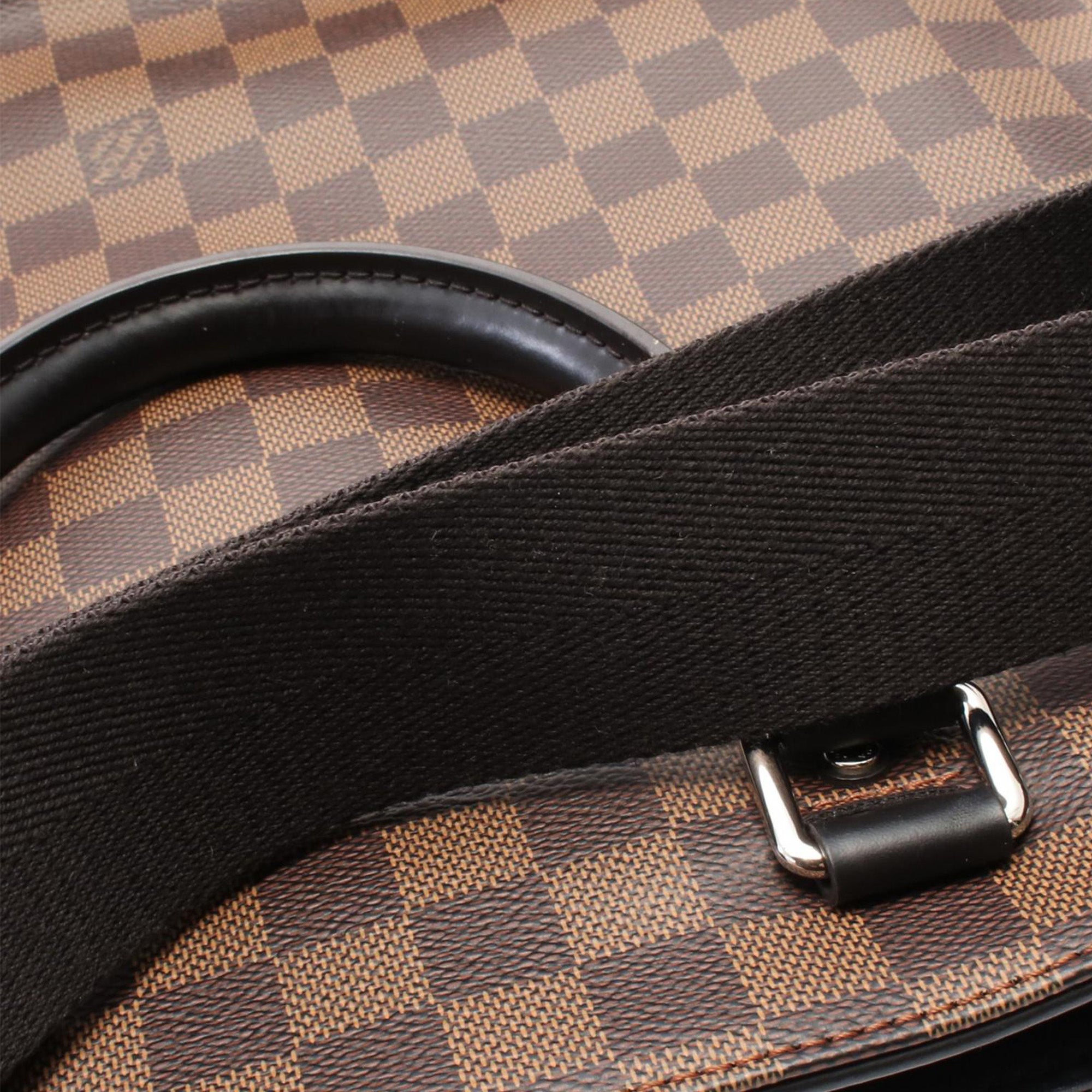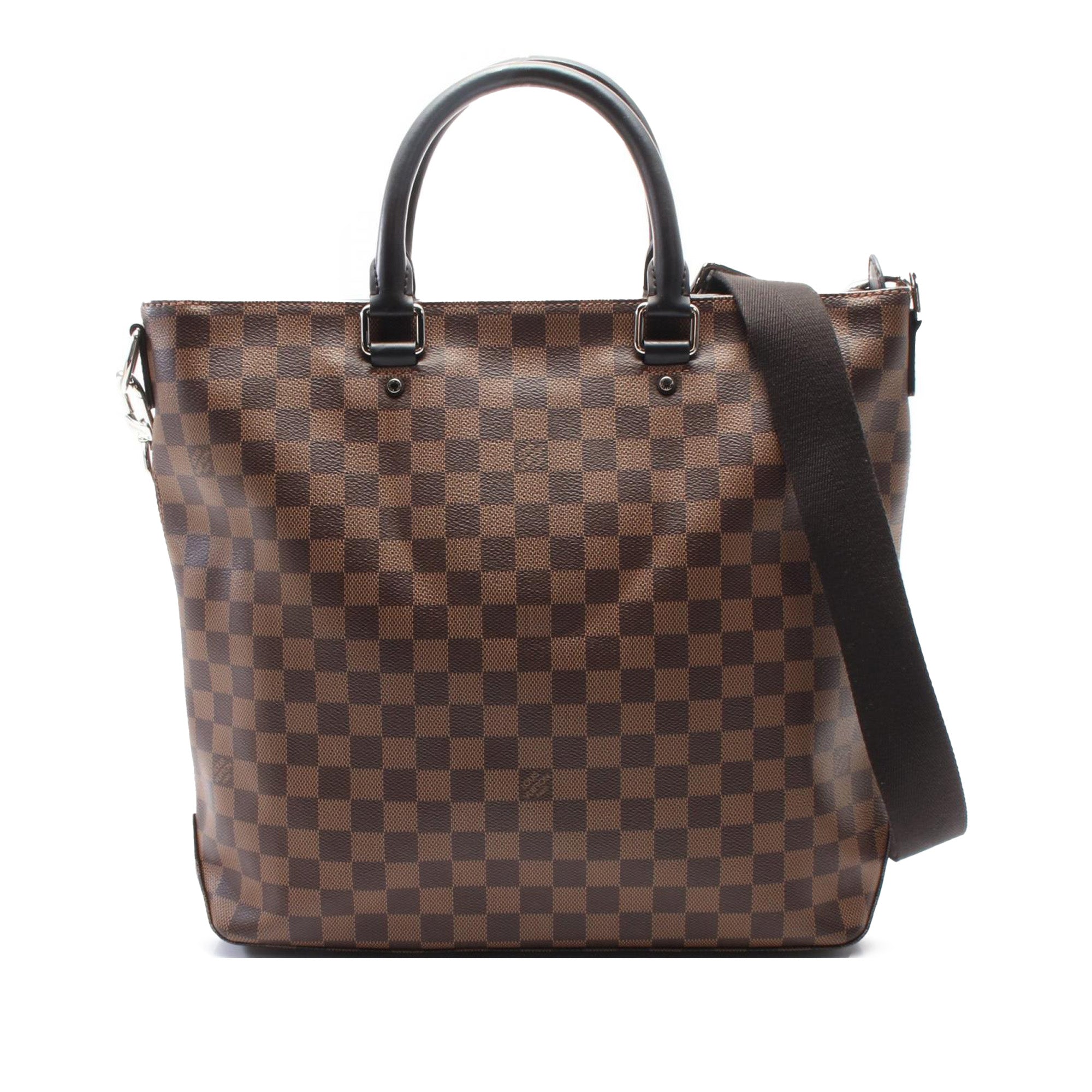 The Jake Tote features a damier ebene body, rolled leather handles, a detachable strap, a top zip closure, and interior slip pockets. Retail Price: 1985.00