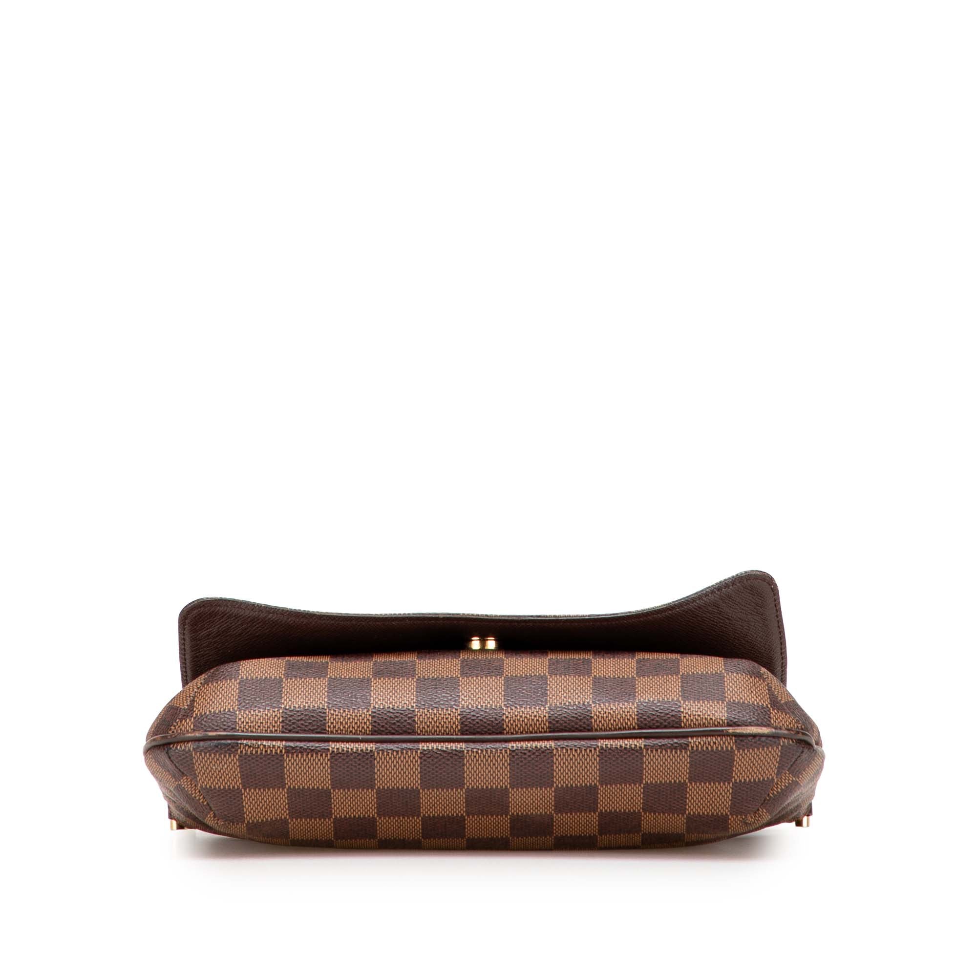The Musette Tango features a damier ebene canvas body with leather trim, a flat leather shoulder strap, a front flap with magnetic snap closure, and an interior slip pocket. Retail Price: 1038.00