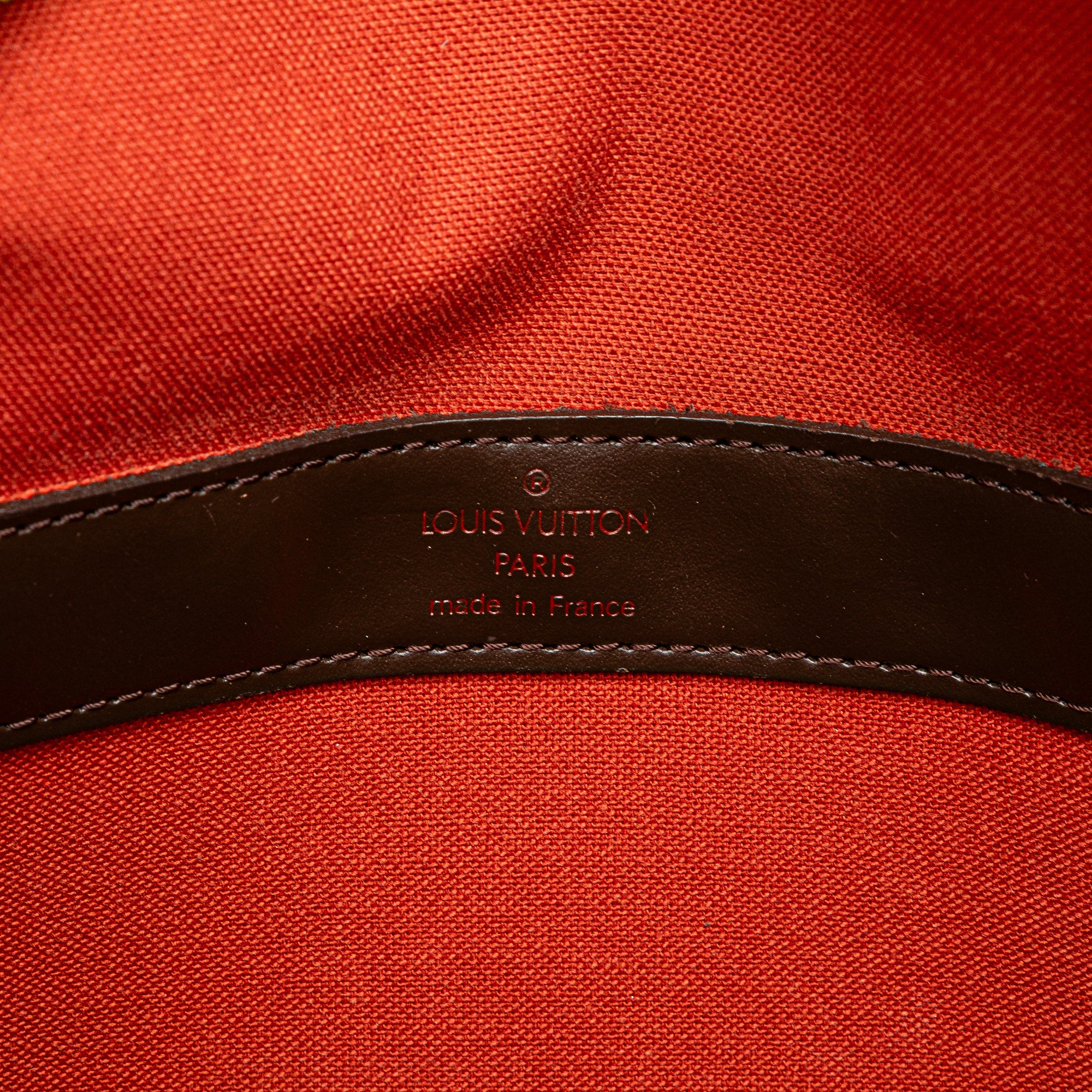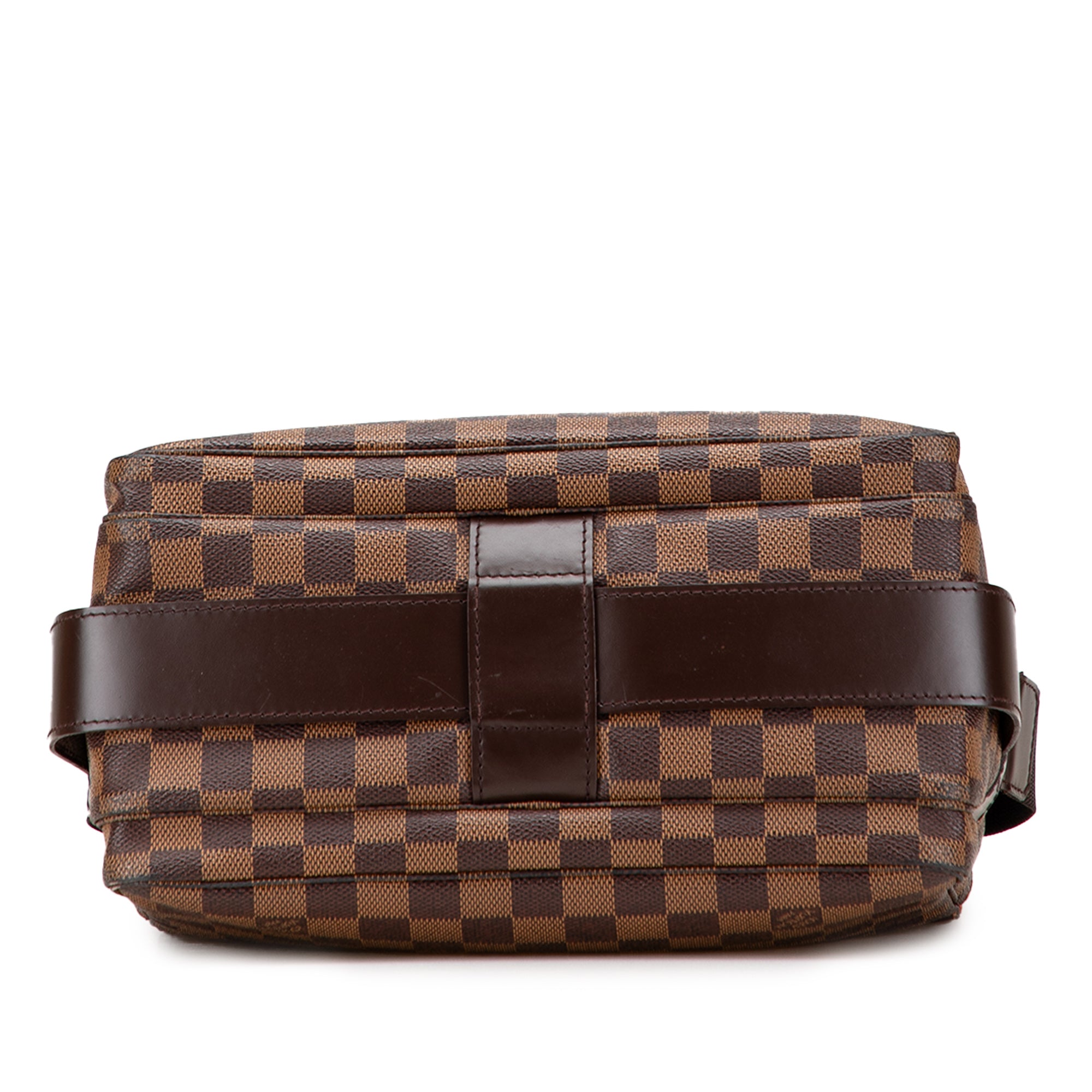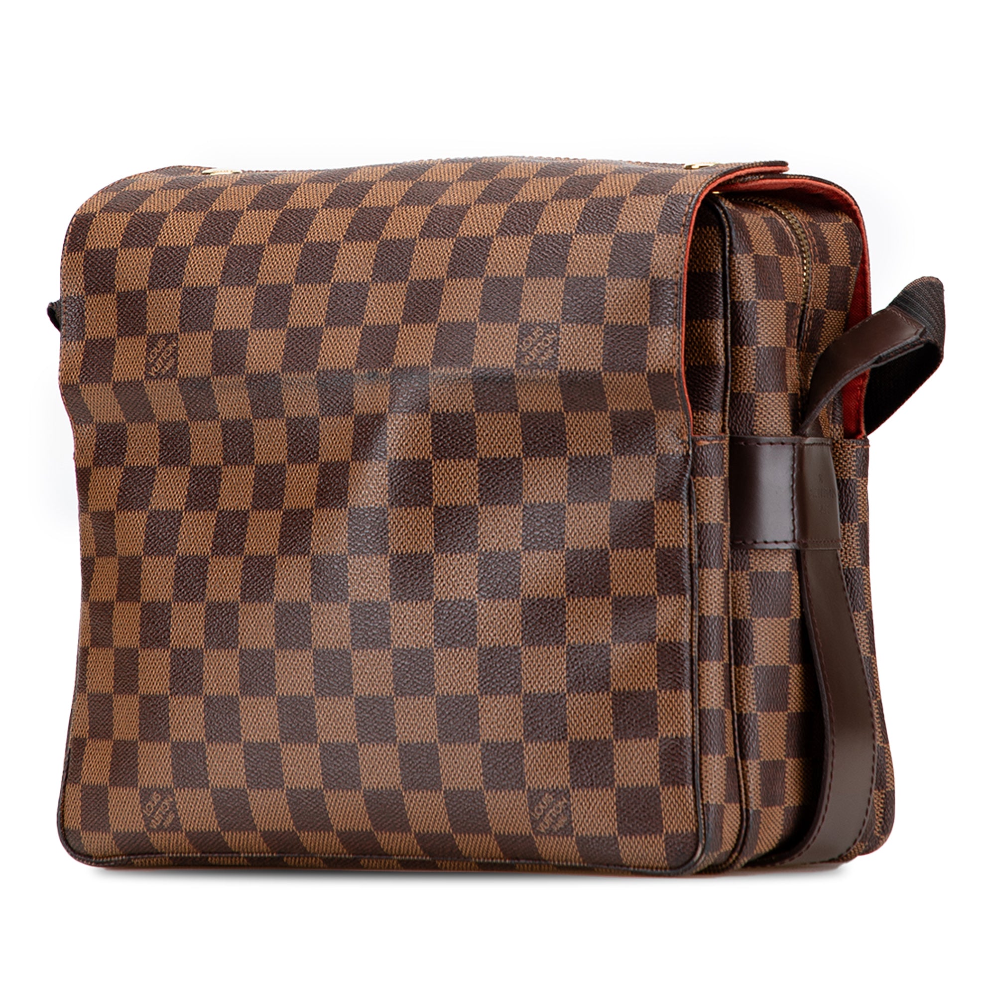 The Naviglio features a damier ebene canvas body with leather trim, an adjustable flat strap, a top flap with snap closure, top zip closure, and an interior slip pocket. Retail Price: 1560.00