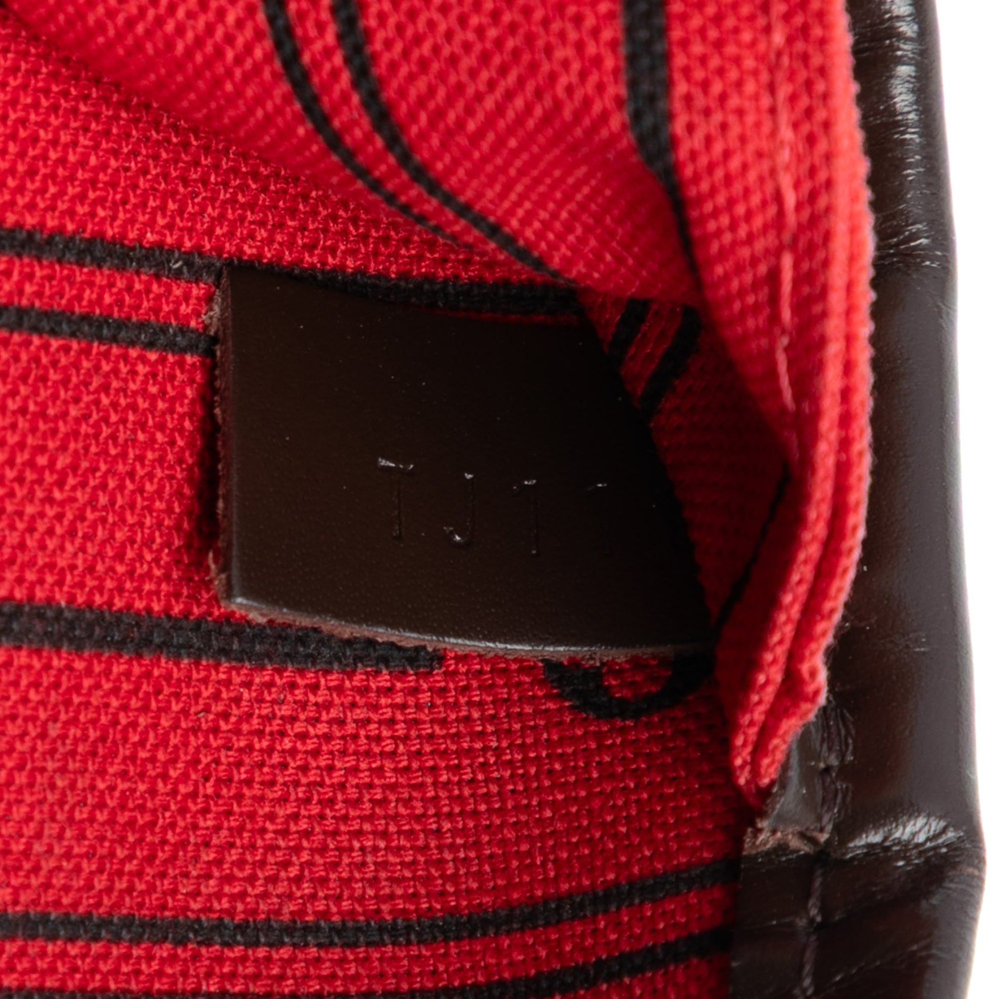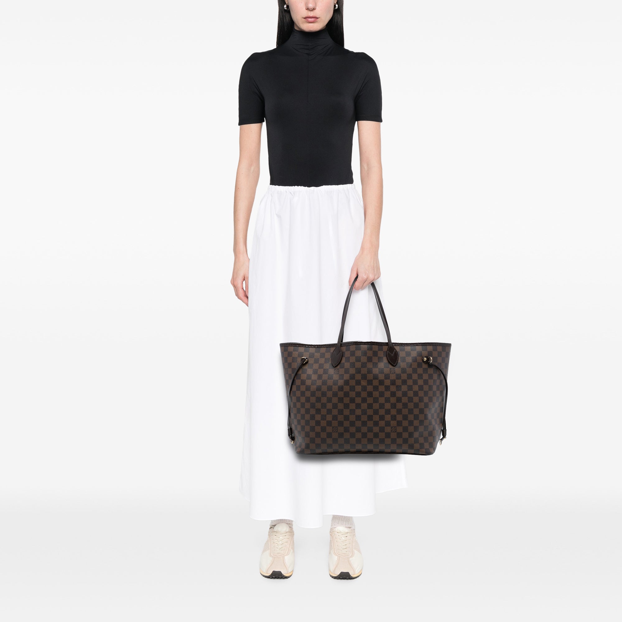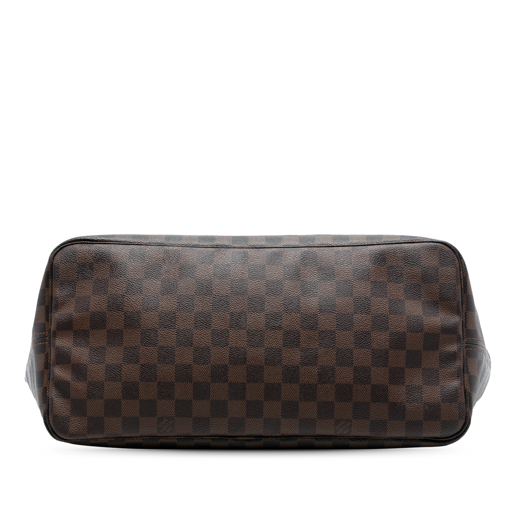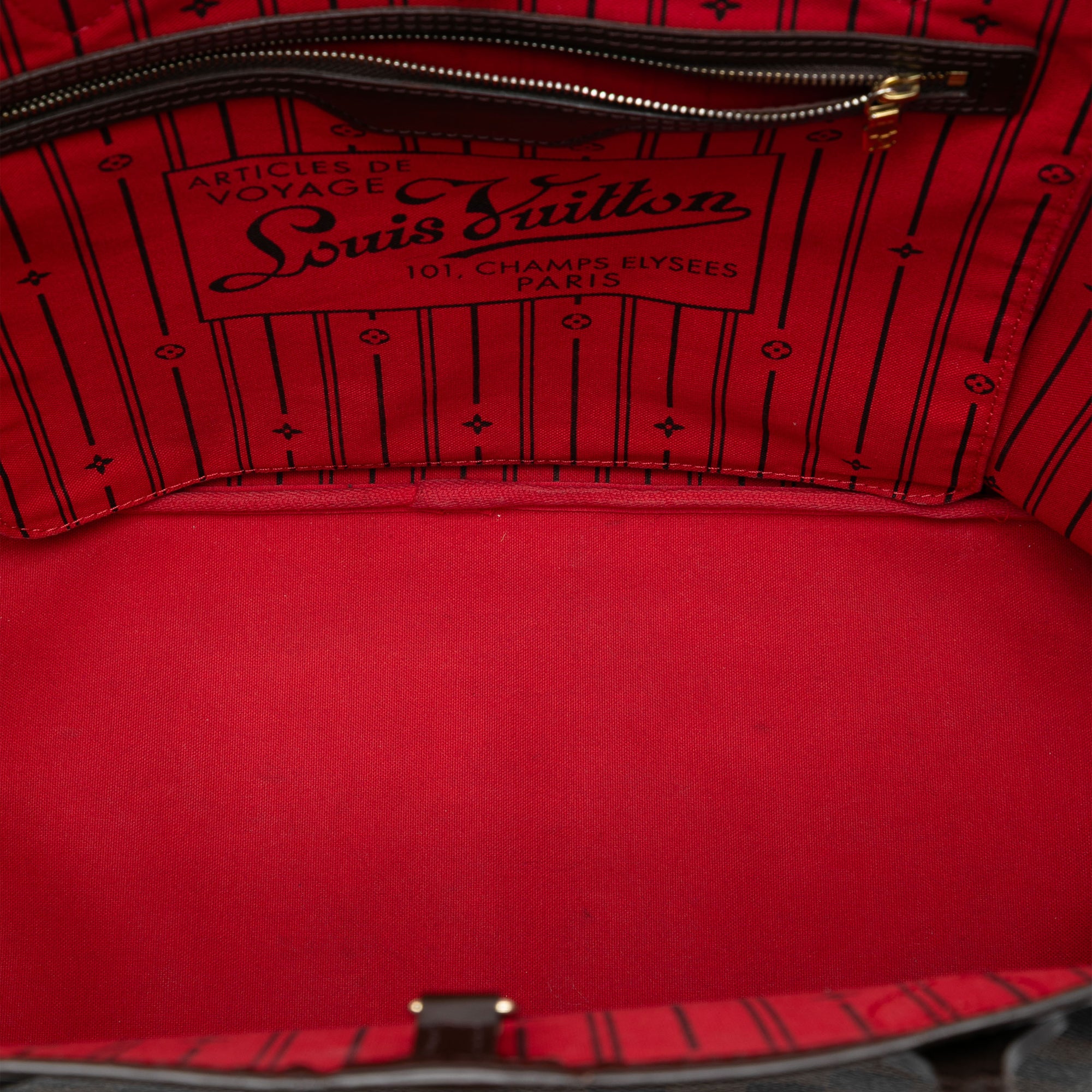 The Neverfull GM features a damier ebene canvas body with leather trim, flat leather shoulder straps, an open top with lobster claw hook closure, and an interior zip pocket. Retail Price: 2030.00