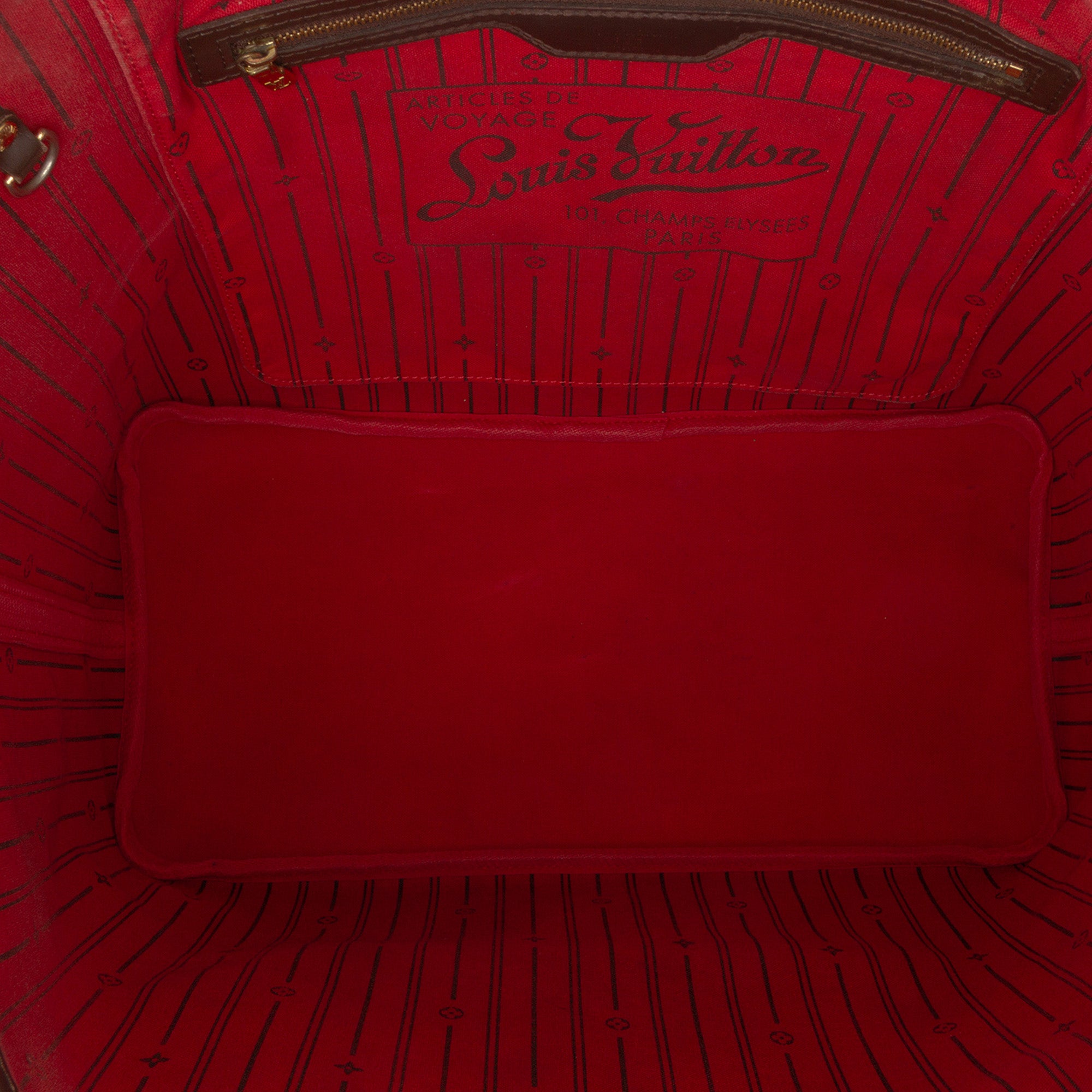 The Neverfull GM features a damier ebene canvas body with leather trim, flat leather shoulder straps, an open top with lobster claw hook closure, and an interior zip pocket. Retail Price: 2030.00