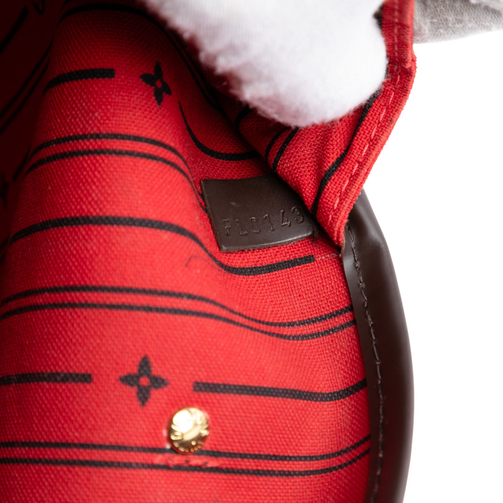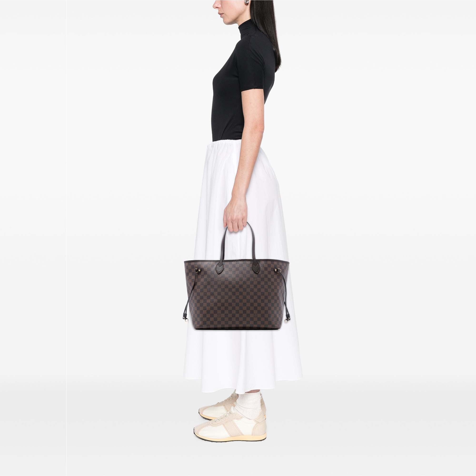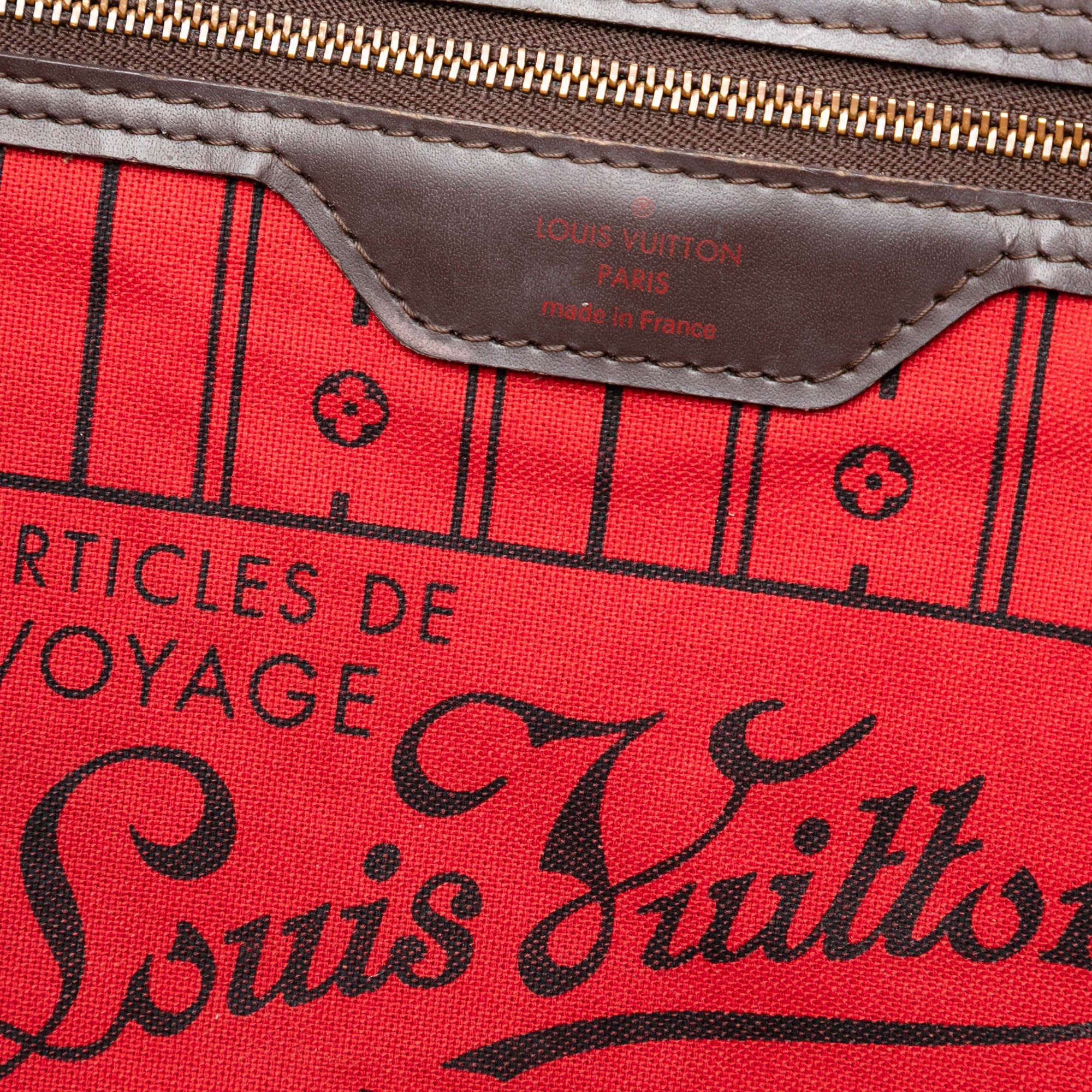 The Neverfull GM features a damier ebene canvas body with leather trim, flat leather shoulder straps, an open top with a lobster clasp closure, and an interior zip pocket. Retail Price: 2030.00