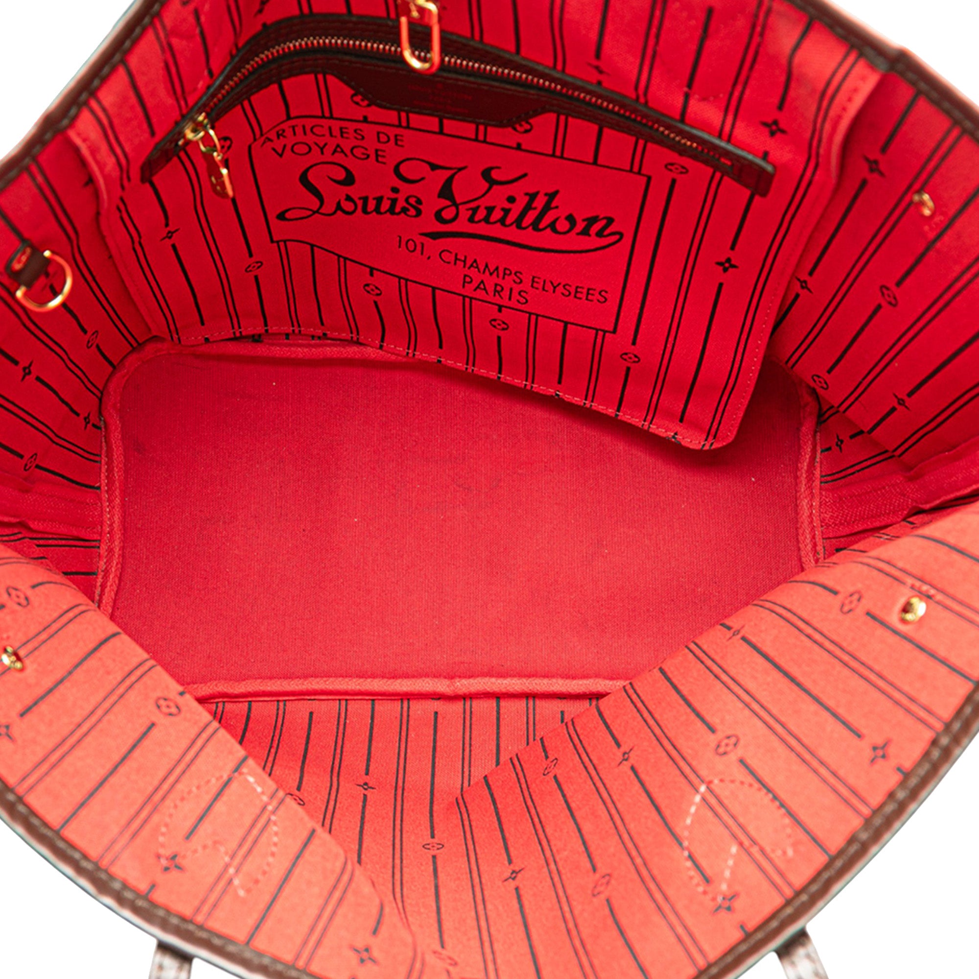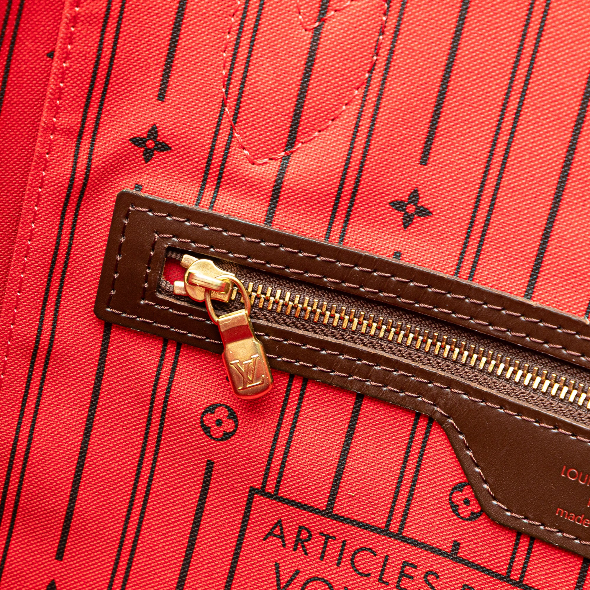 The Neverfull MM features a damier ebene canvas body with leather trim, flat leather shoulder straps, an open top with lobster hook closure, and an interior zip pocket. Retail Price: 1875.00
