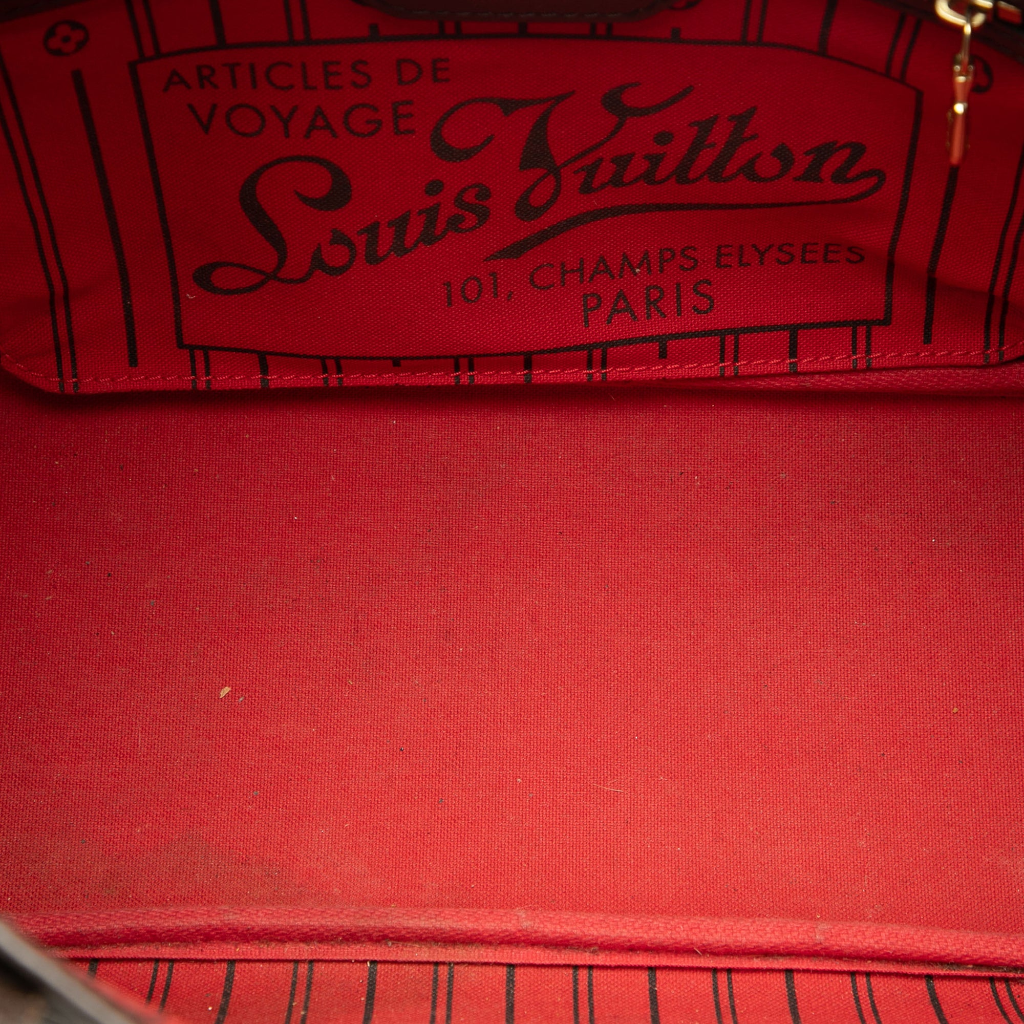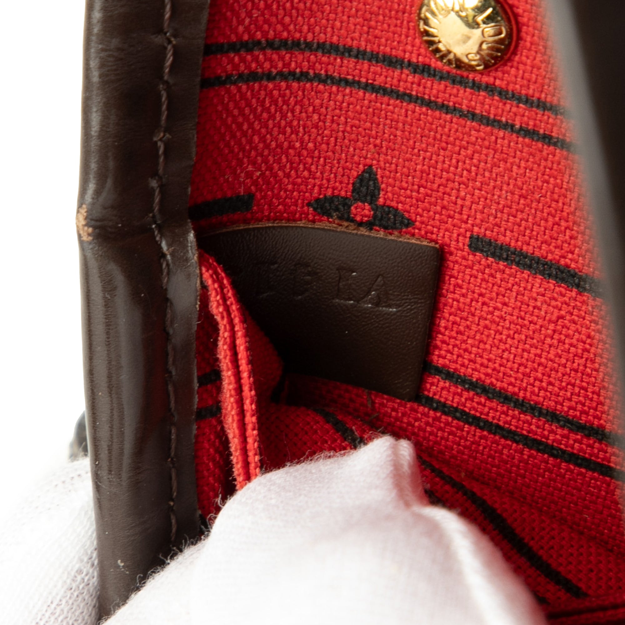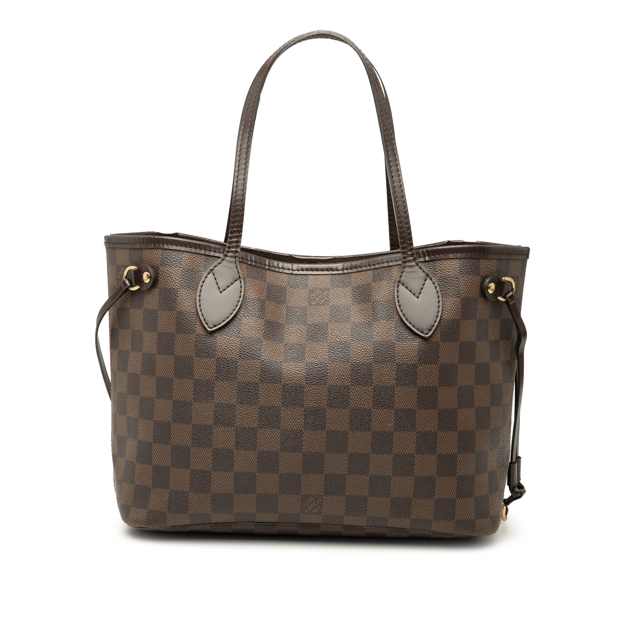 The Neverfull PM features a damier ebene canvas body with leather trim, flat leather straps, an open top with lobster clasp closure, and an interior zip pocket. Retail Price: 1959.00