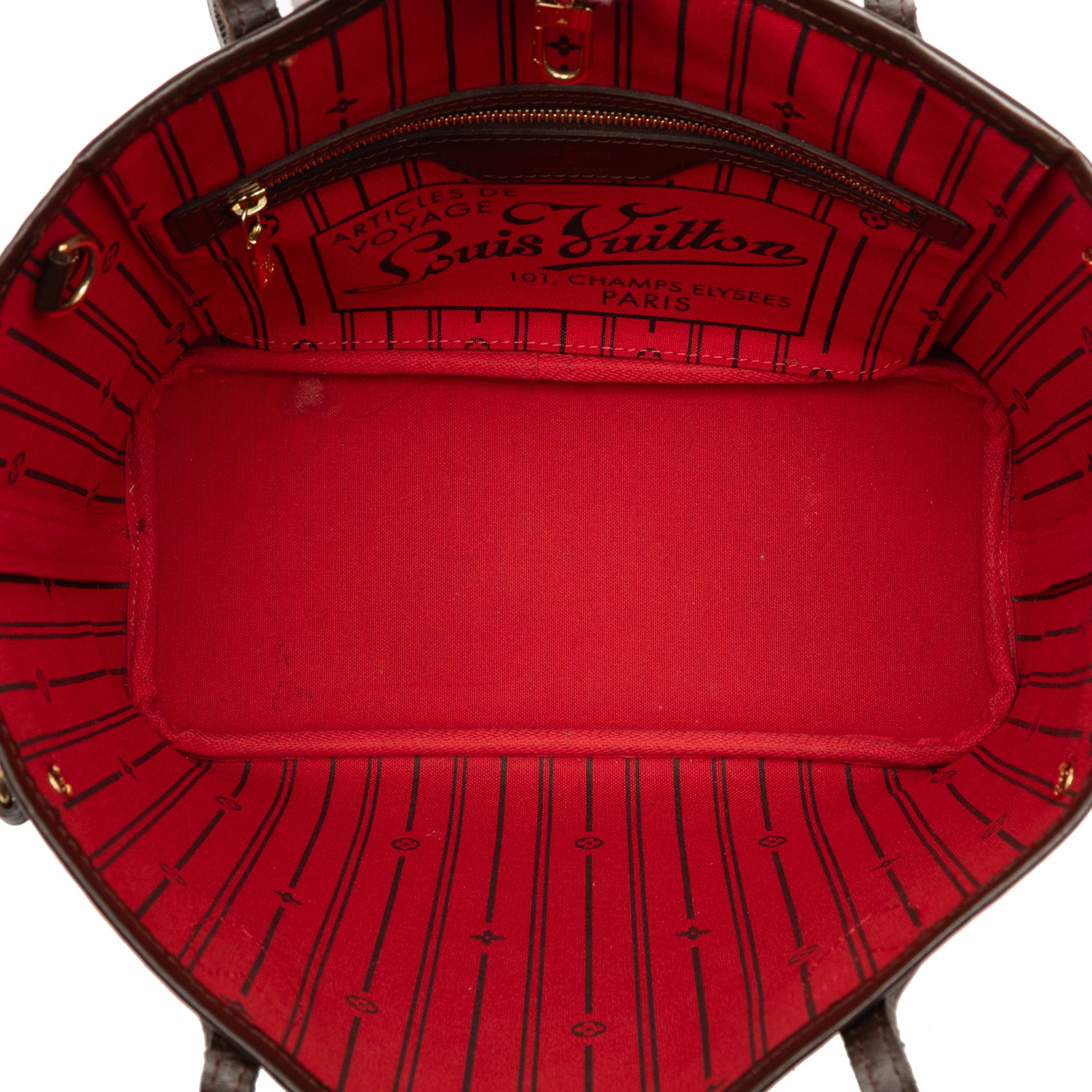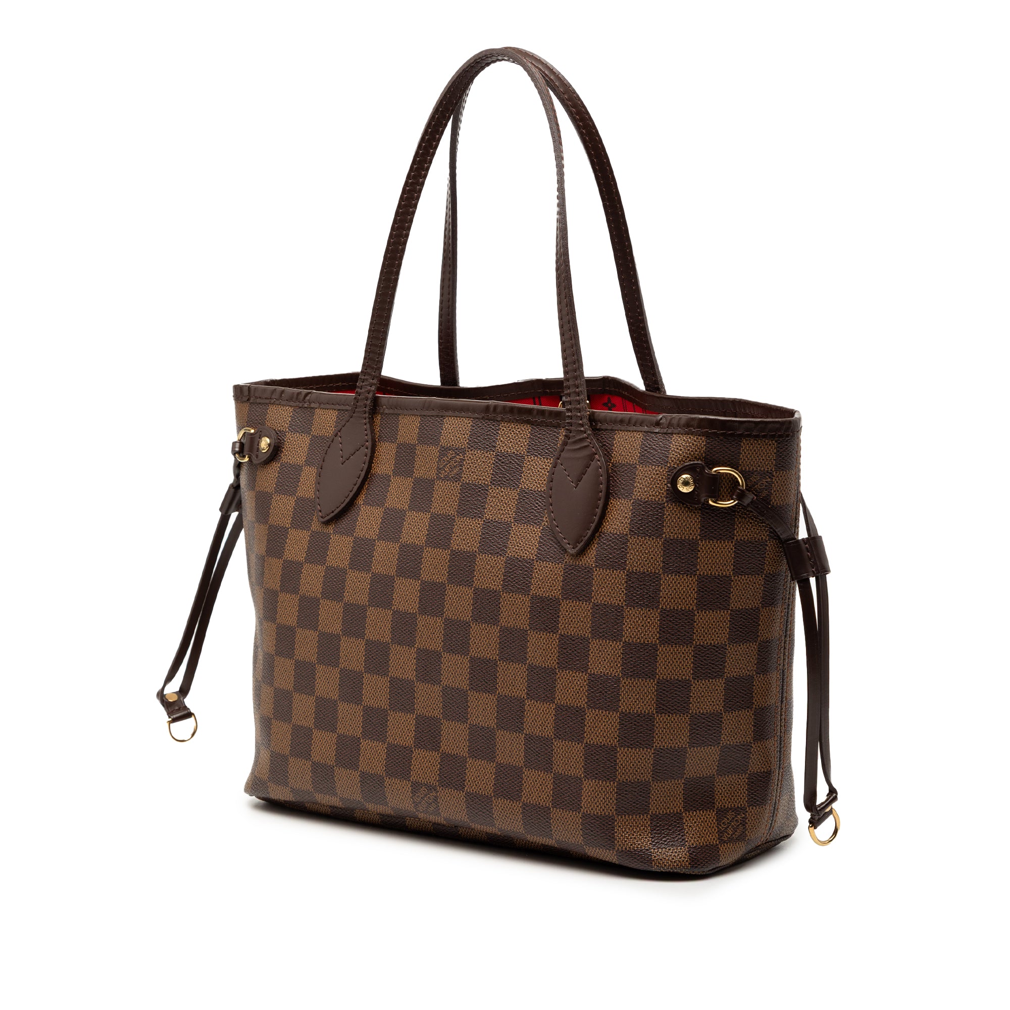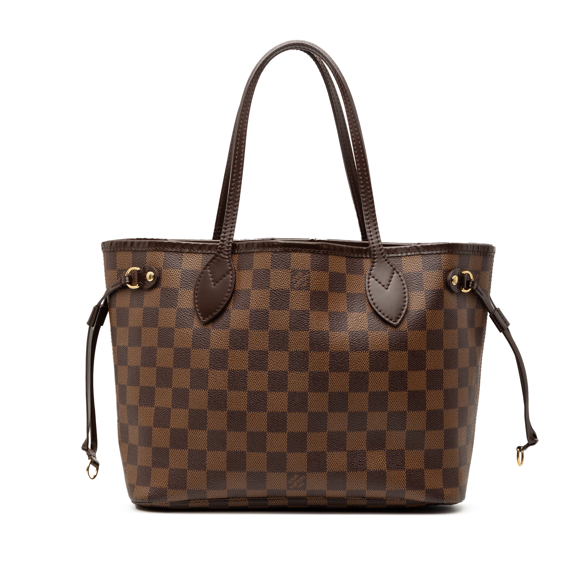 The Neverfull PM features a damier ebene canvas body with leather trim, flat leather straps, an open top with a lobster clasp closure, and an interior zip pocket. Retail Price: 1959.00