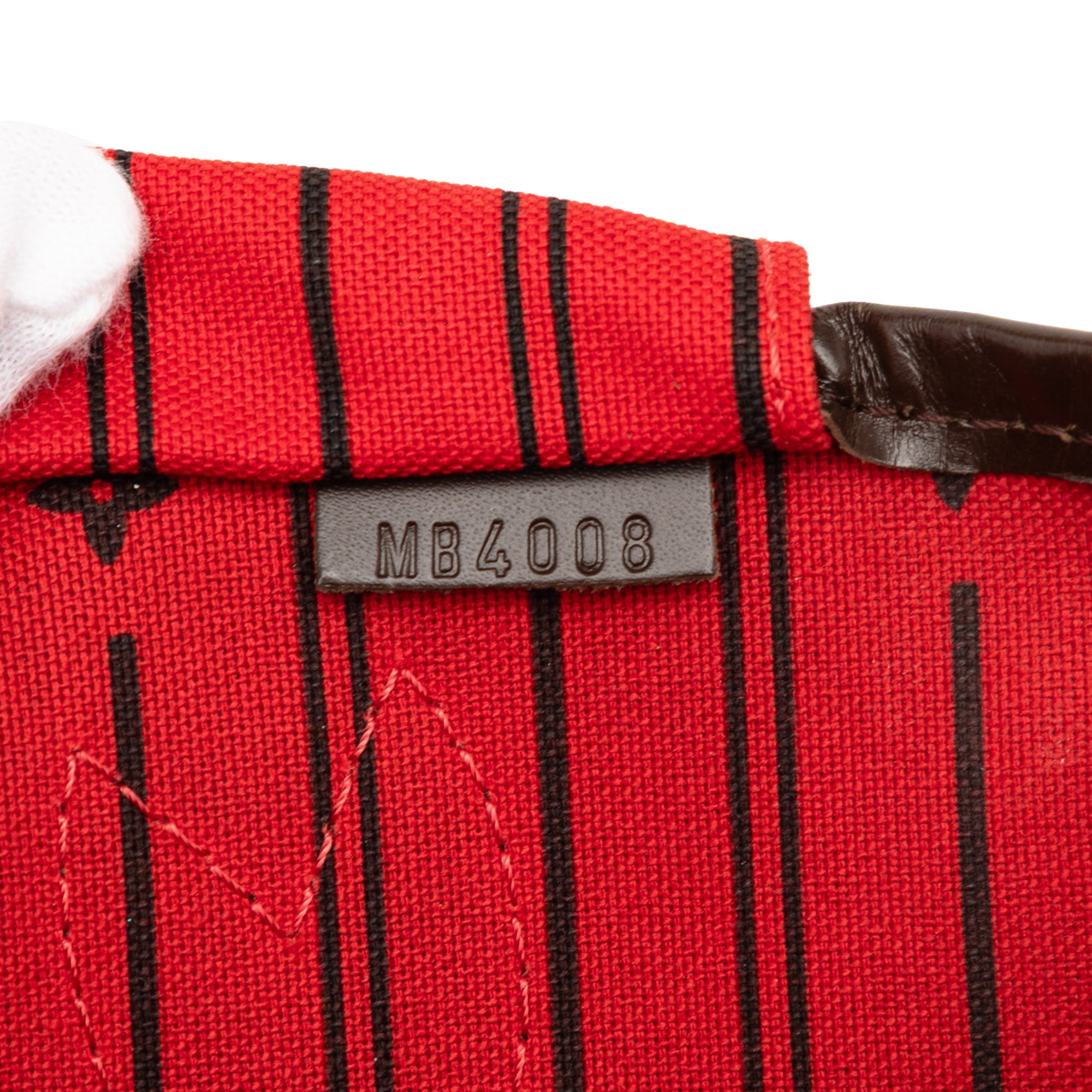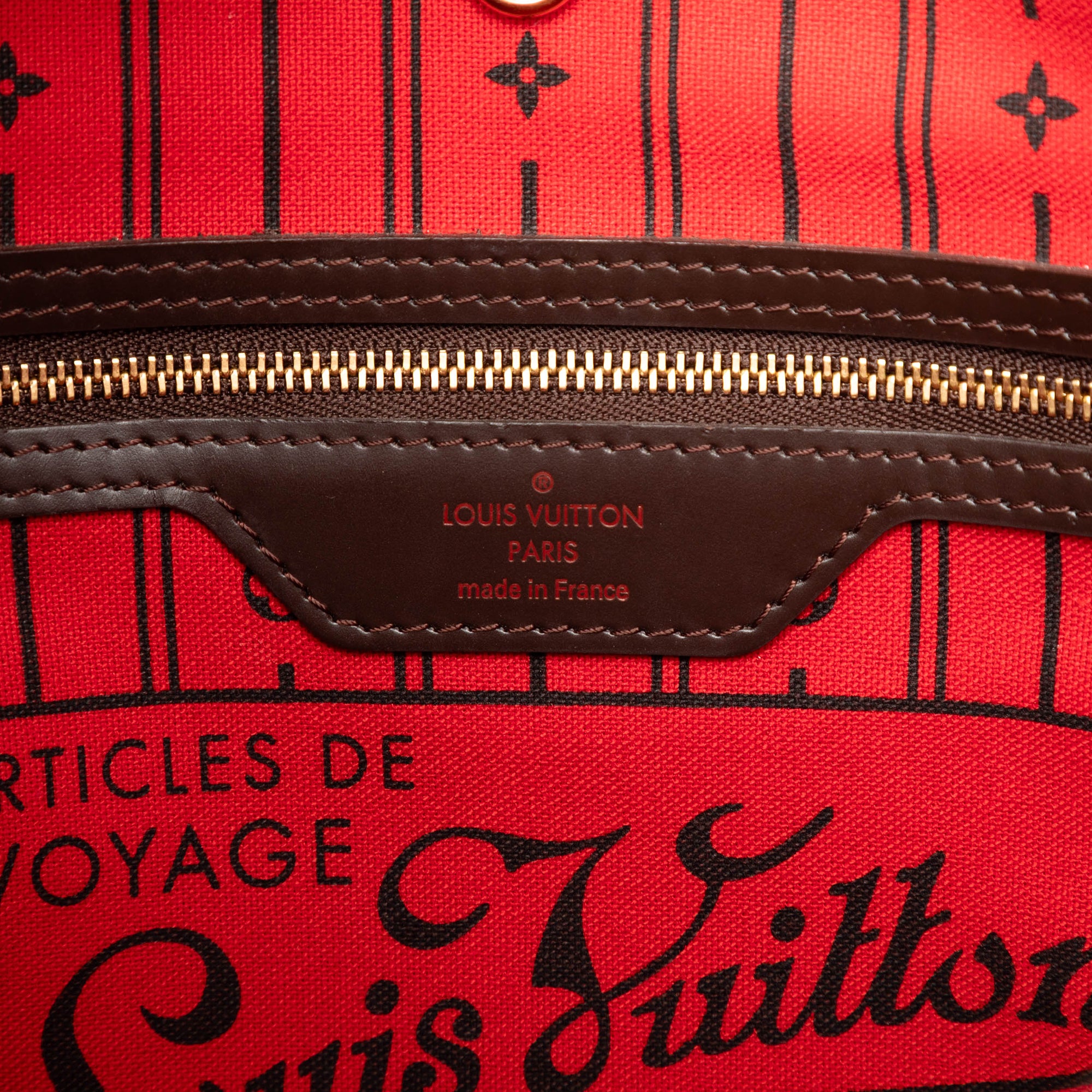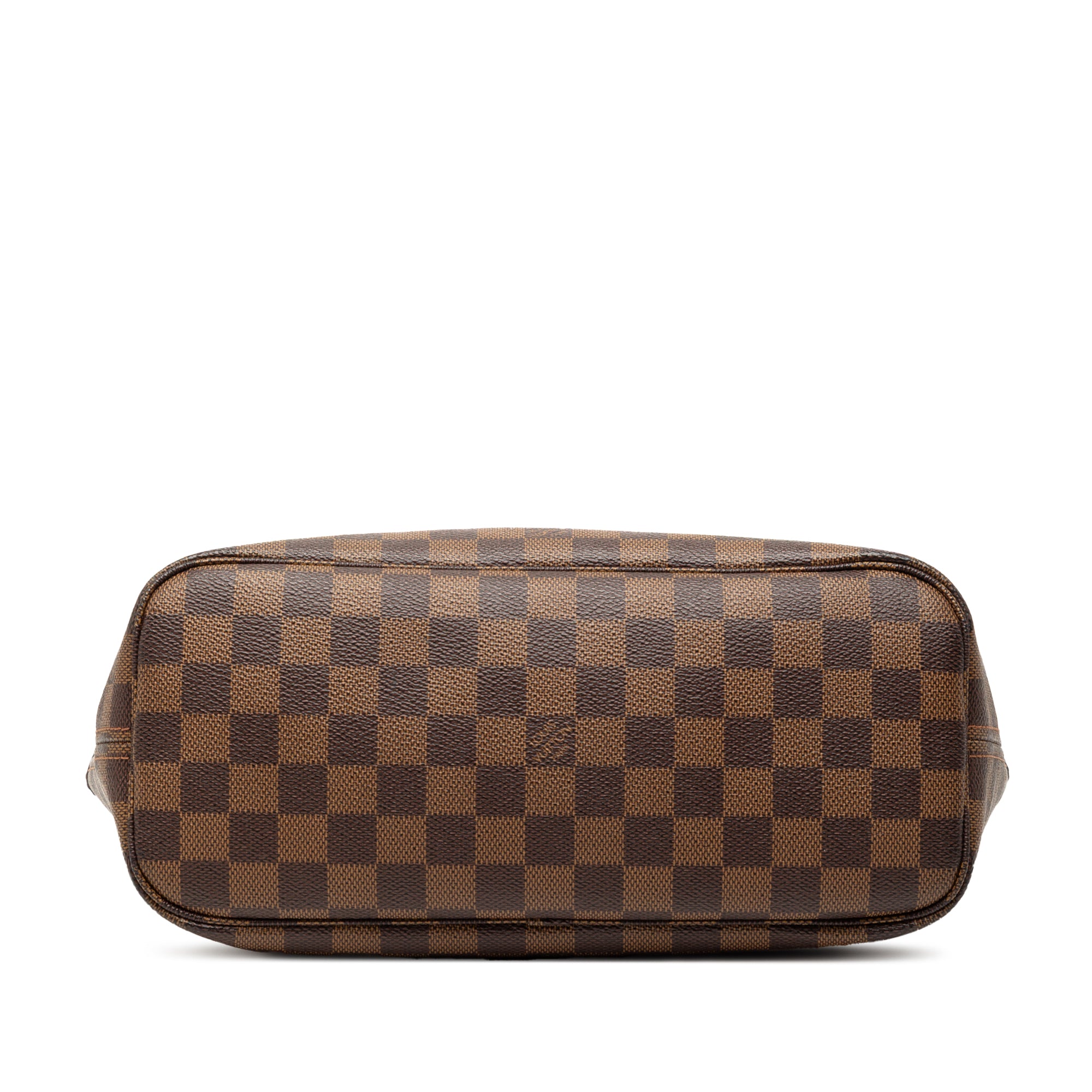 The Neverfull PM features a damier ebene canvas body with leather trim, flat leather straps, an open top with a lobster clasp closure, and an interior zip pocket. Retail Price: 1959.00