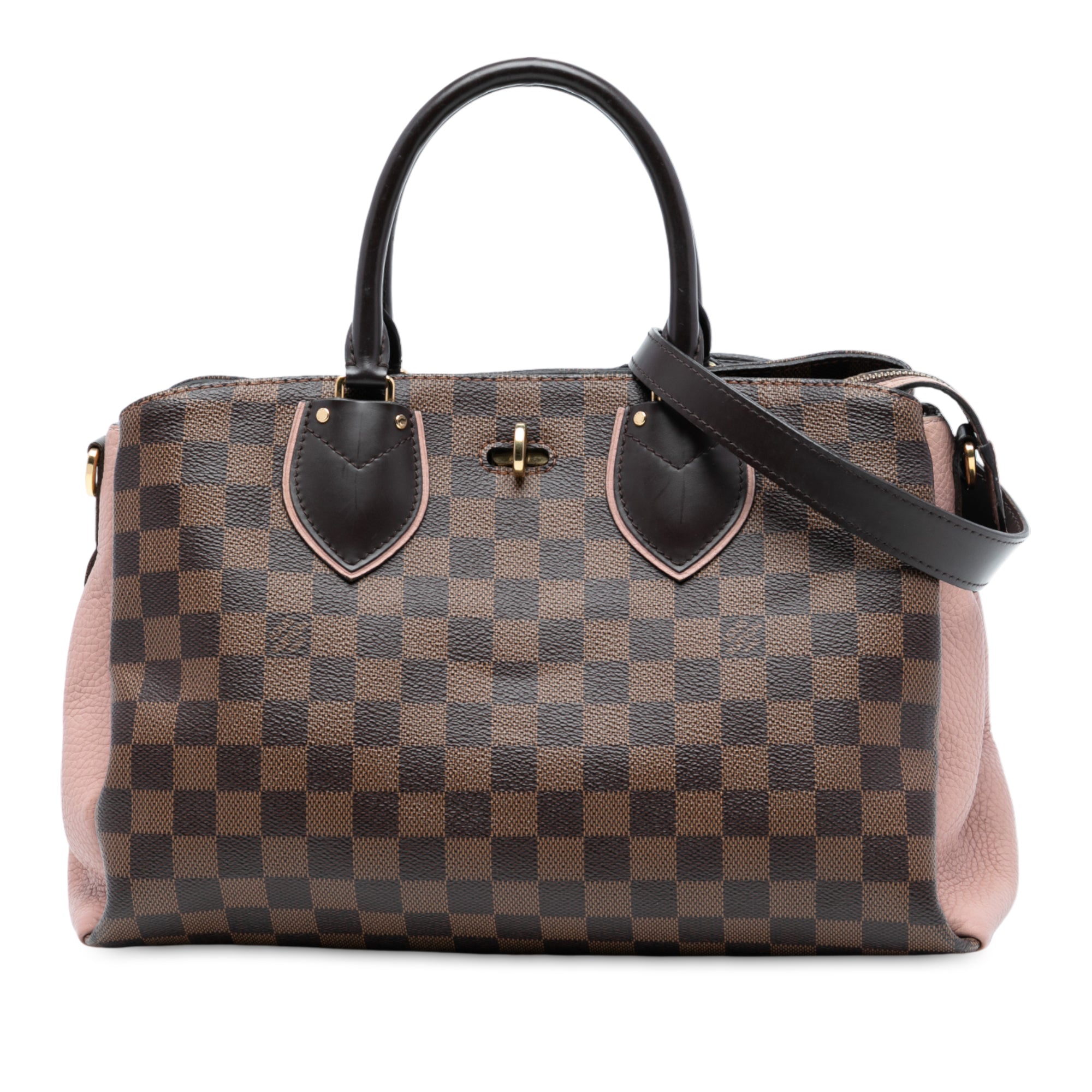 The Normandy features a damier ebene canvas body with leather side panels, rolled leather handles, a detachable flat leather strap, a top zip closure, exterior slip compartments with magnetic and twist lock closures, and interior slip pockets. Retail Price: 2960.00