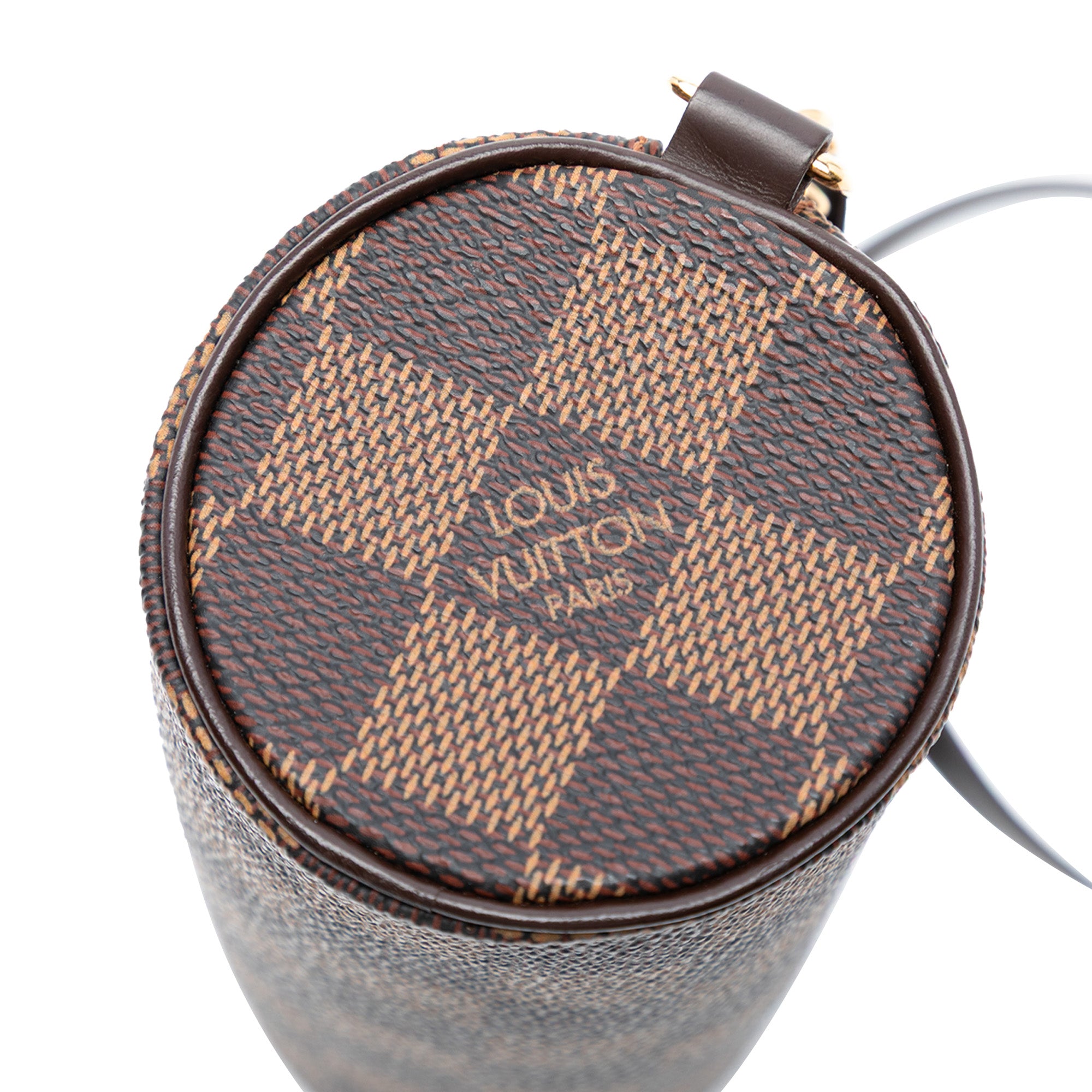 The Papillon Pochette features a damier ebene canvas body, a detachable leather strap, and a top zip closure. Retail Price: 830.00