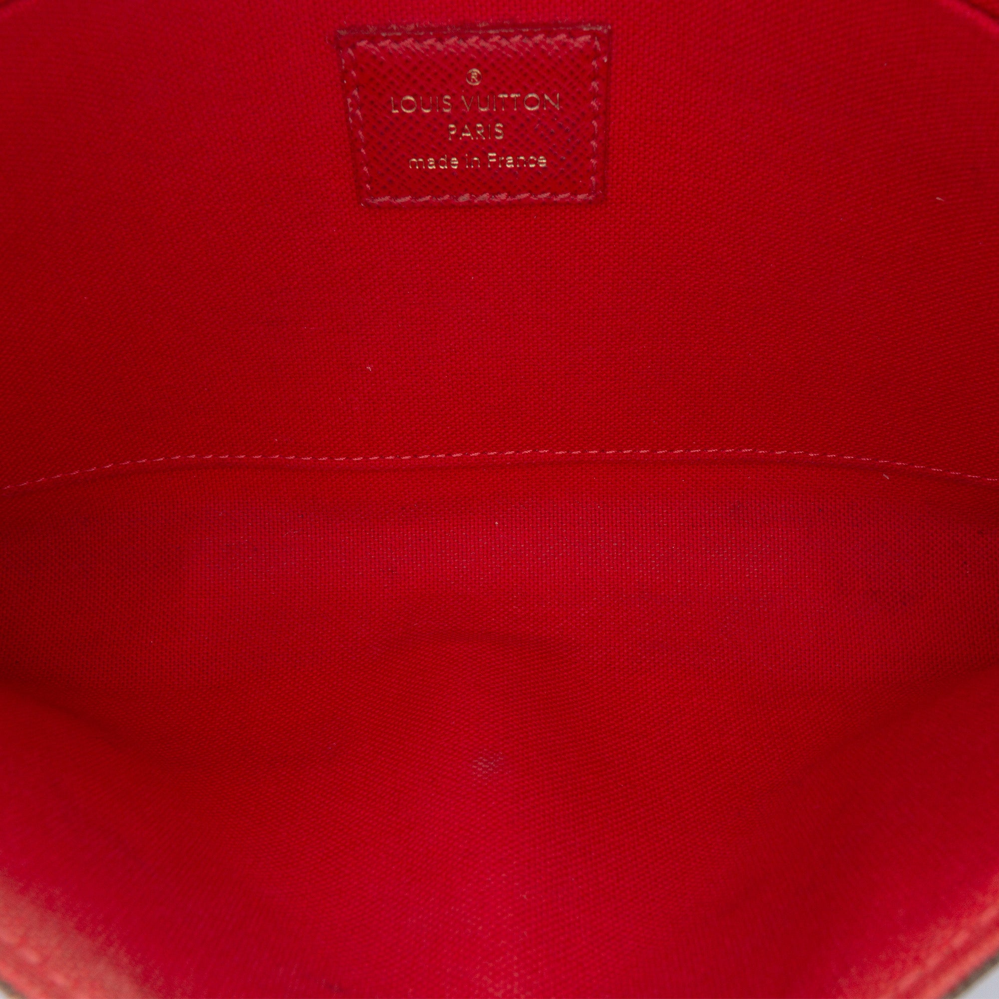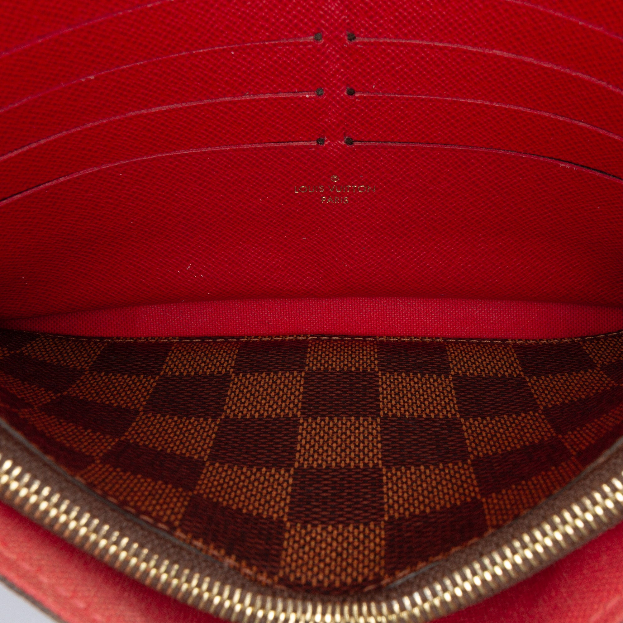 The Pochette Felicie features a damier ebene canvas body, a detachable chain link shoulder strap, a flap with a snap button closure, an interior slip pocket, and pouch inclusions. Inclusion: Dust bag, box. Retail Price: 1790.00