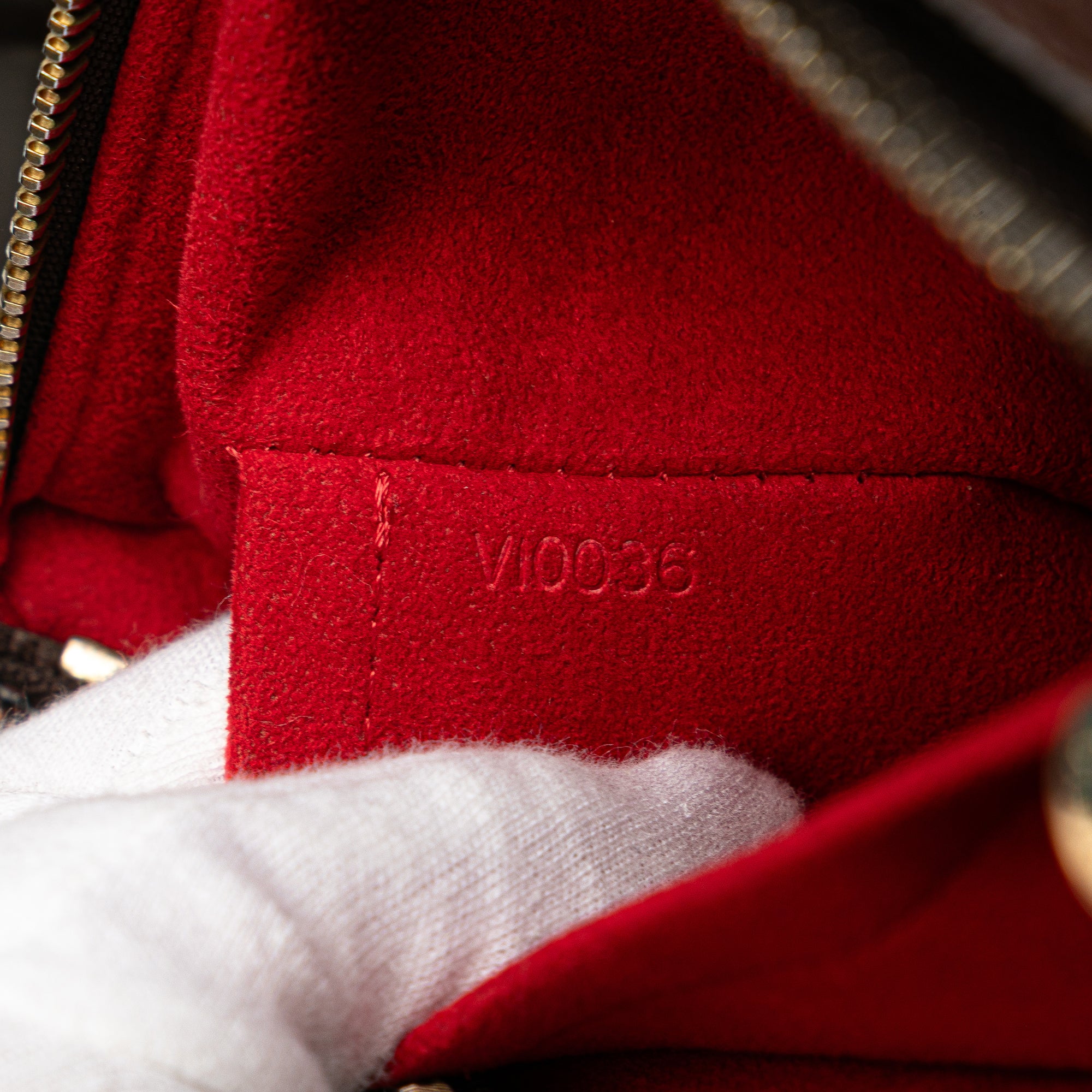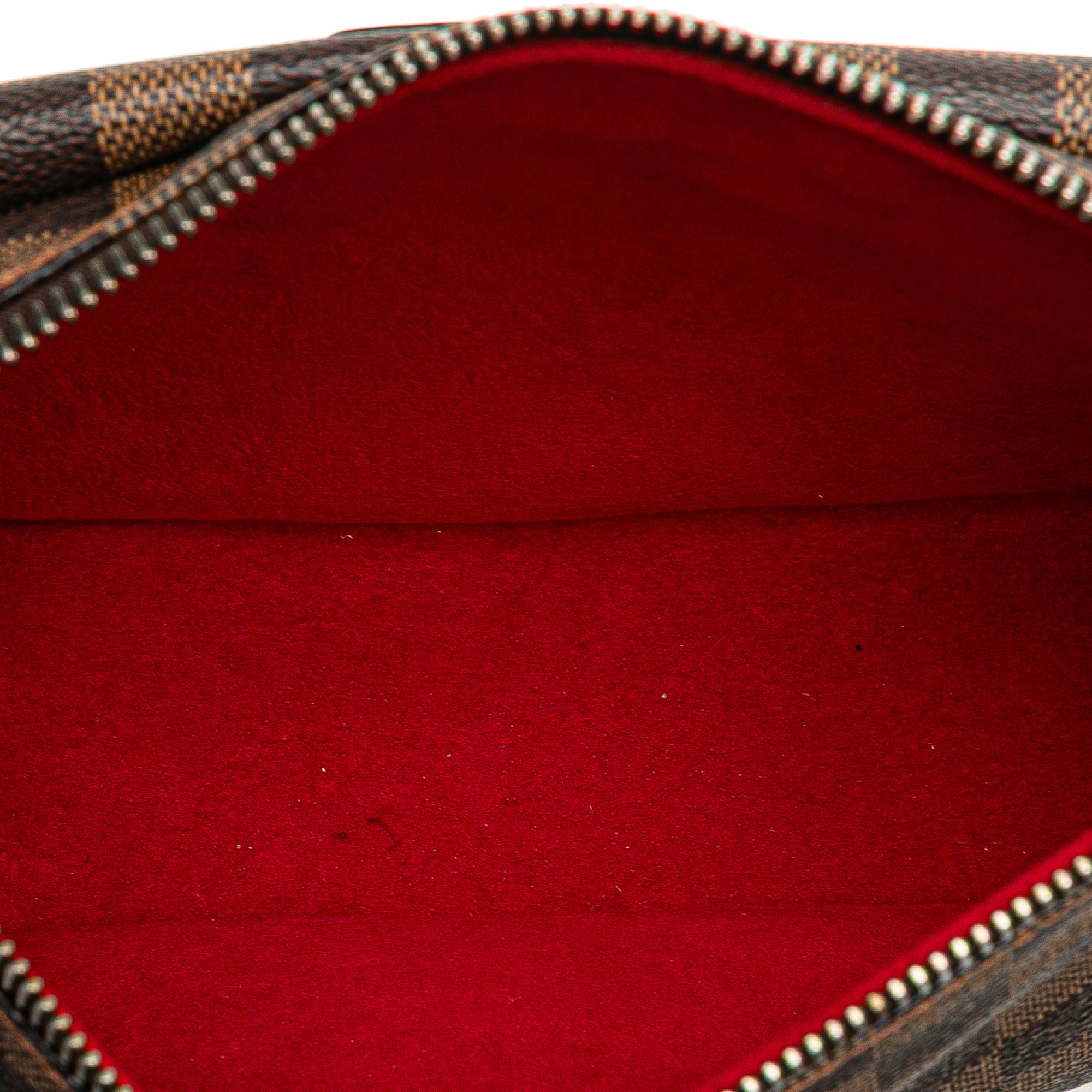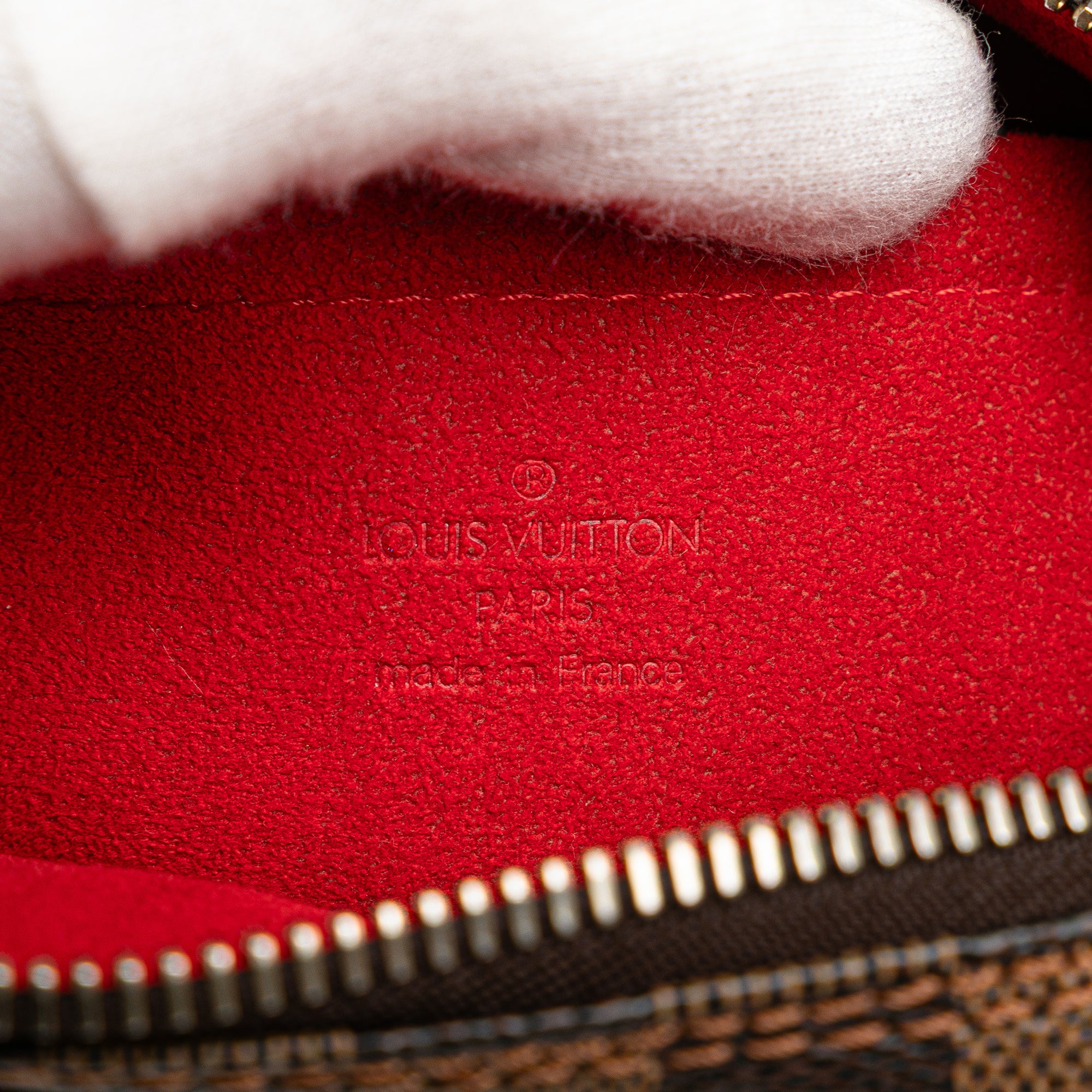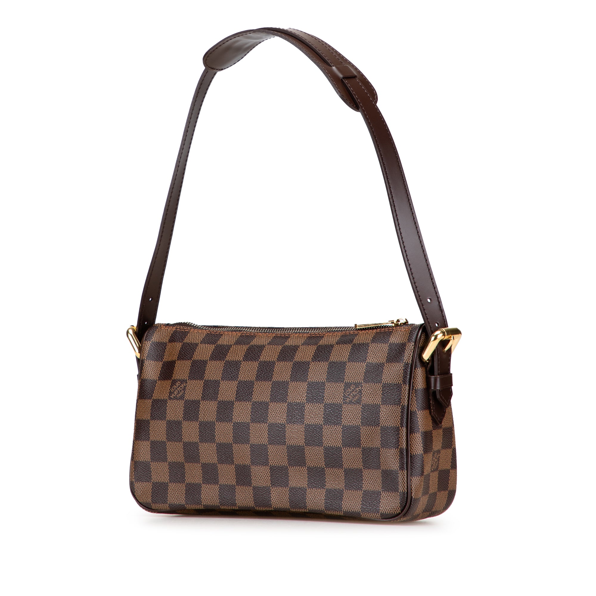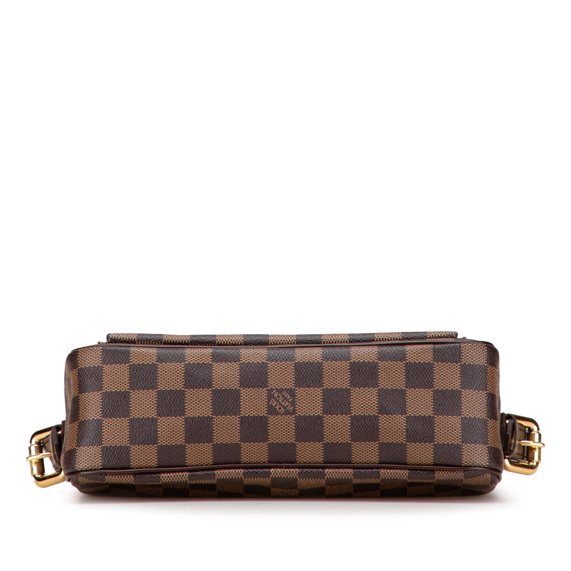 The Ravello GM features a damier ebene canvas body with leather trim, a flat leather shoulder strap, a top zip closure, a front flap pocket with a push lock closure, and an interior slip pocket. Retail Price: 1260.00