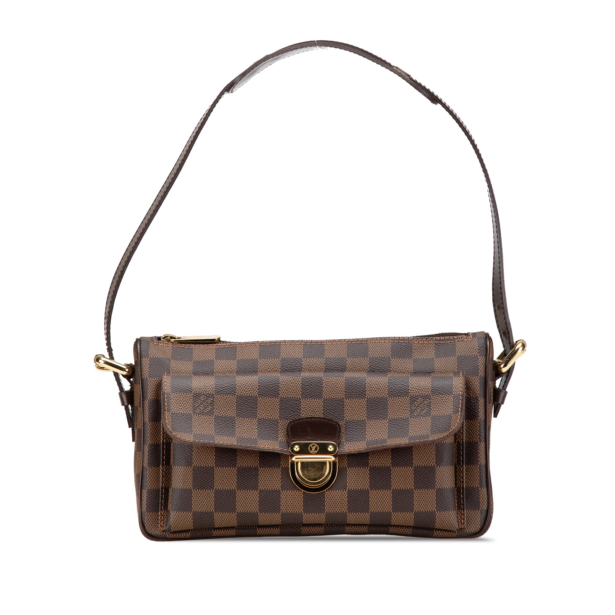 The Ravello GM features a damier ebene canvas body with leather trim, a flat leather shoulder strap, a top zip closure, a front flap pocket with a push lock closure, and an interior slip pocket. Retail Price: 1105.00