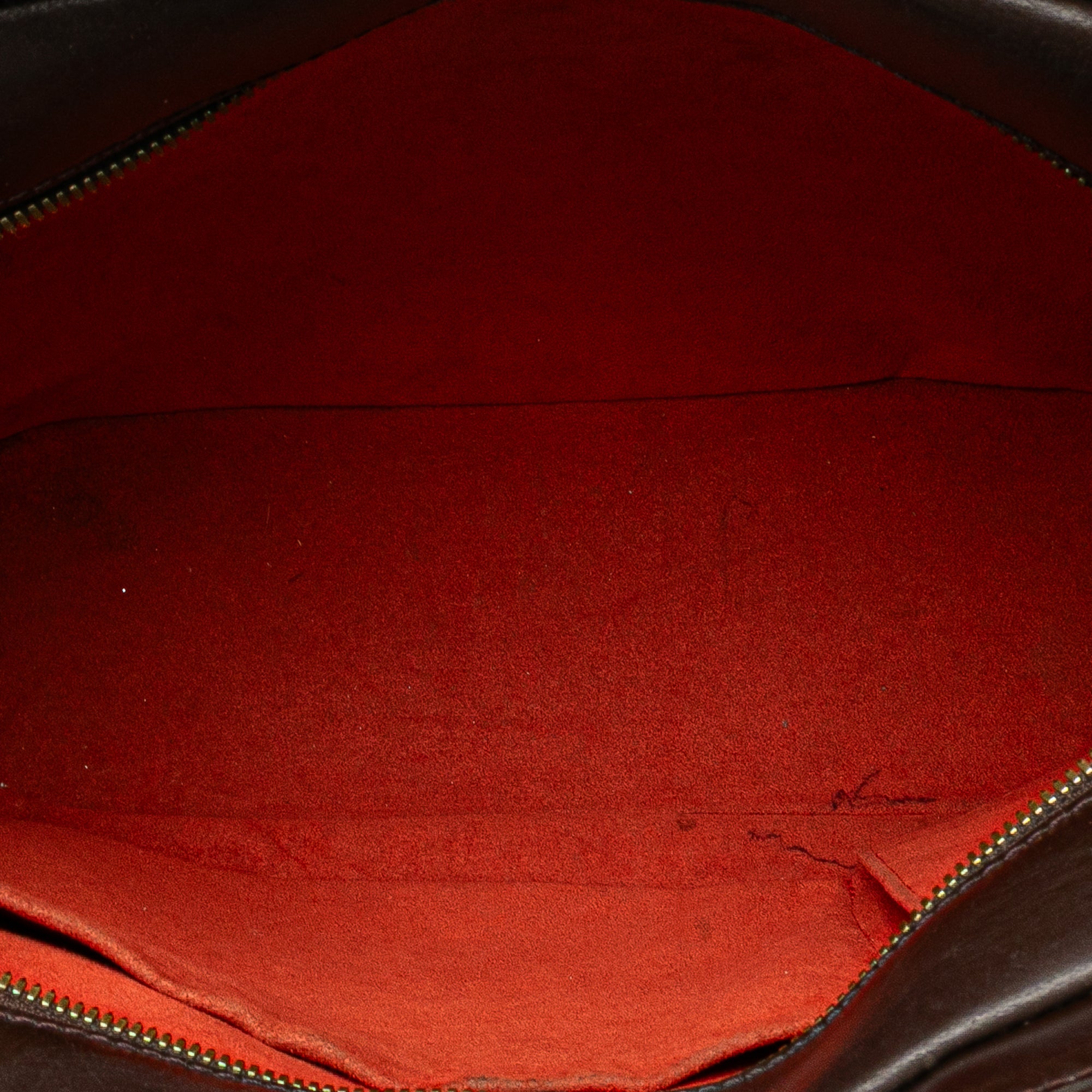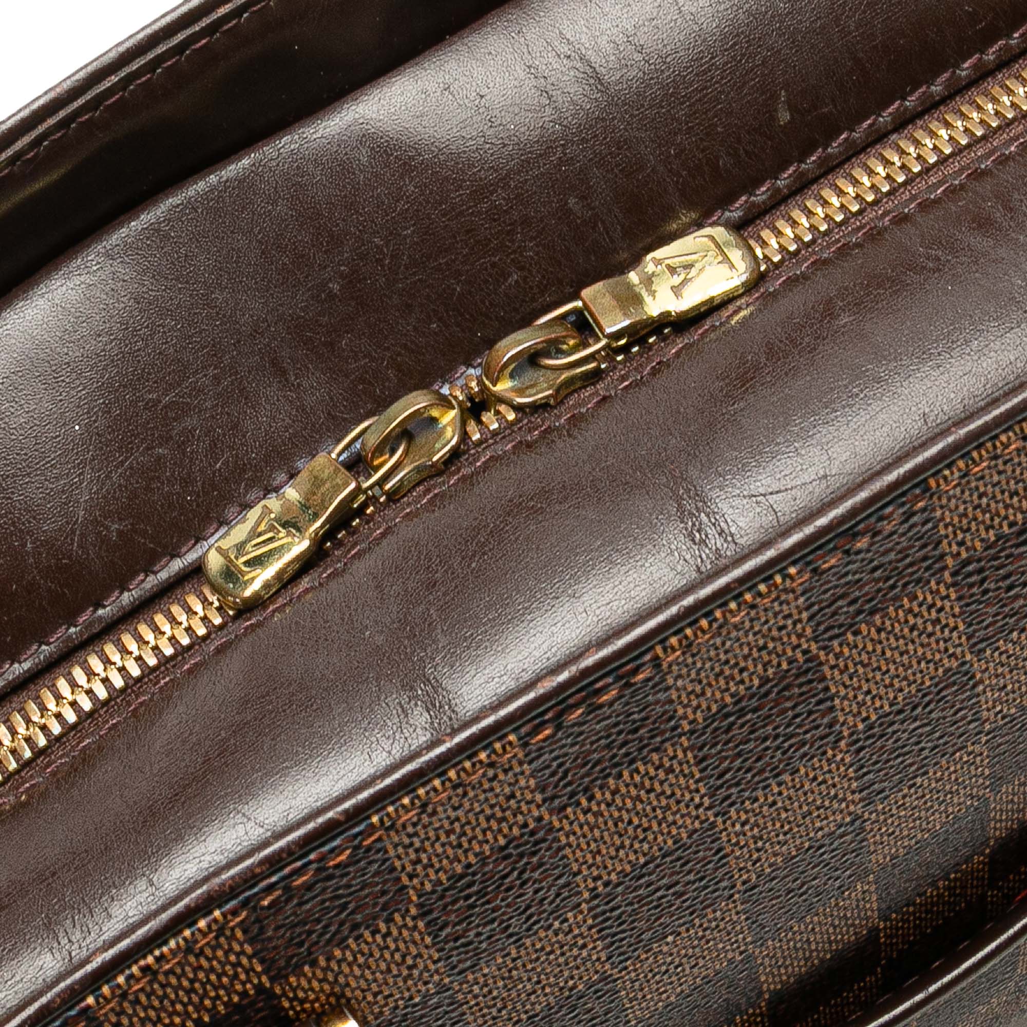 The Sarria Horizontal features a damier ebene canvas body with leather trim, rolled leather handles, a top zip closure, an exterior open pocket, and interior slip pockets. Retail Price: 1350.00