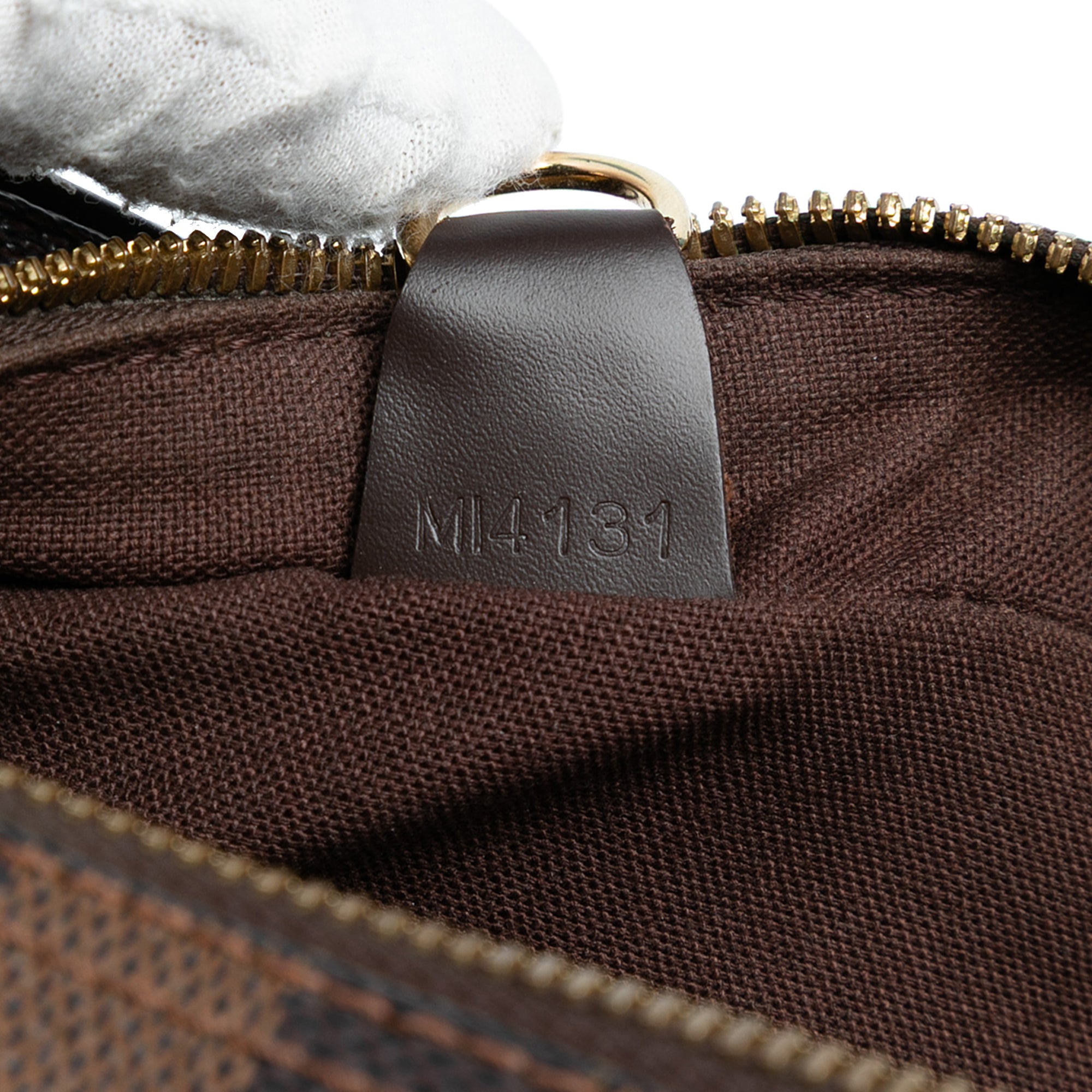 The Shelton GM features a damier ebene canvas body with leather trim, an adjustable flat canvas strap, a front flap with magnetic snap closure, a top zip closure, and interior slip pockets. Retail Price: 1970.00