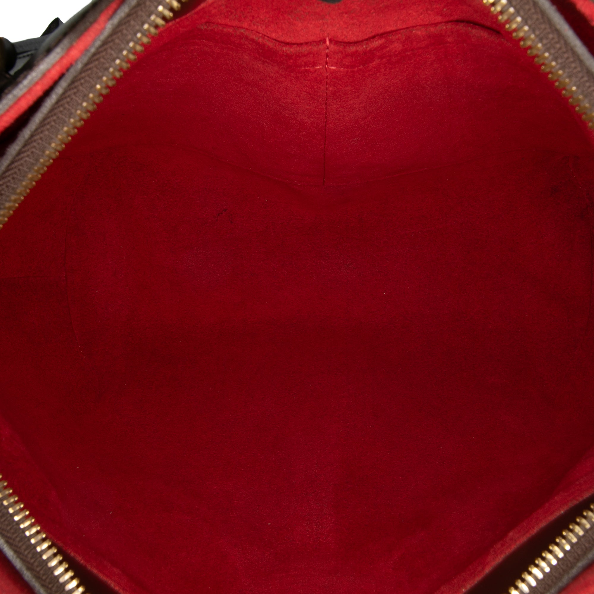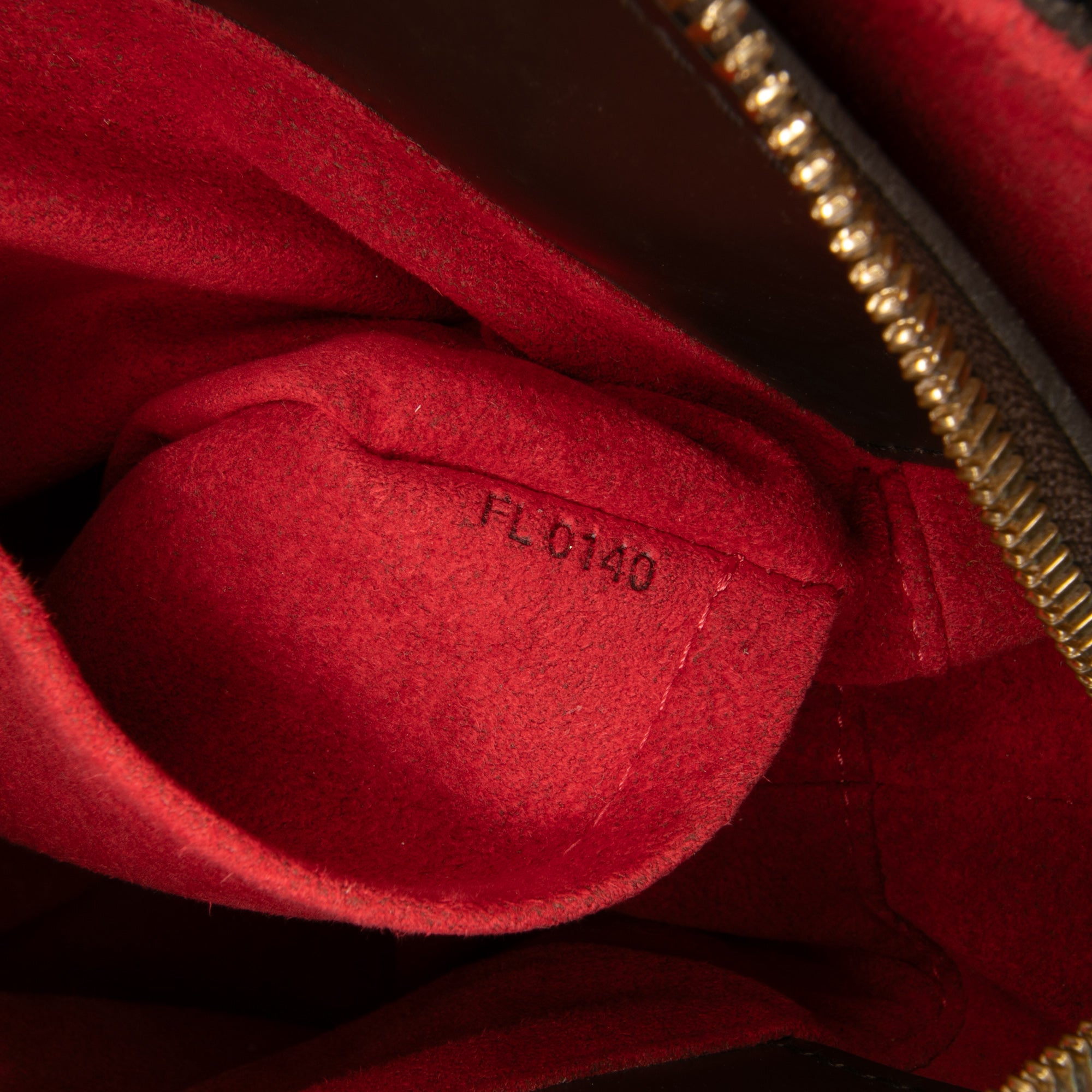 The Sistina PM features a damier ebene canvas body with leather trim, flat leather handles, a front strap with push lock closure, an interior zip compartment, and interior open pockets. Retail Price: 2380.00