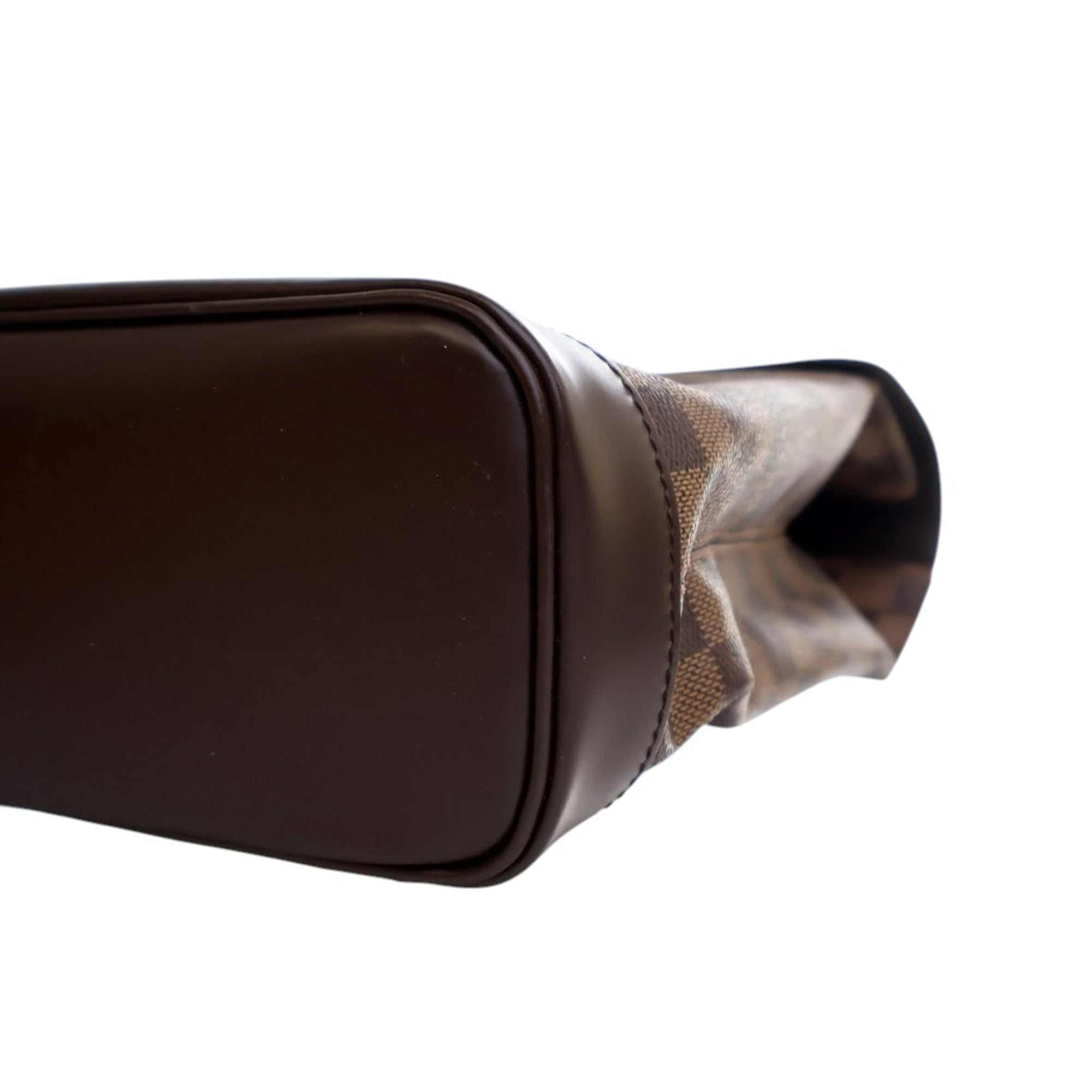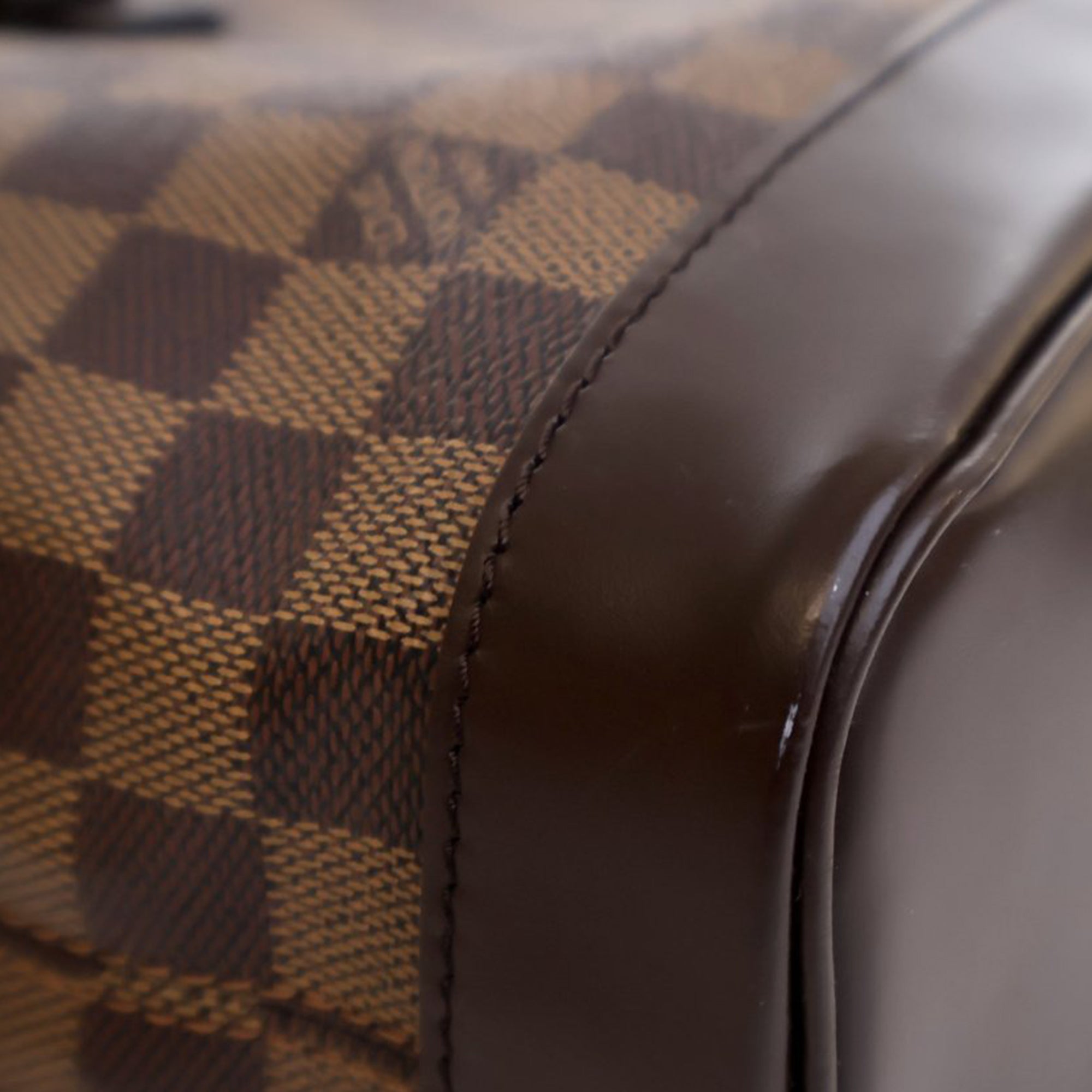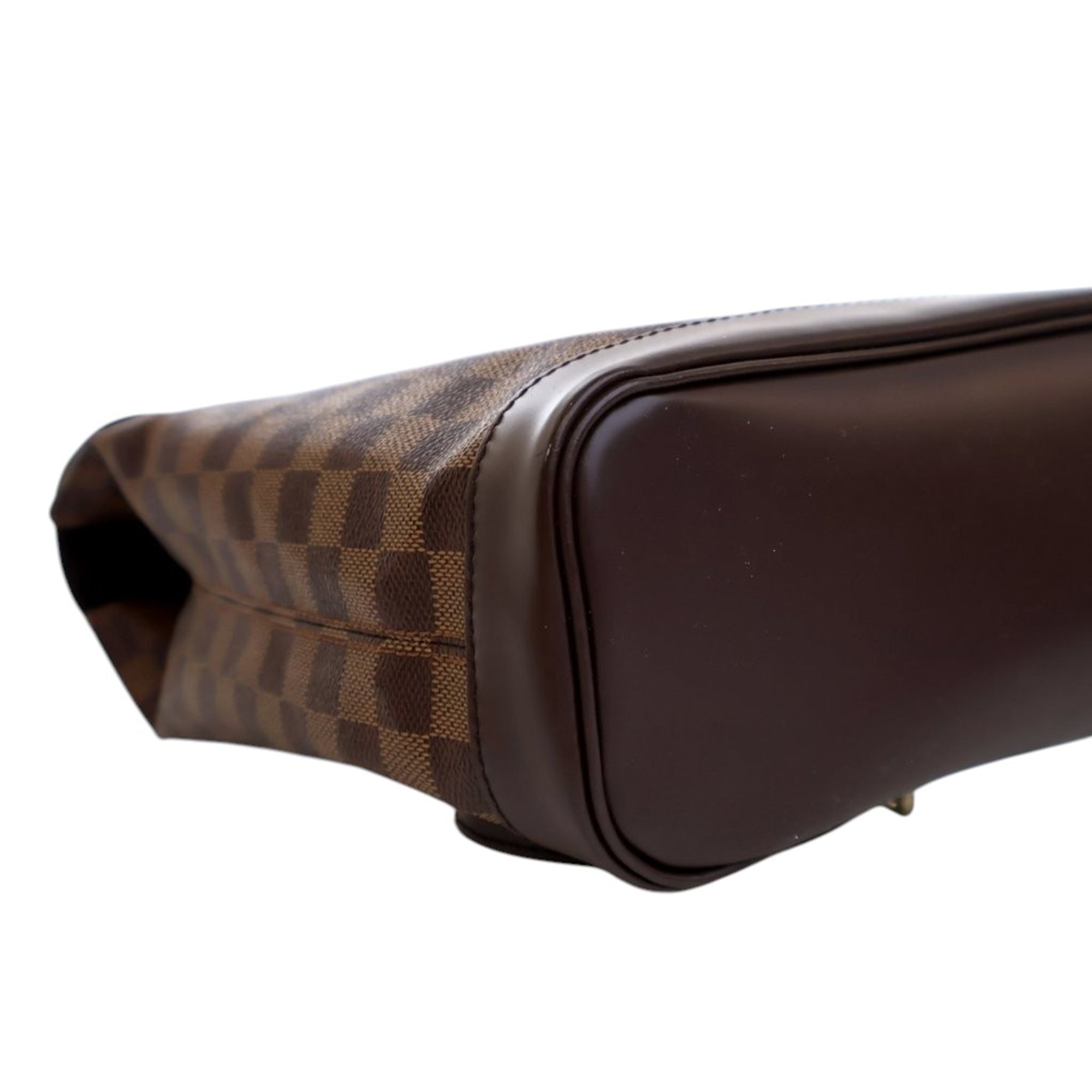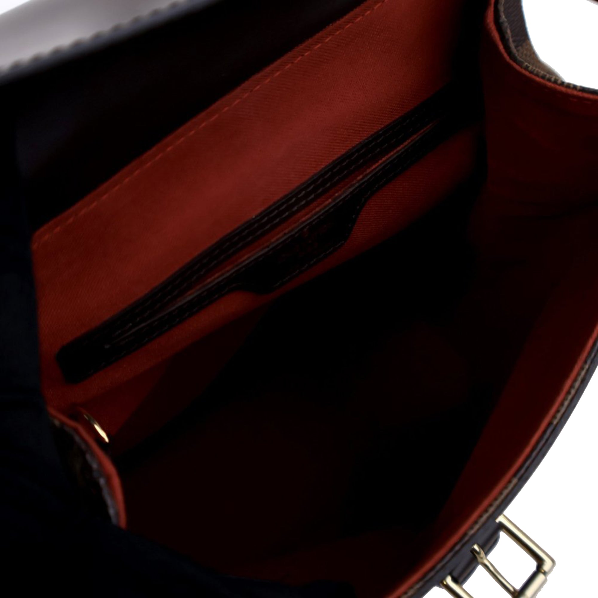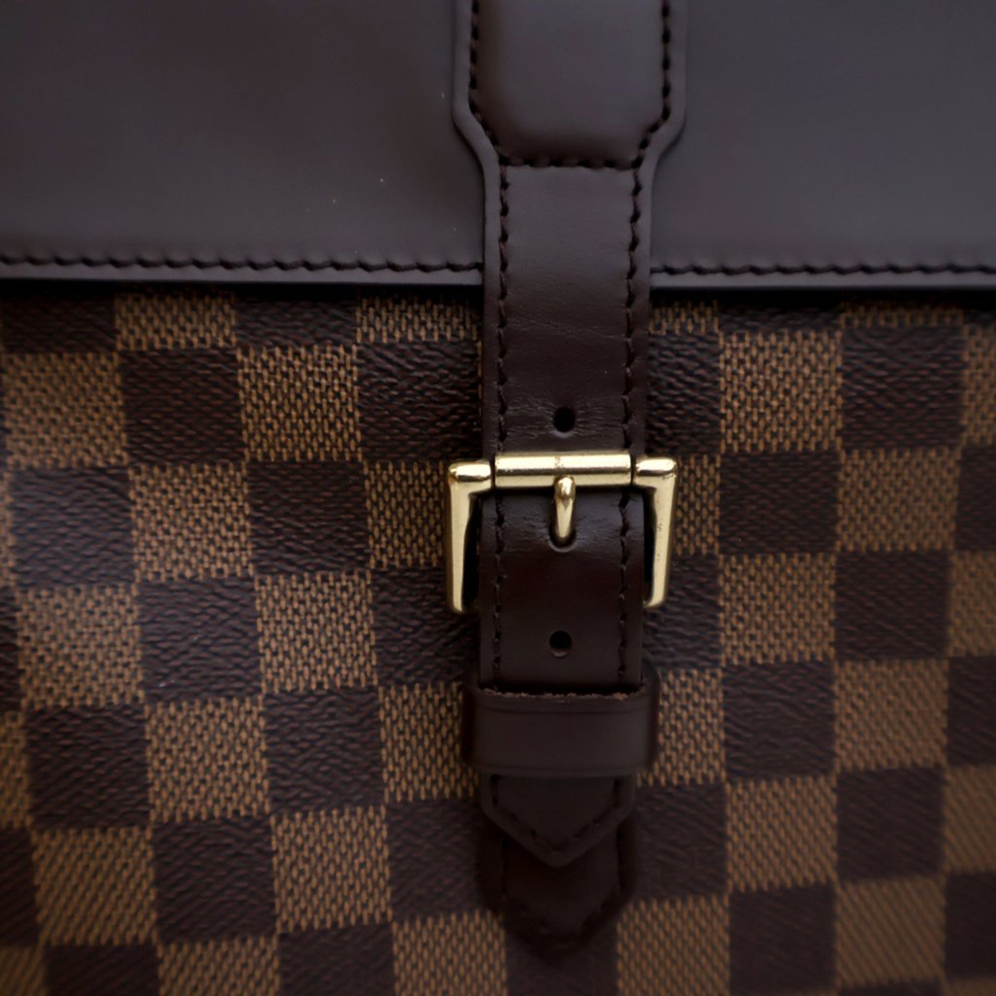 The Soho Backpack features a damier ebene canvas body, rolled leather handle, flat leather back straps, top flap with buckle closure, and interior slip pocket. Retail Price: 1250.00