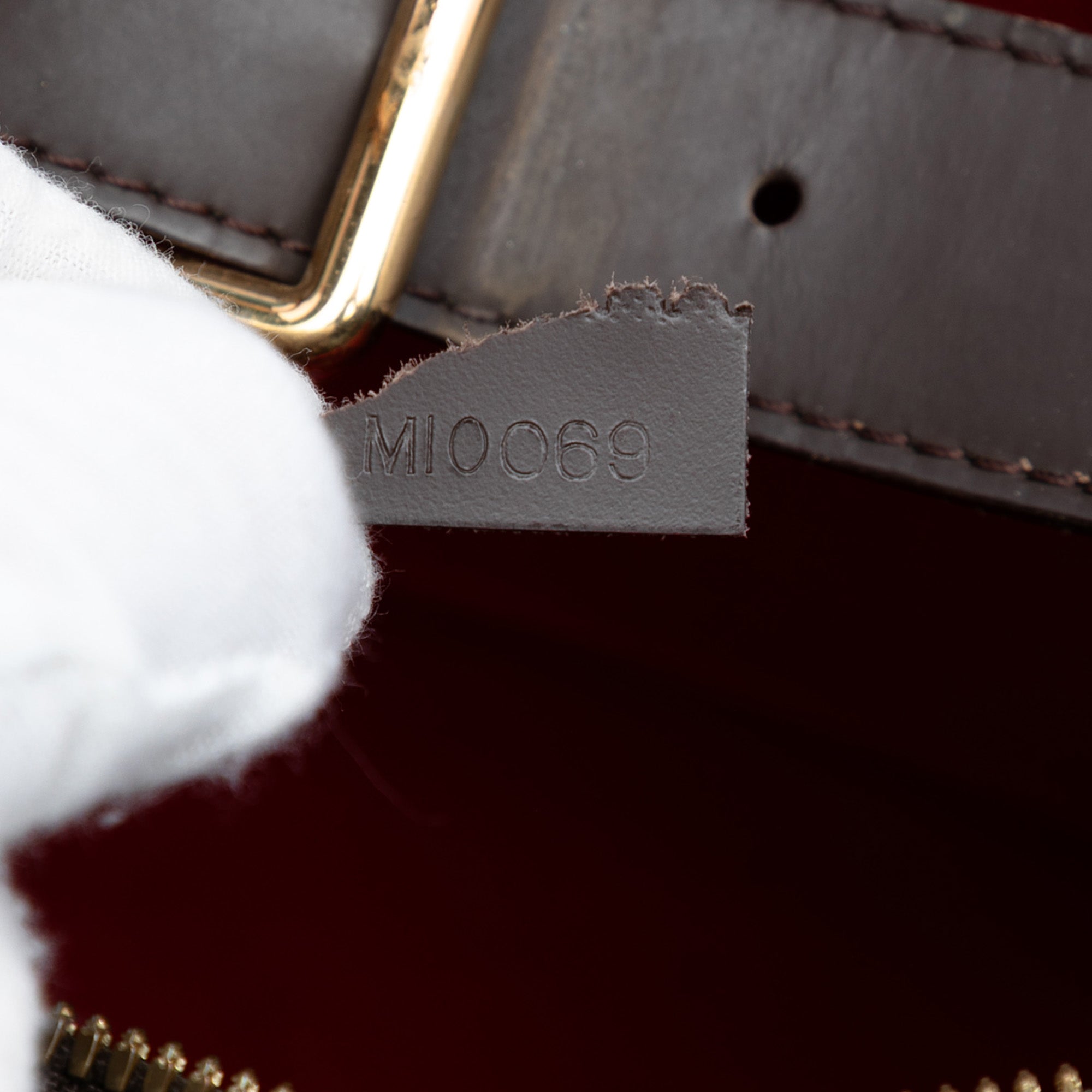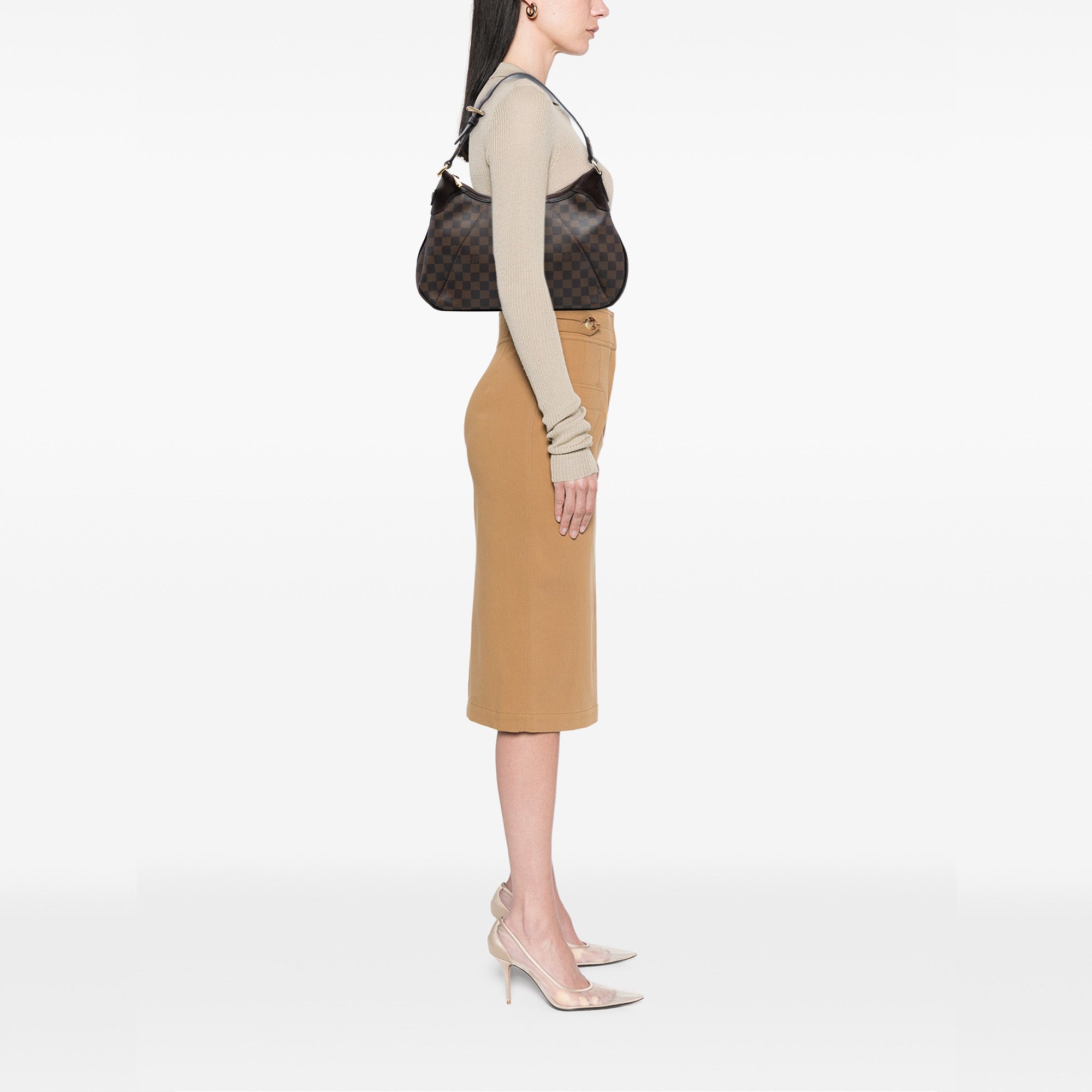 The Thames GM features a damier ebene canvas body with leather trim, a flat leather strap, a top zip closure, and interior slip pockets. Retail Price: 1450.00