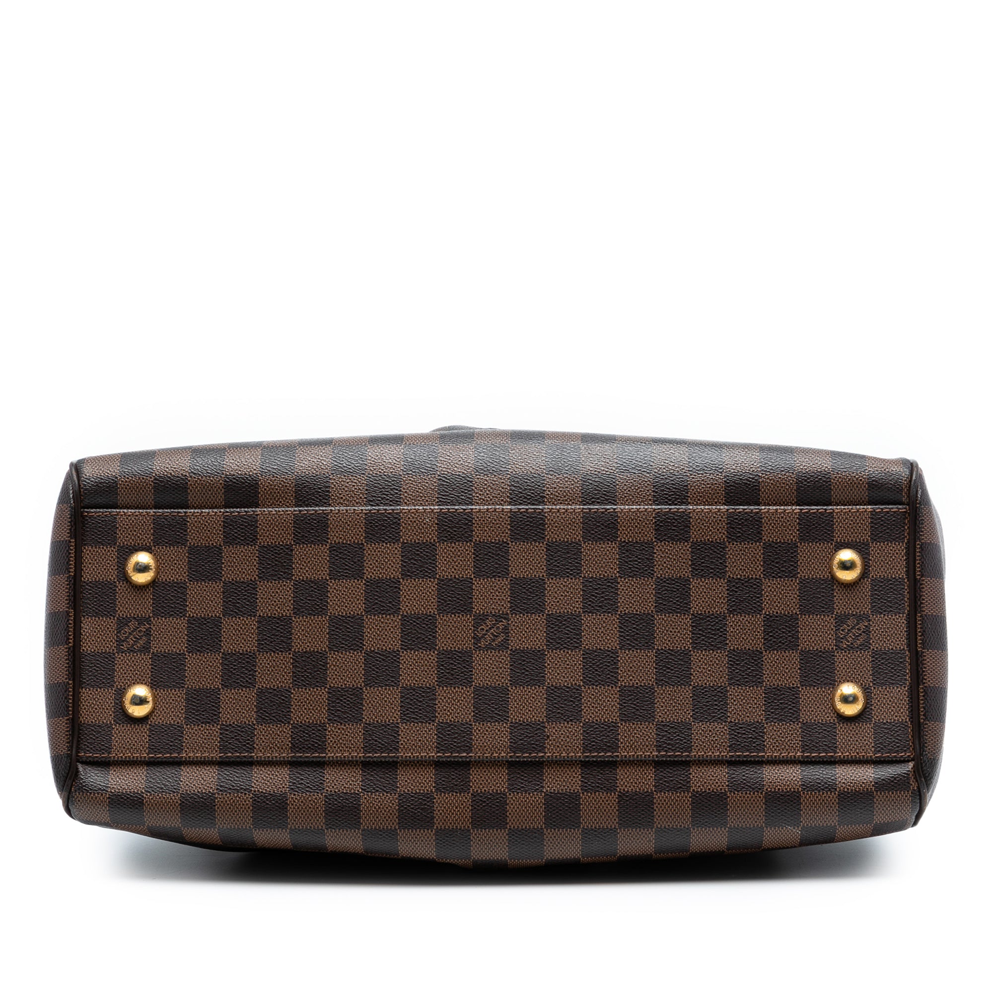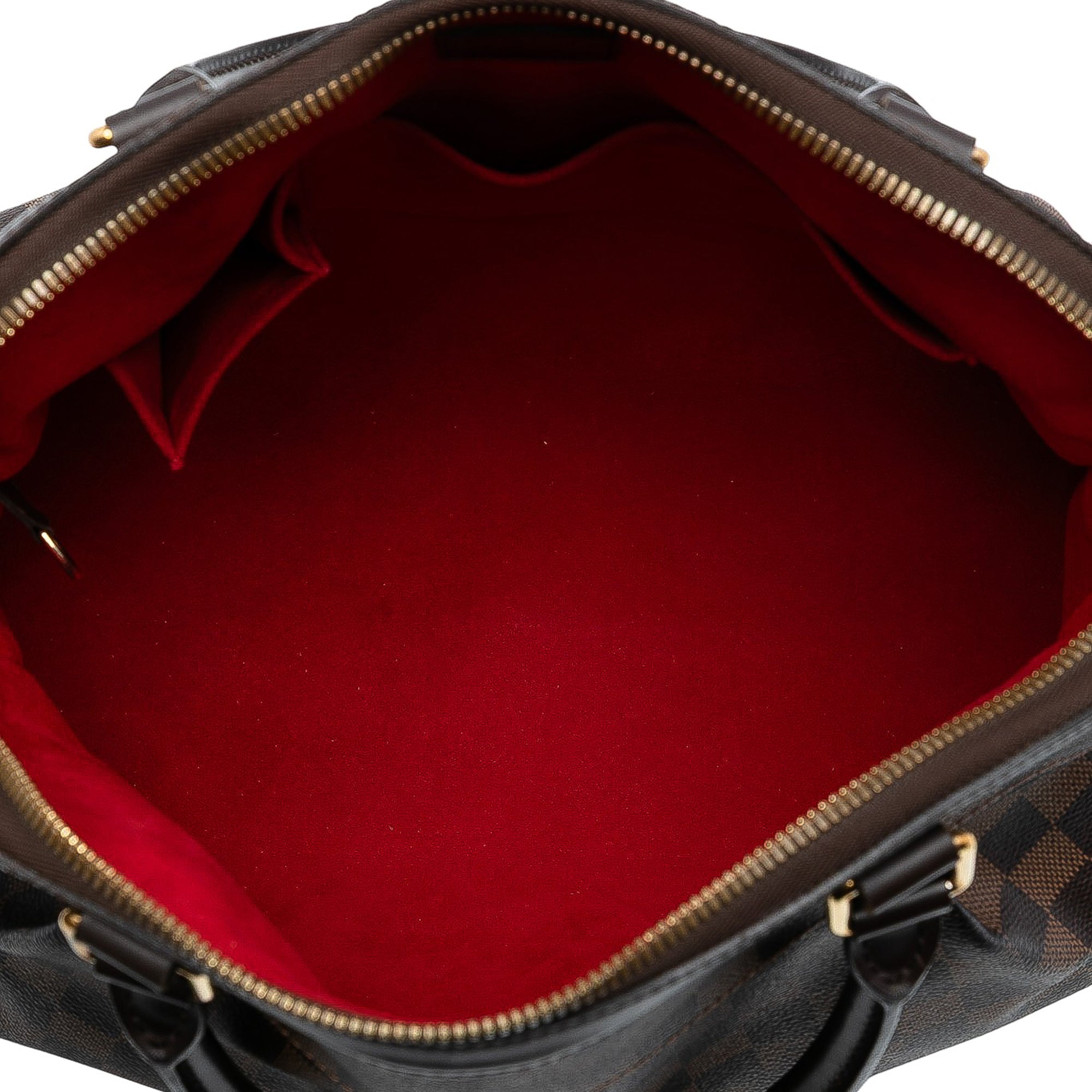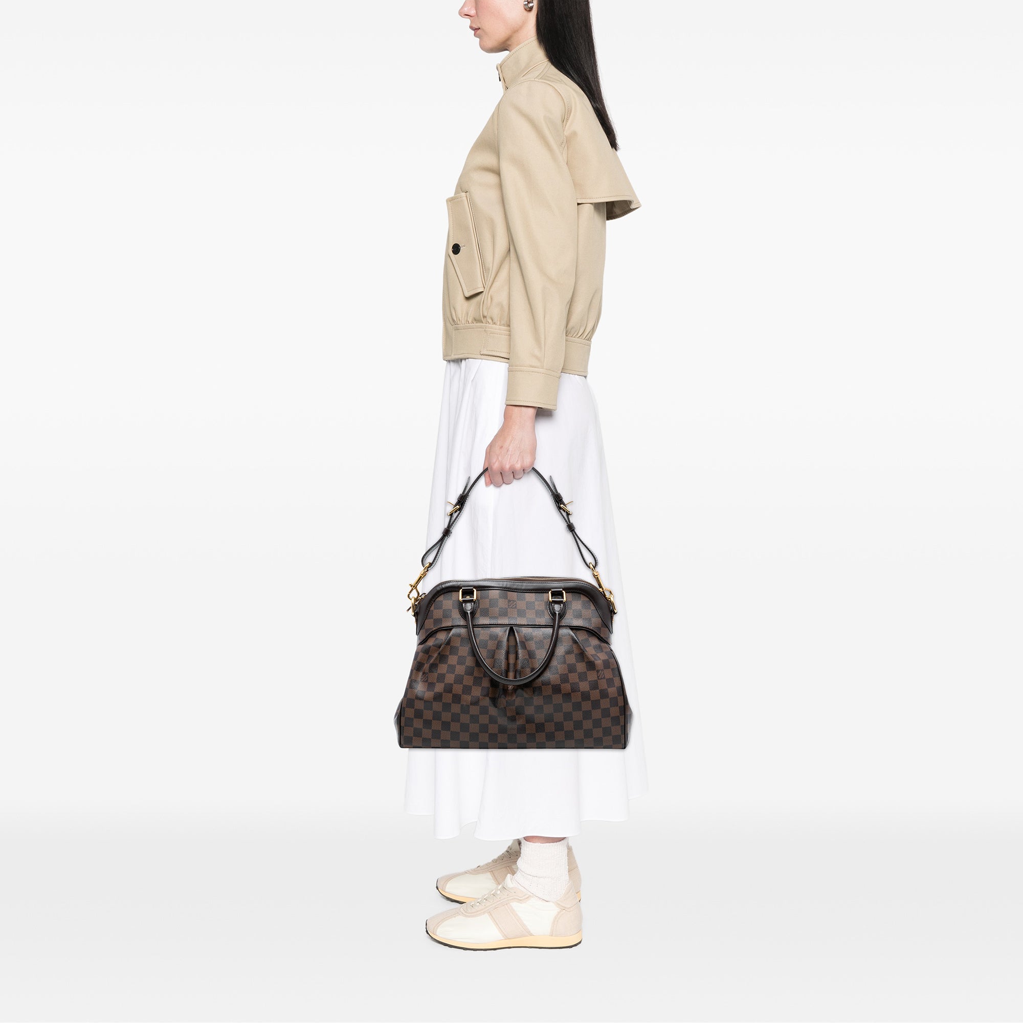 The Trevi features a damier ebene canvas body with leather trim, rolled leather handles, a detachable flat leather shoulder strap, a top zip closure, and interior slip pockets. Retail Price: 2410.00