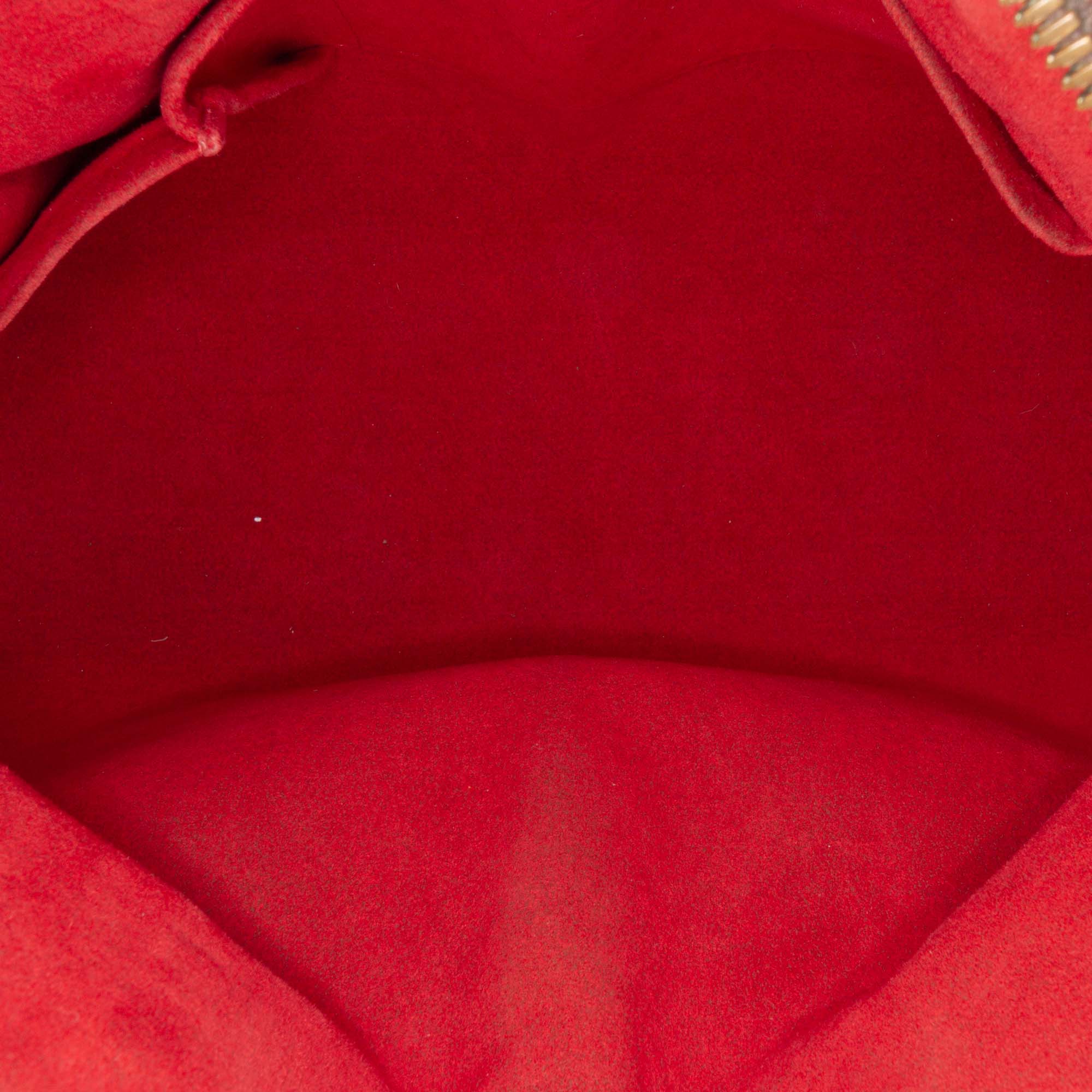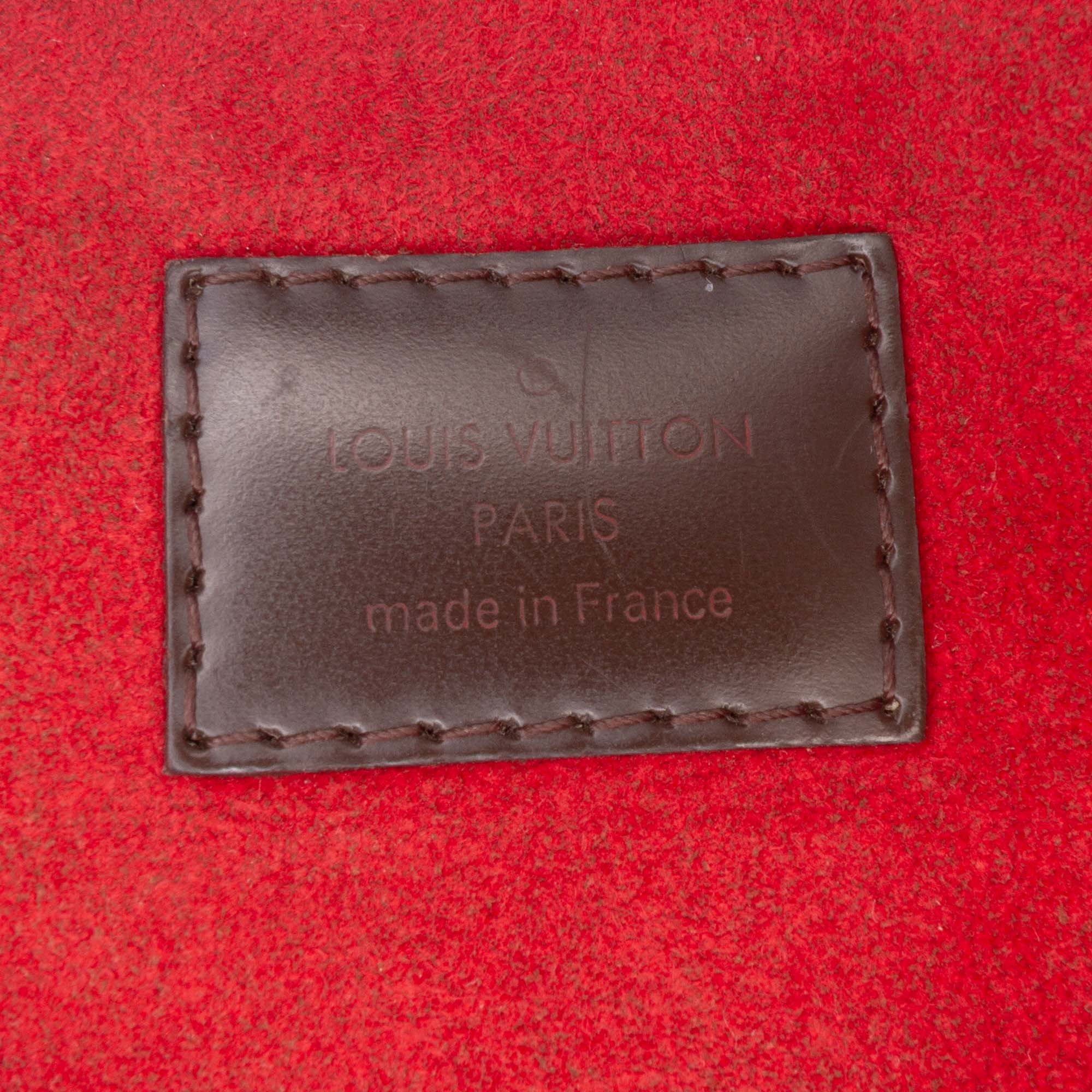 The Trevi features a damier ebene canvas body with leather trim, rolled leather handles, a top zip closure, and interior slip pockets. Retail Price: 2410.00