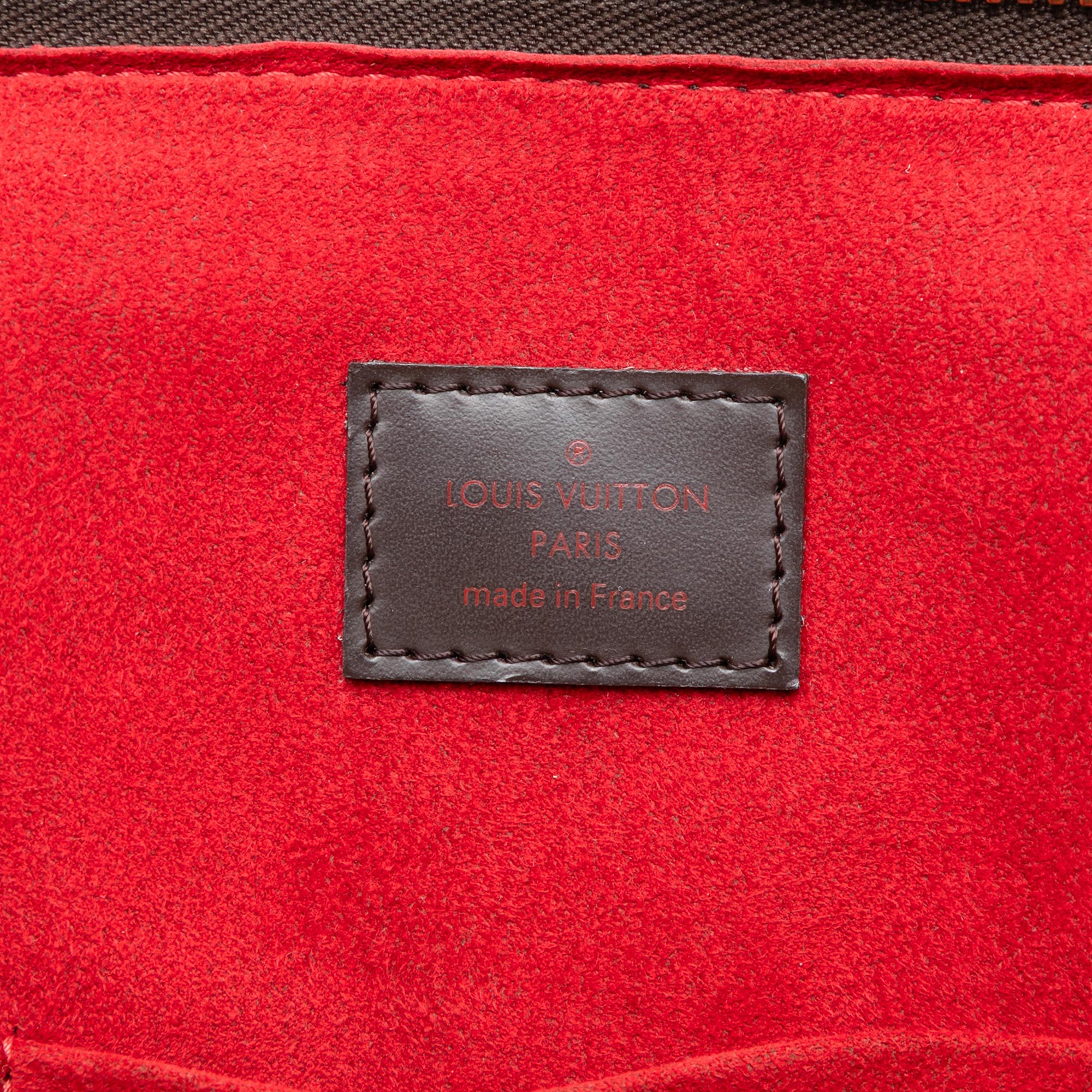The Trevi features a damier ebene canvas body with leather trim, rolled leather handles, a top zip closure, and interior slip pockets. Retail Price: 2410.00