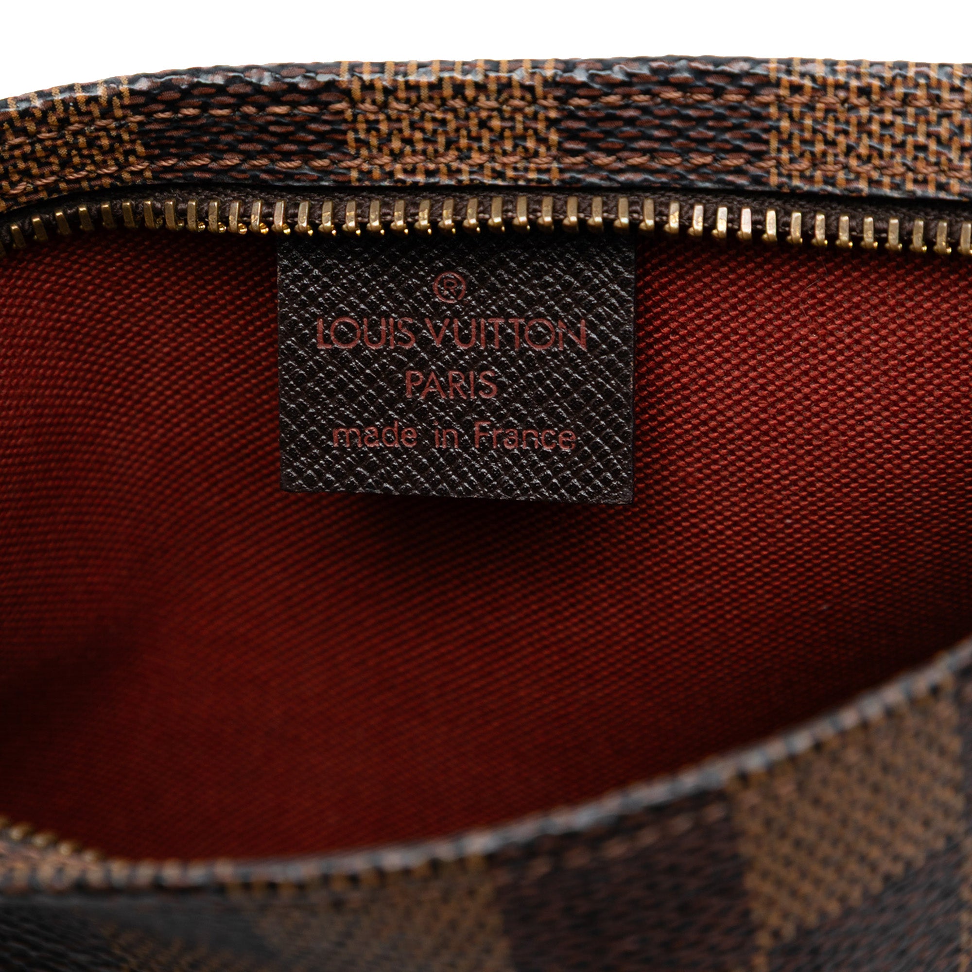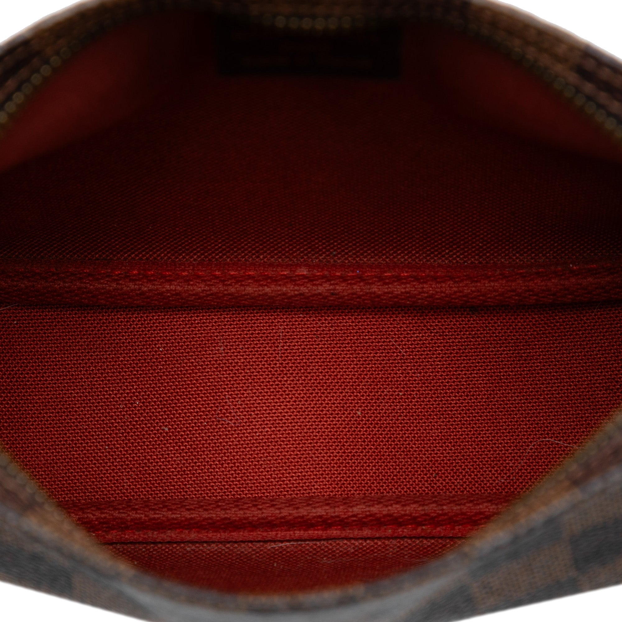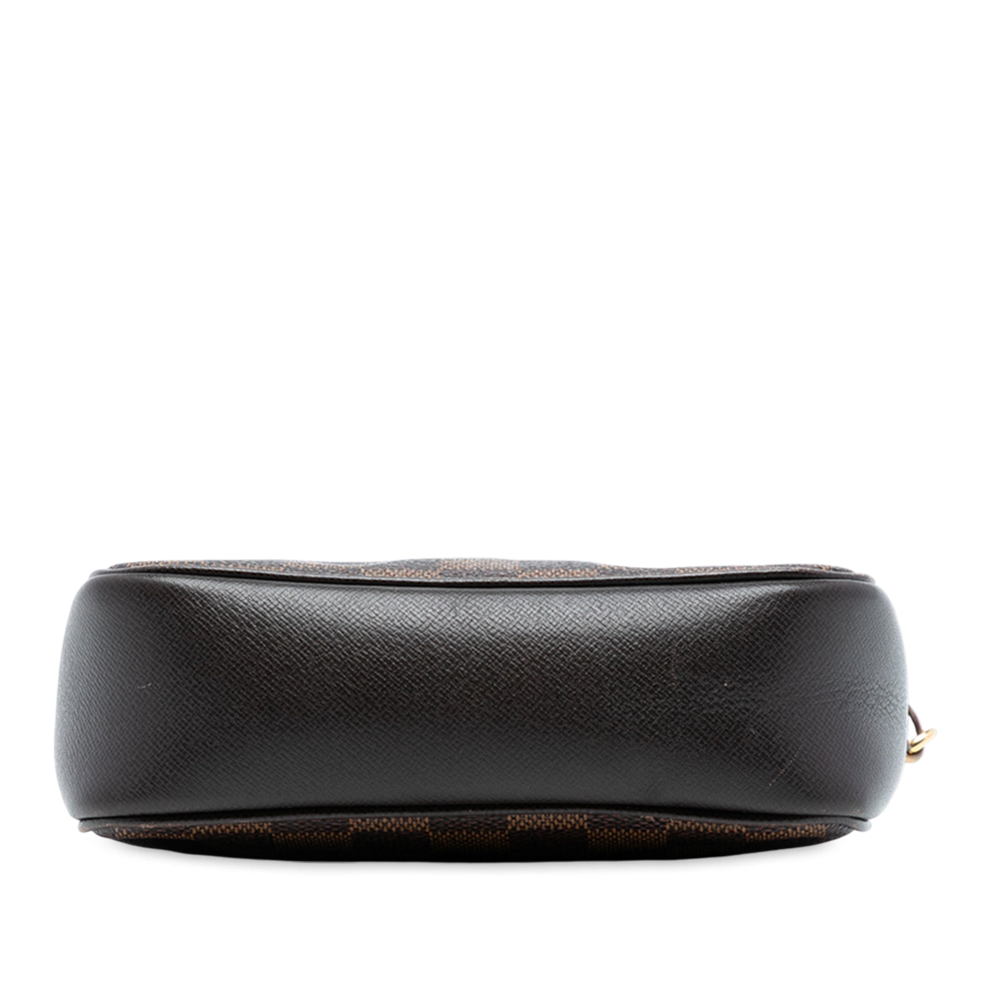The Trousse Pochette features a damier canvas body with leather trim, a flat leather strap, and a top zip closure. Retail Price: 900.00