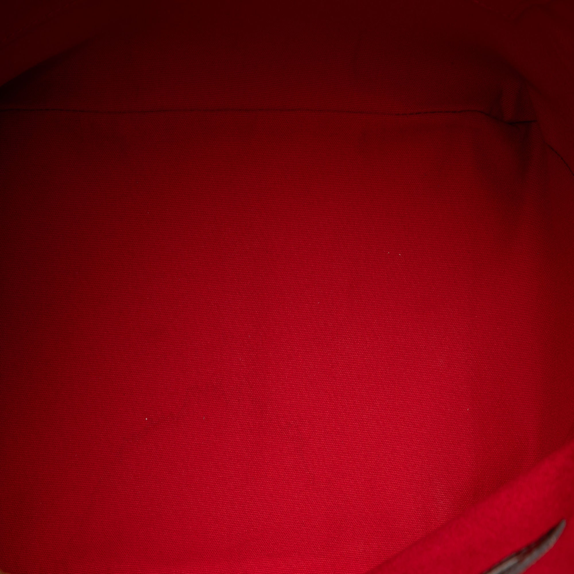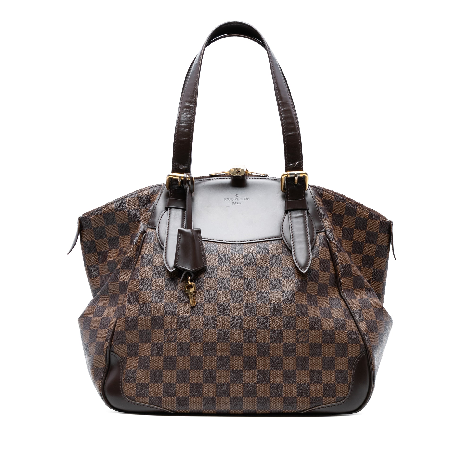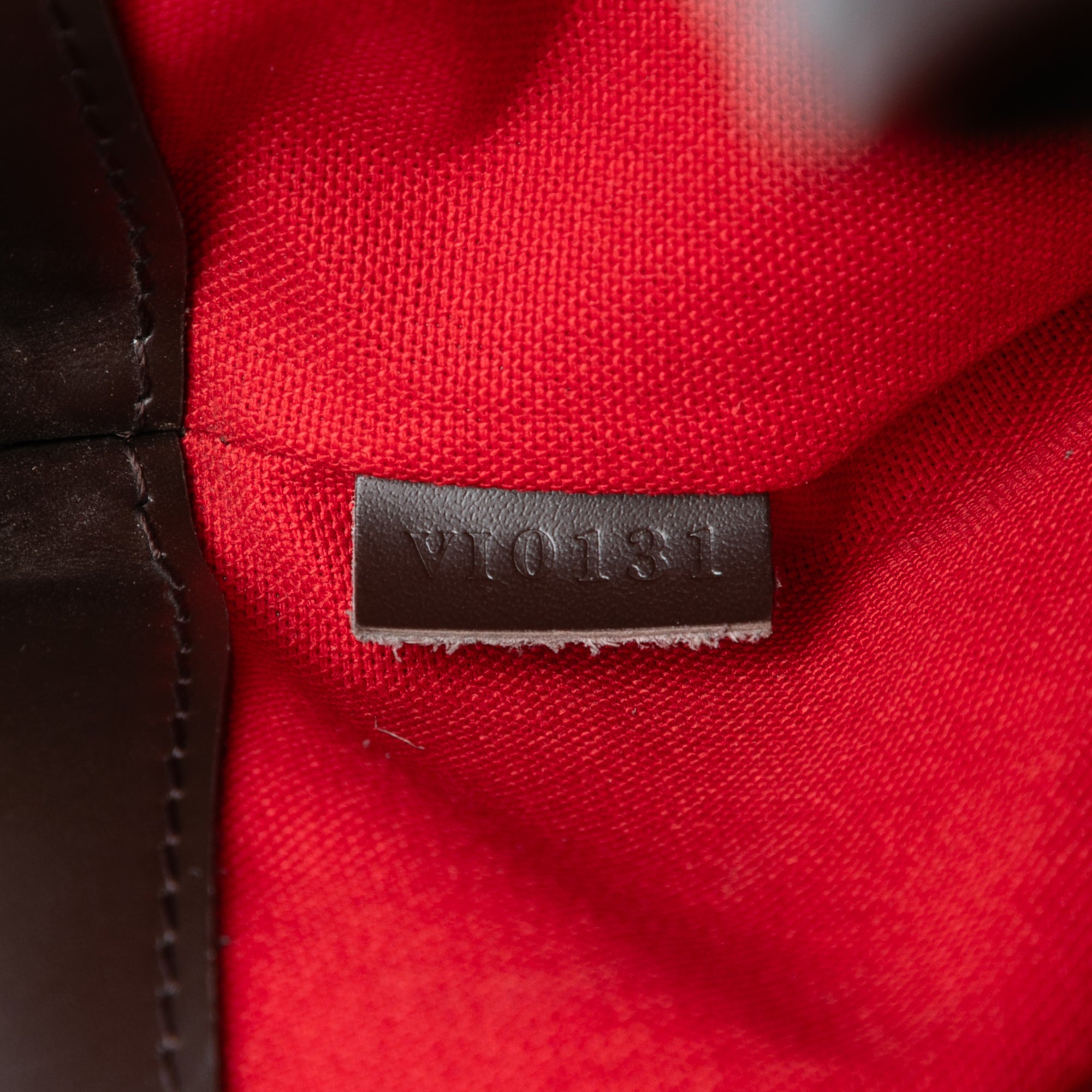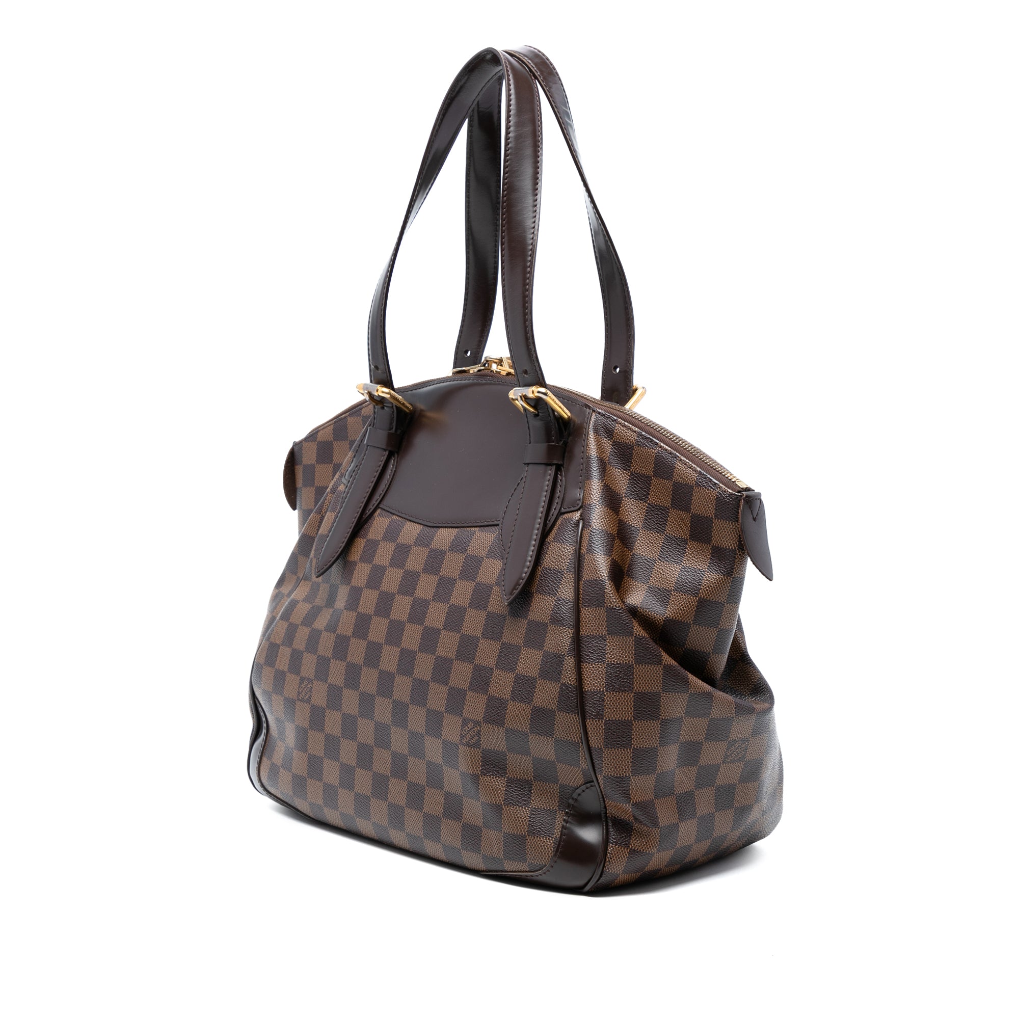 The Verona GM features a damier ebene canvas body with leather trim, flat leather straps, a two-way top zip closure, and interior slip pockets. Retail Price: 1870.00