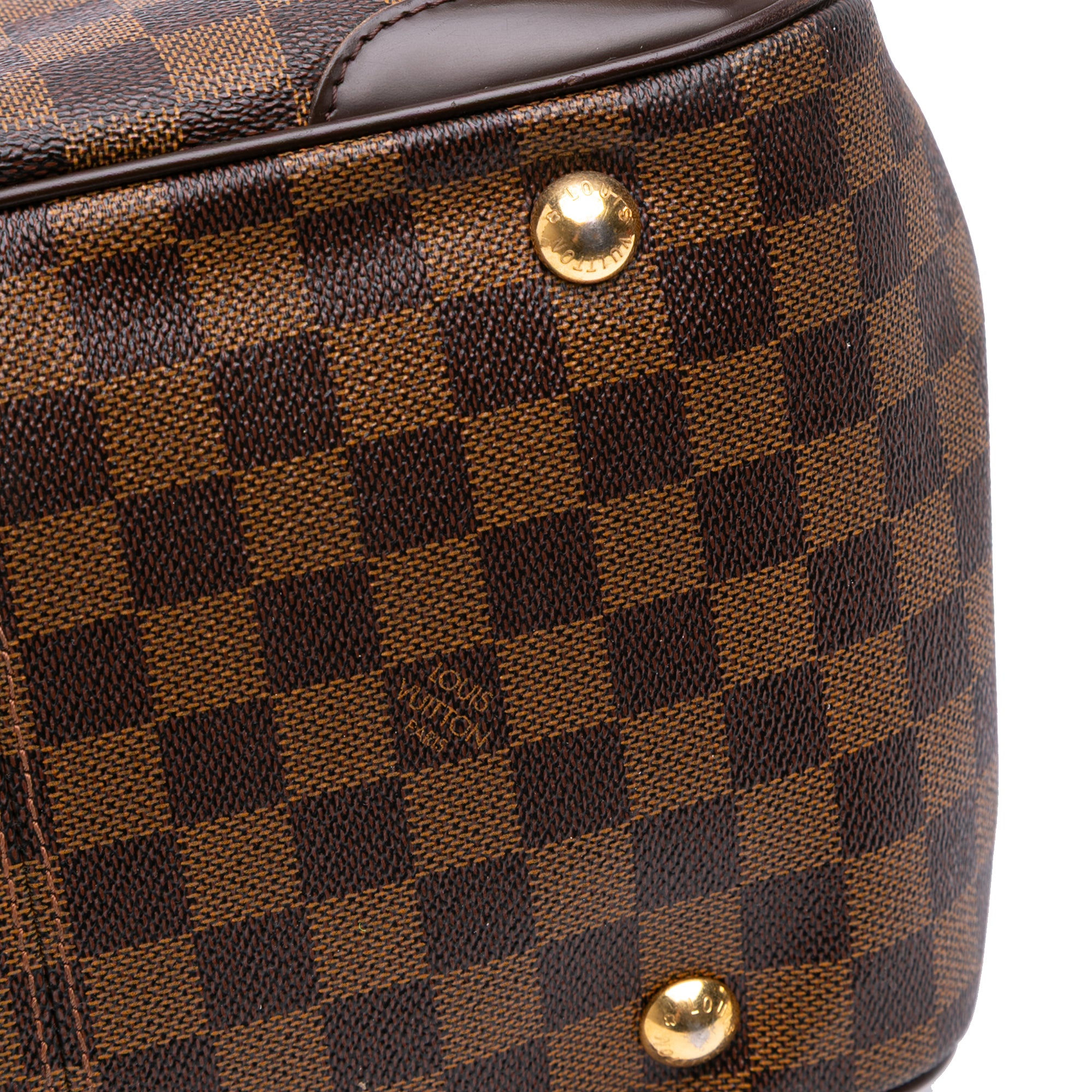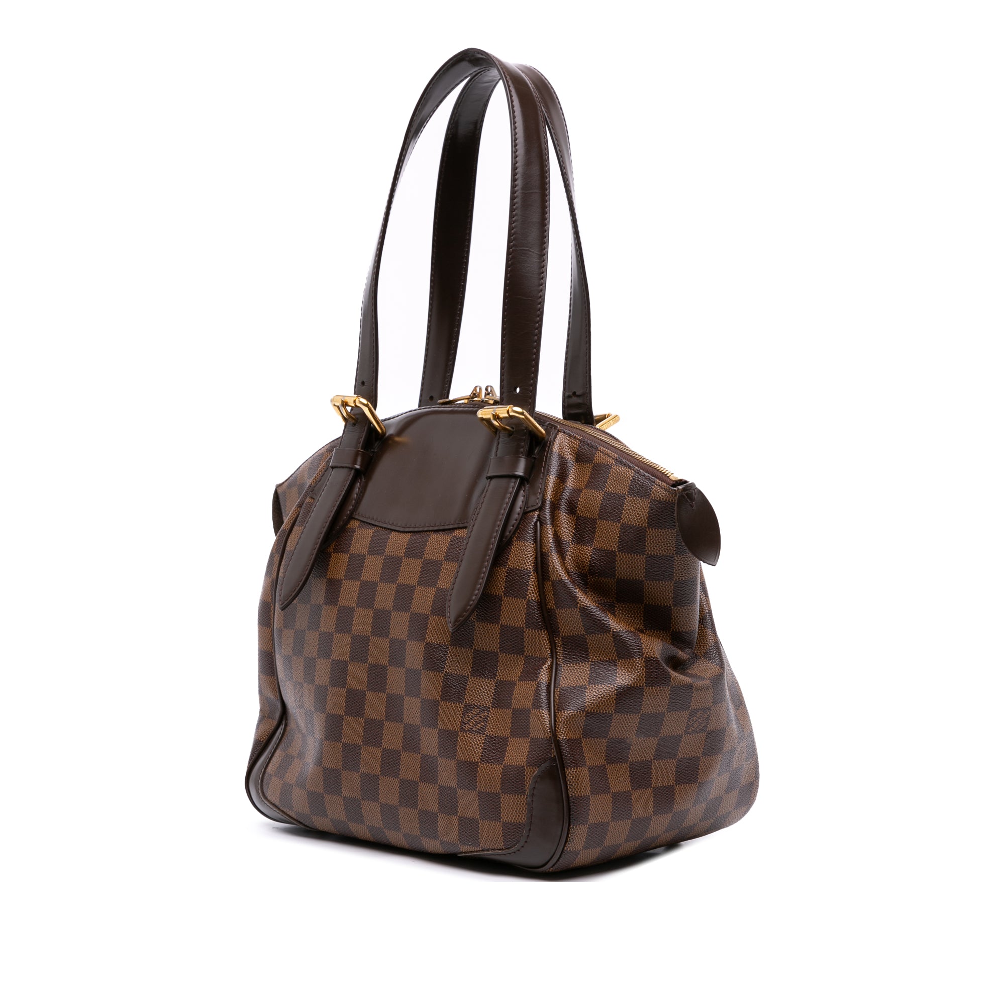 The Verona MM features a damier canvas body with leather trim, flat leather straps, a two-way top zip closure, and interior slip pockets. Retail Price: 1870.00