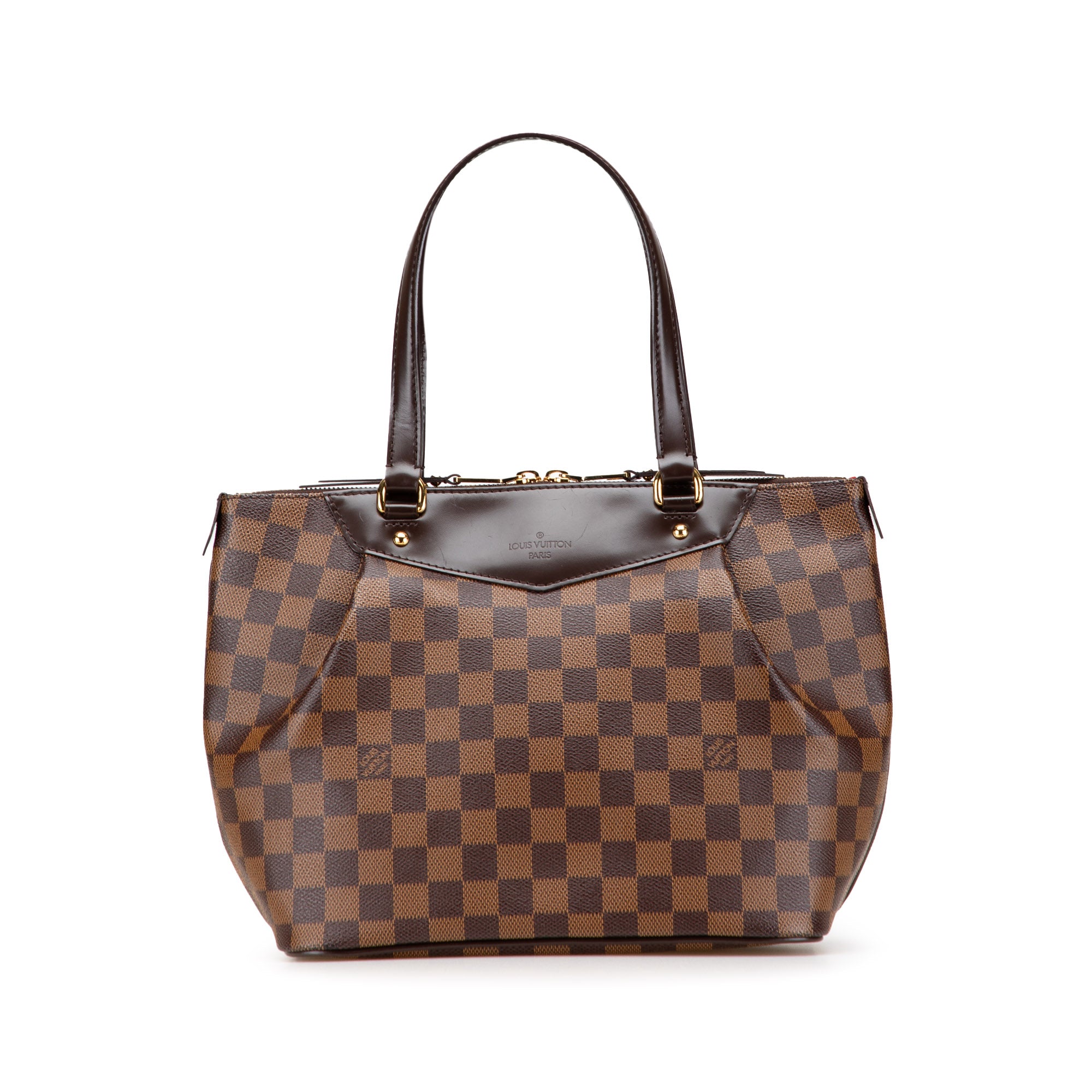 The Westminster features a damier ebene canvas body with leather trim, flat leather straps, a top zip closure, and interior slip pockets. Retail Price: 1650.00