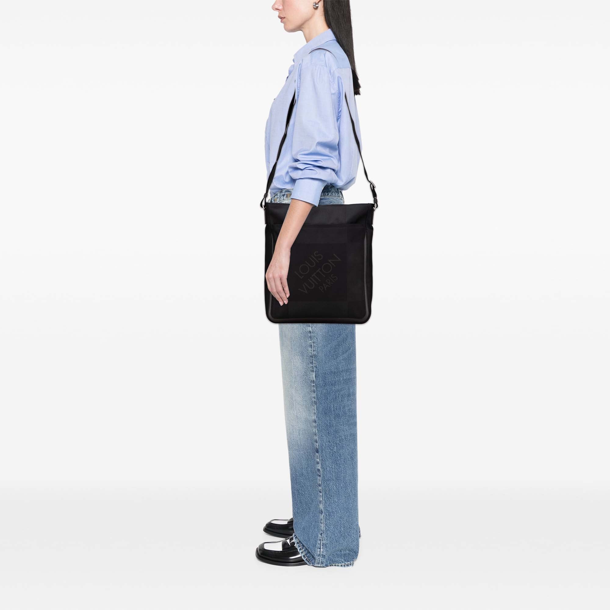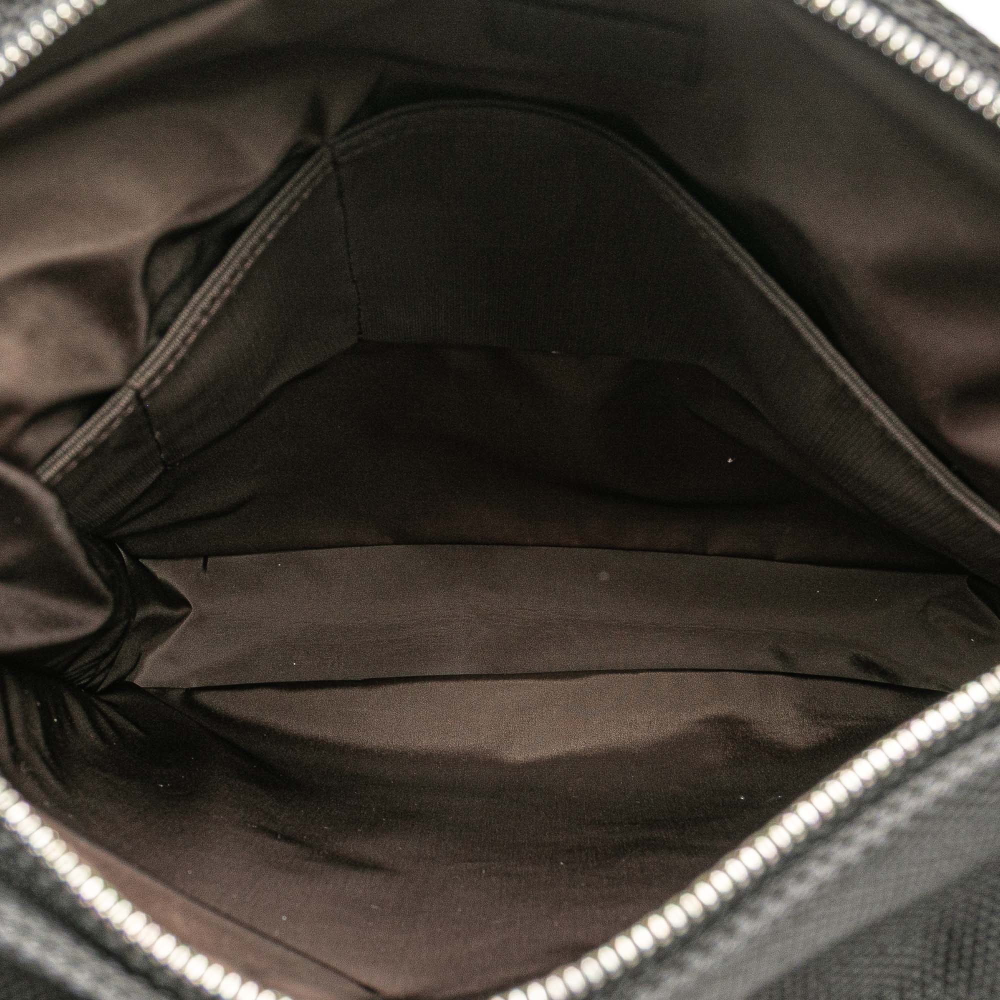 The Compagnon features a damier geant canvas body with leather trim, a flat strap, a top zip closure, exterior zip and slip pockets, and interior slip pockets. Retail Price: 1800.00