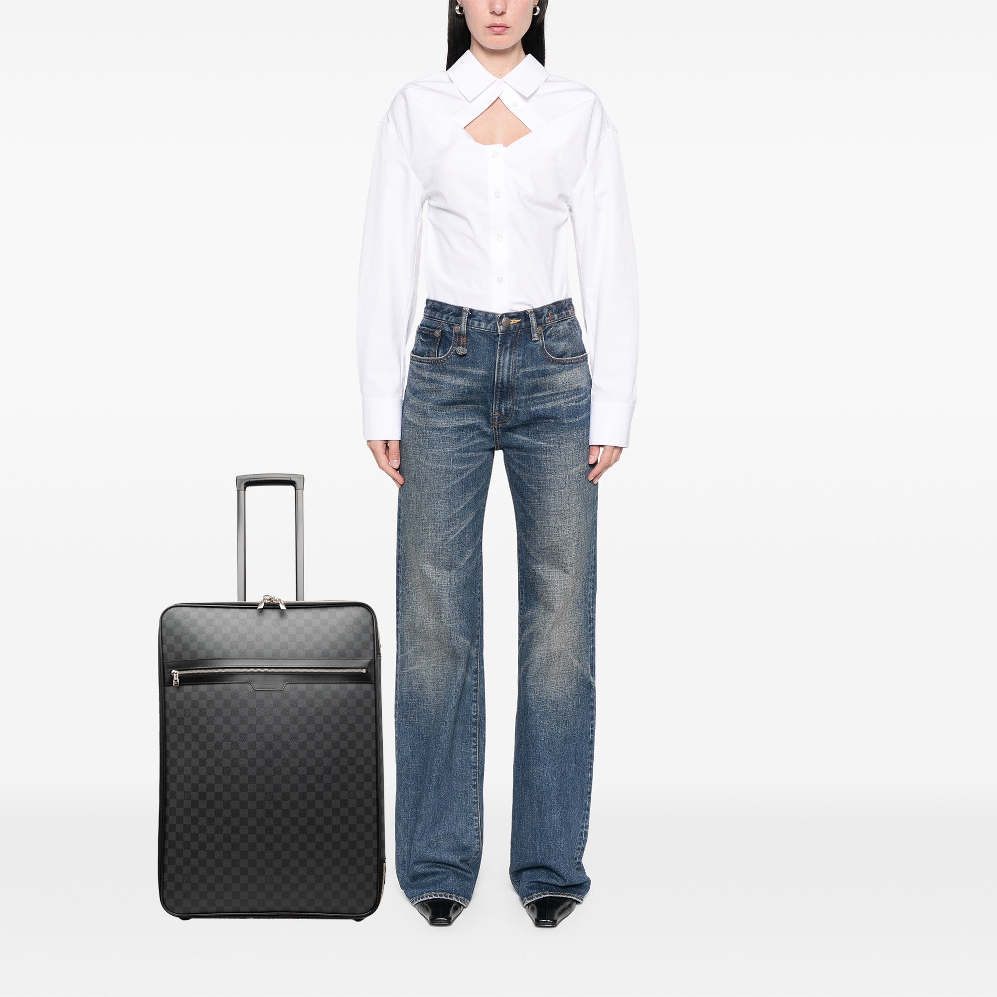 The Pegase 65 features a damier graphite canvas body with leather trim, a flat leather side handle, a retractable top handle, dual wheels, a zip-around closure, an exterior front zip pocket, and interior zip and slip compartments. Retail Price: 4300.00