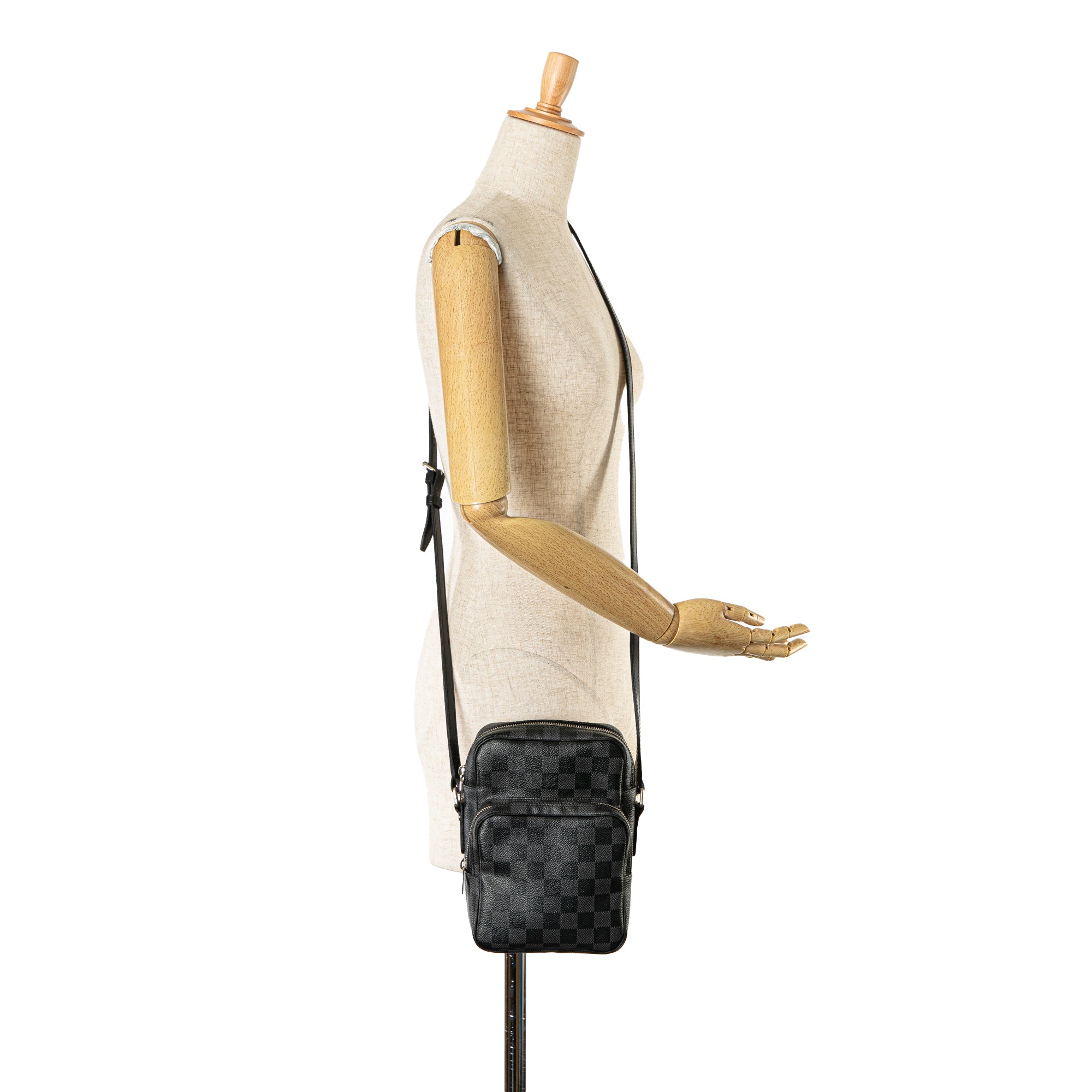 The Rem features a damier graphite canvas body with leather trim, a flat leather strap, a top zip closure, an exterior zip pocket, and interior slip pockets. Retail Price: 1220.00