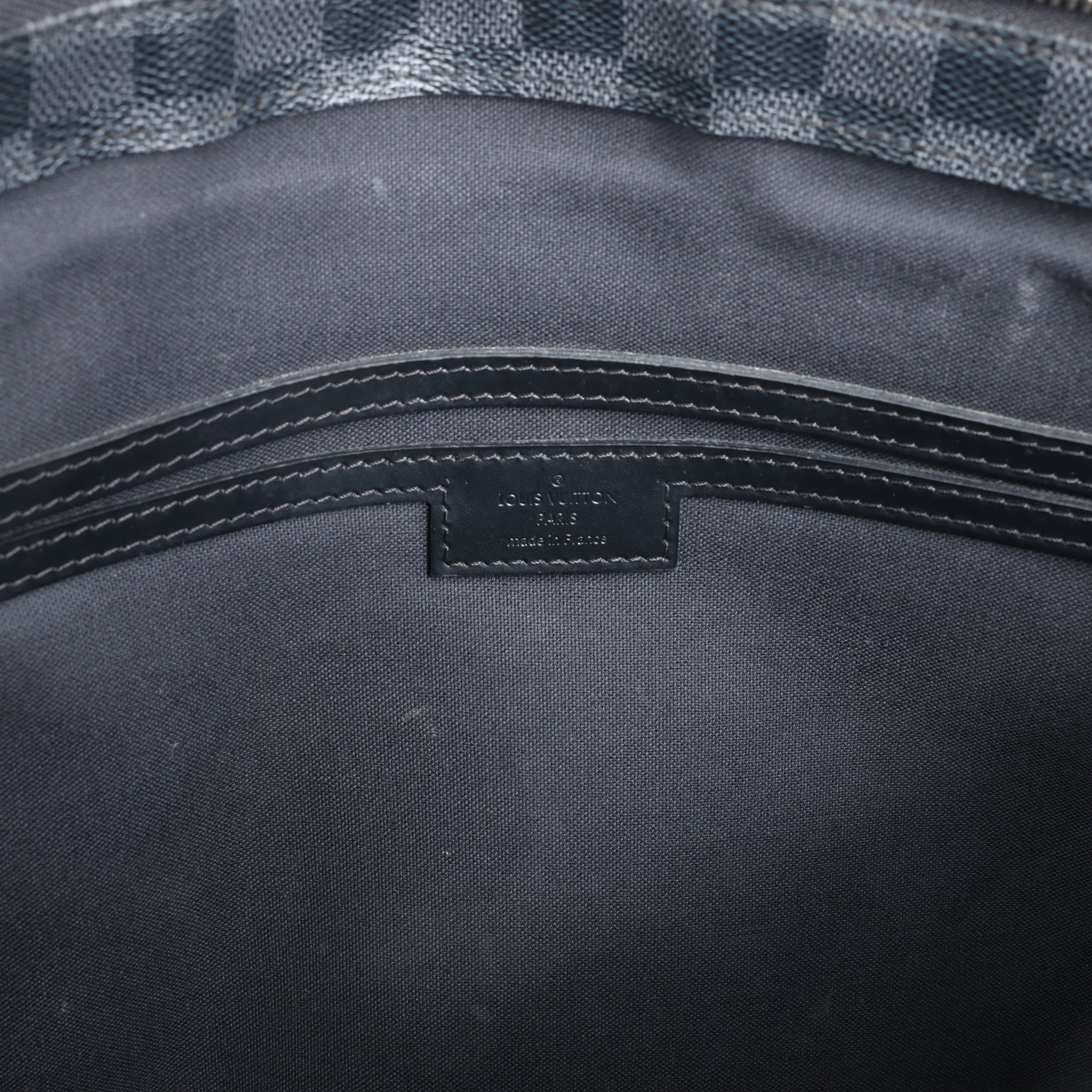 A sleek and versatile tote in Damier Graphite canvas with black leather trim. Features rolled leather handles, adjustable/removable shoulder strap, silver-tone hardware, and a spacious open interior with multiple pockets for organization. Perfect for business or travel.