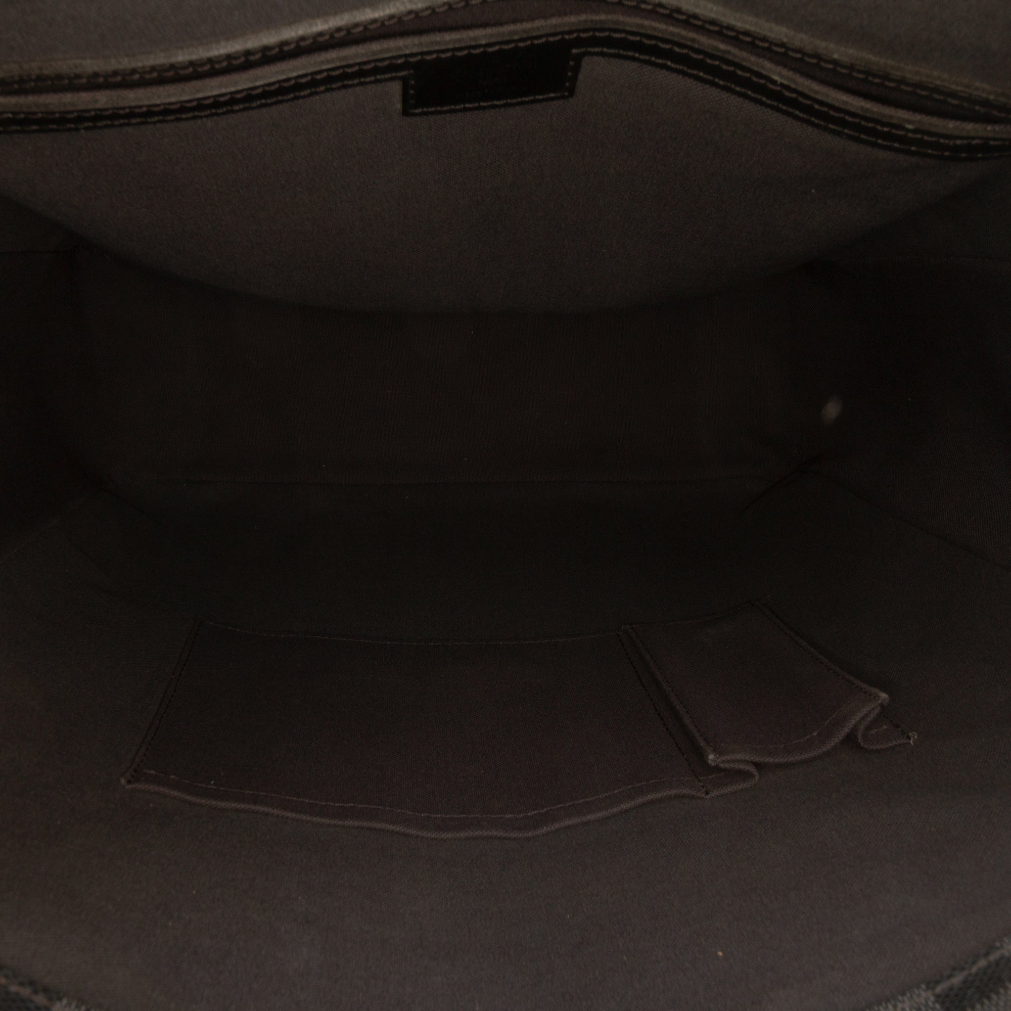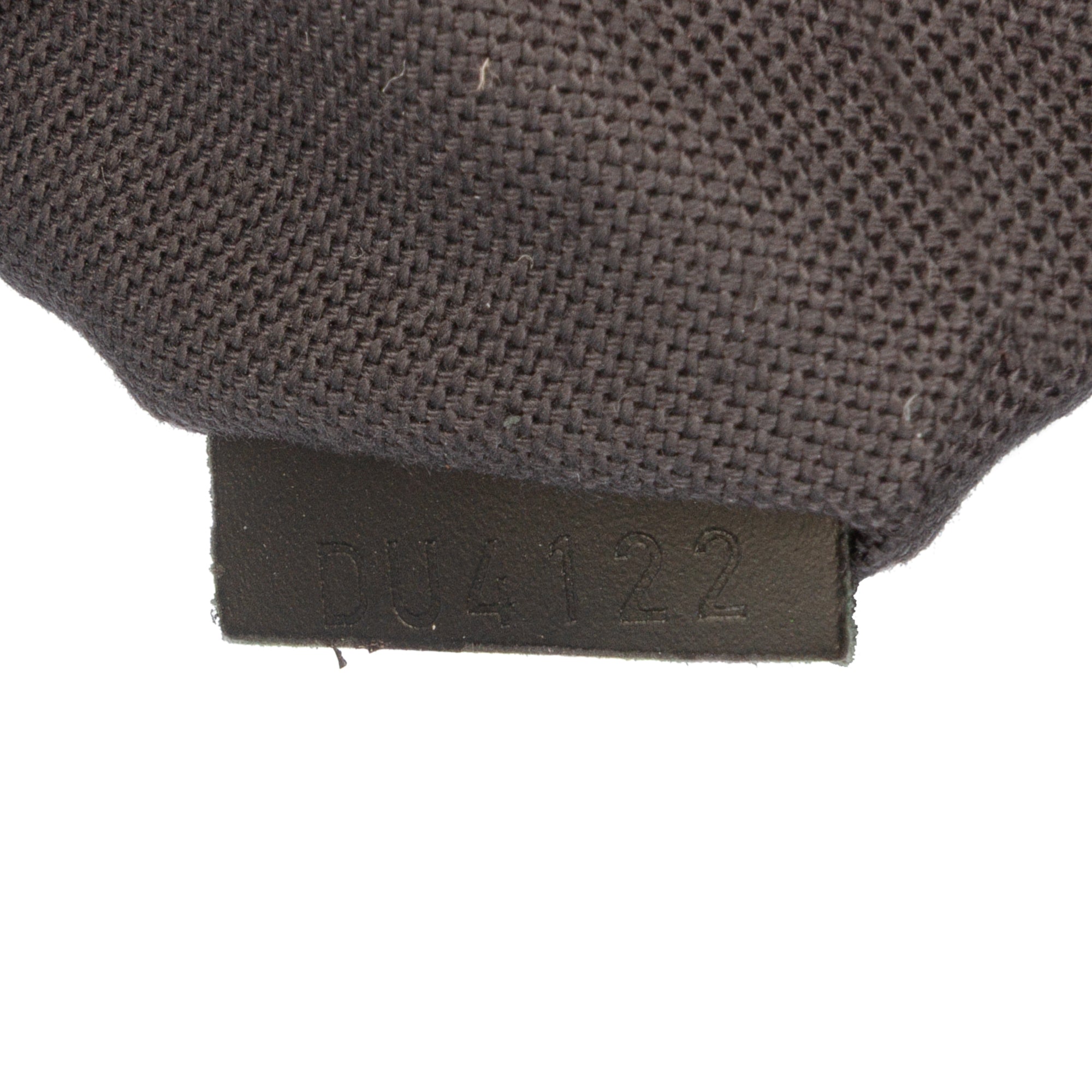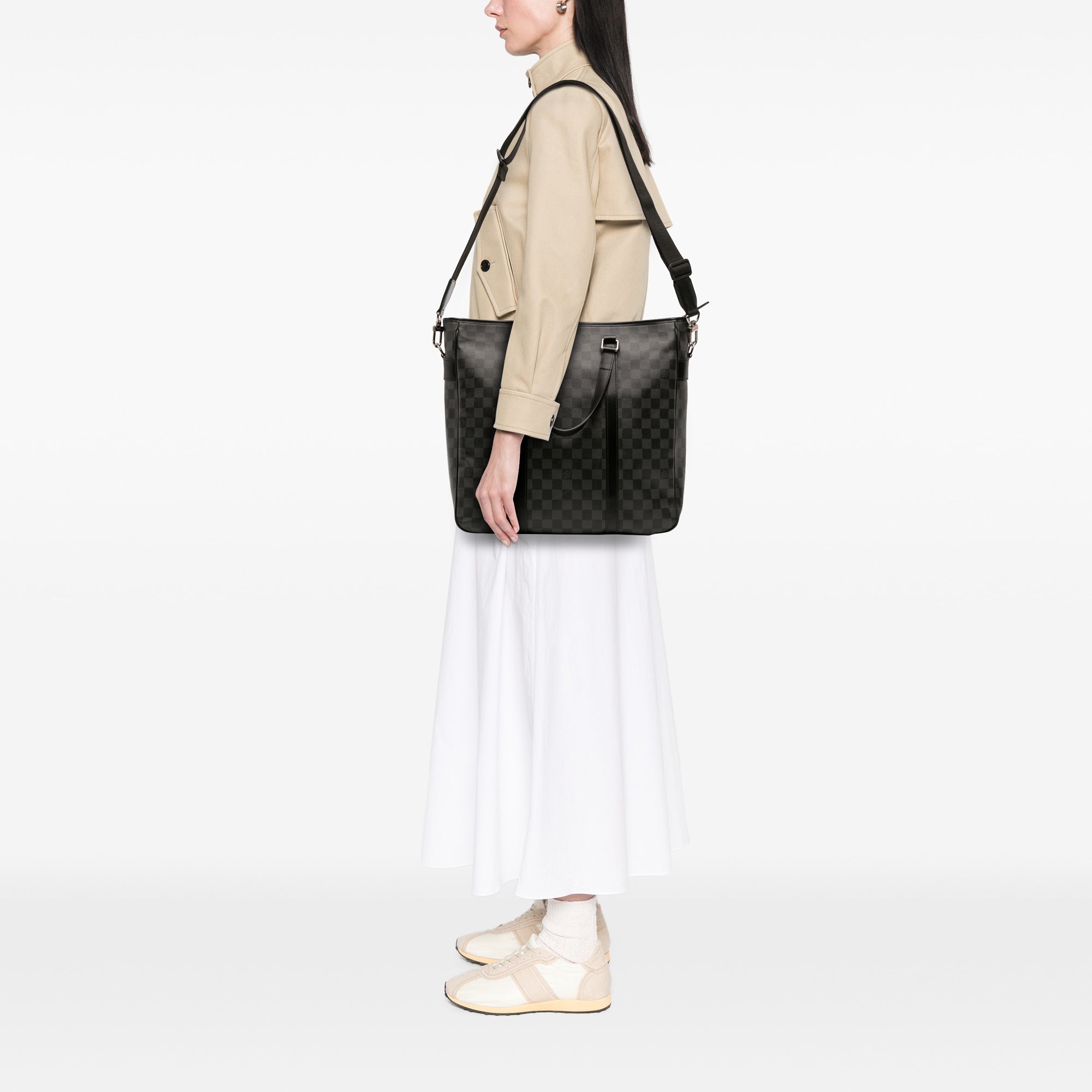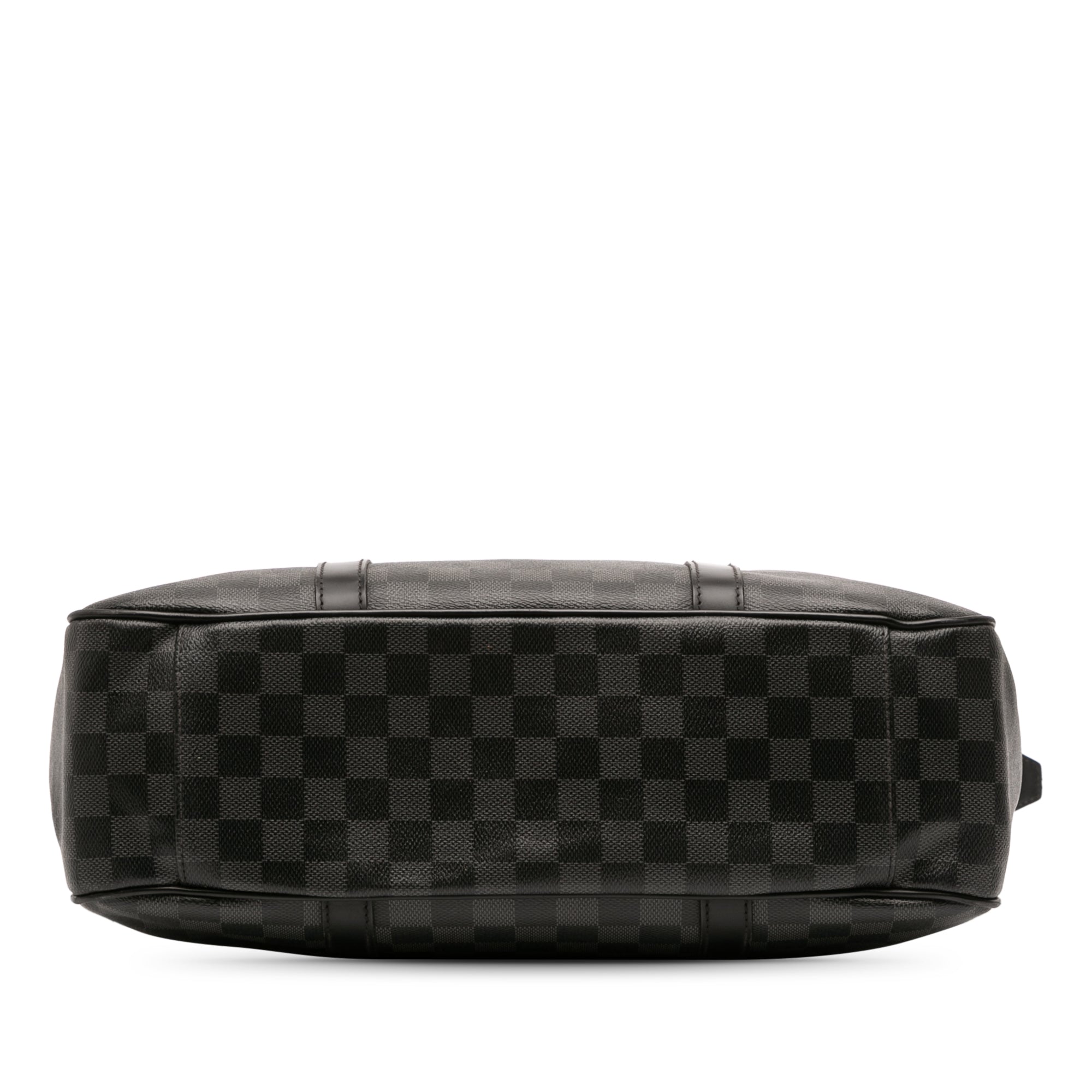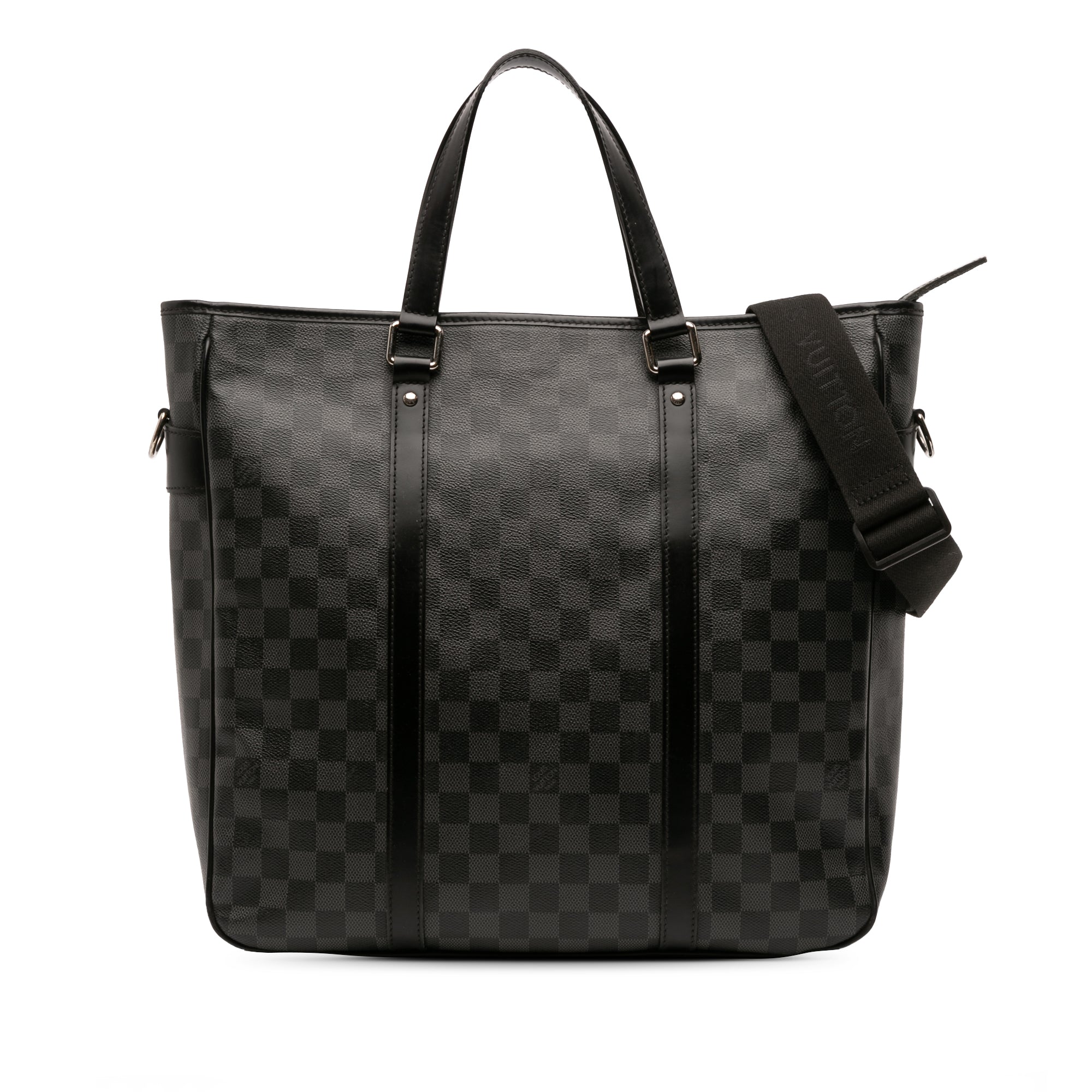 The Tadao PM features a damier graphite body with leather trim, flat leather handles, a detachable flat canvas strap, a top zip closure, and interior slip pockets. Retail Price: 1780.00