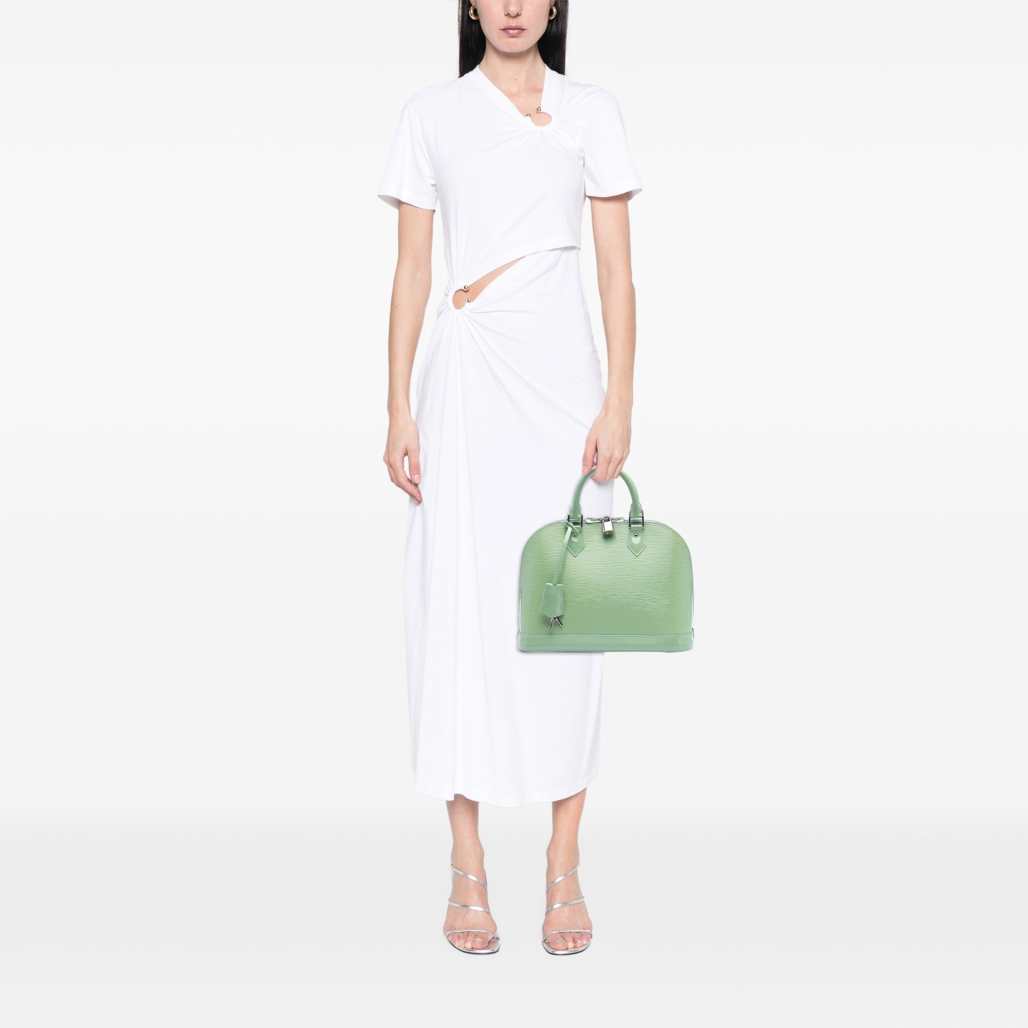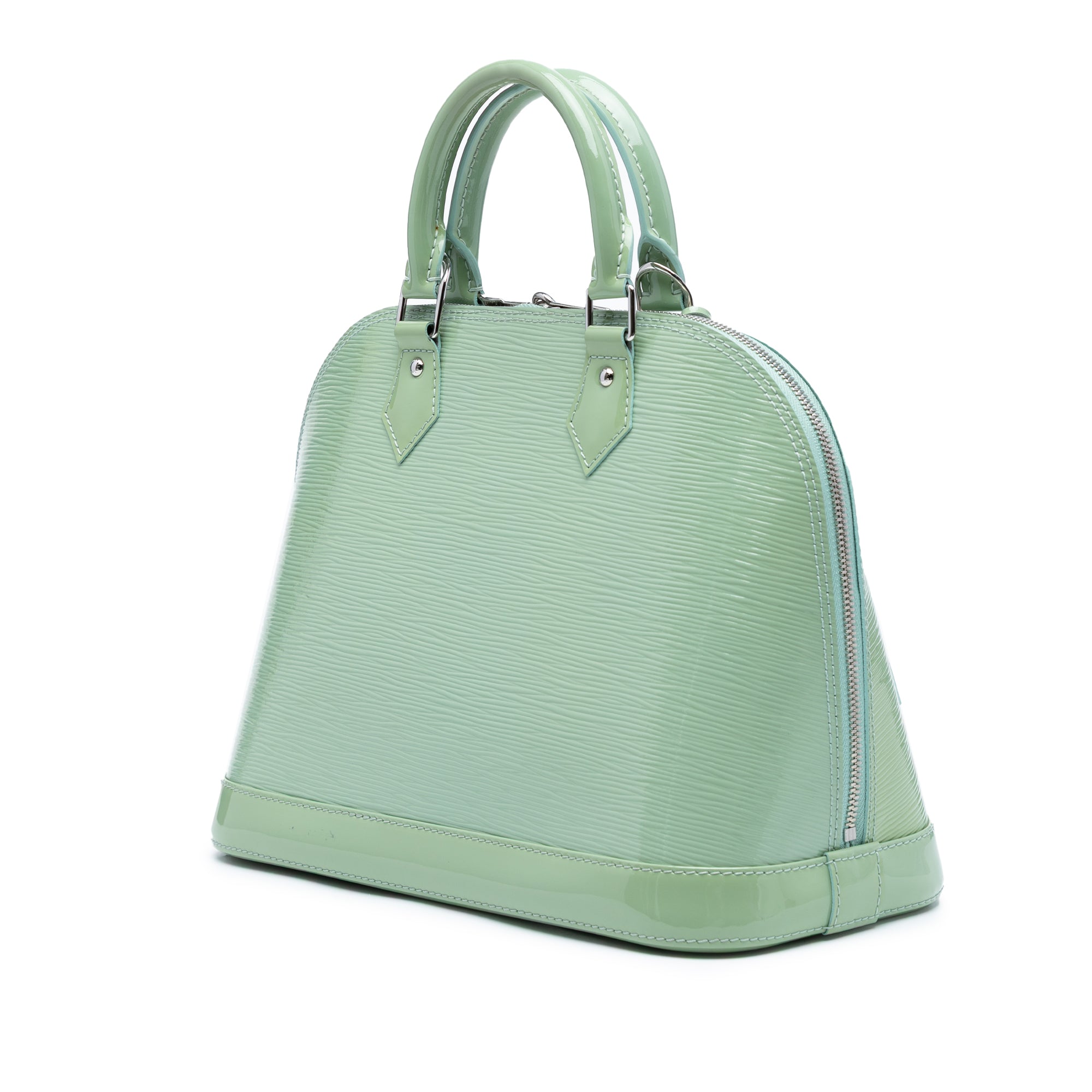 The Alma features an electric epi leather body, rolled leather handles, a clochette, a top zip closure, and interior slip pockets. Retail Price: 2350.00