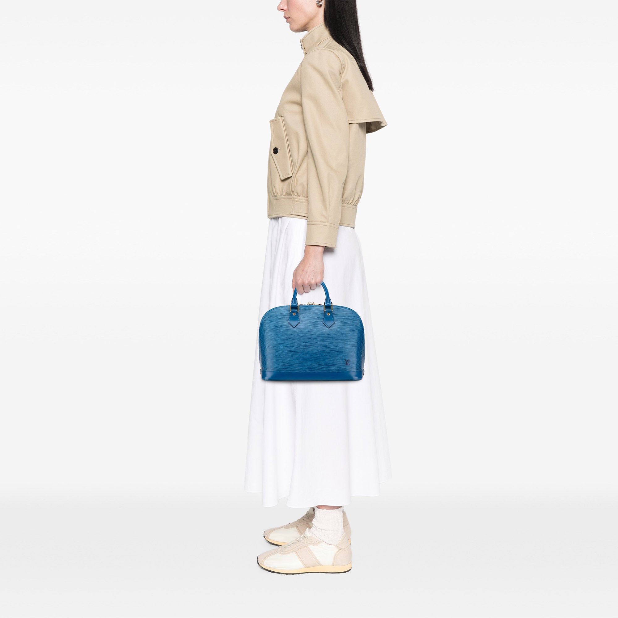 The Alma PM features an epi leather body, rolled leather handles, a top zip closure, and an interior slip pocket. Retail Price: 2200.00
